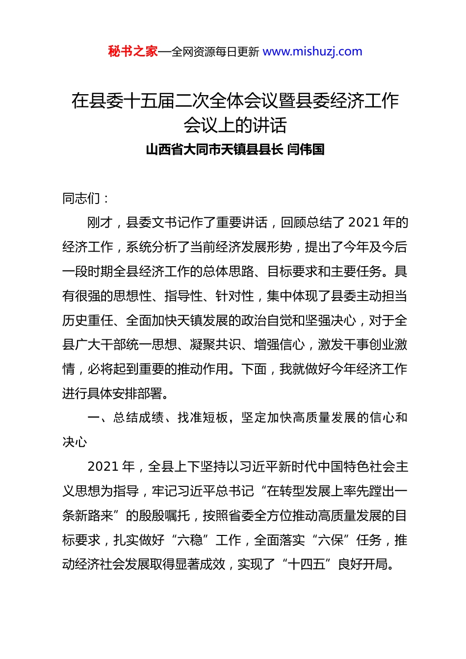 秘书之家—全网资源每日更新 www.mishuzj.com在县委十五届二次全体会议暨县委经济工作会议上的讲话山西省大同市天镇县县长 闫伟国同志们:刚才,县委文书记作了重要讲话,回顾总结了 2021 年的经济工作,系统分析了当前经济发展形势,提出了今年及今后一段时期全县经济工作的总体思路、目标要求和主要任务。具有很强的思想性、指导性、针对性,集中体现了县委主动担当历史重任、全面加快天镇发展的政治自觉和坚强决心,对于全县广大干部统一思想、凝聚共识、增强信心,激发干事创业激情,必将起到重要的推动作用。下面,我就做好今年经济工作进行具体安排部署。一、总结成绩、找准短板,坚定加快高质量发展的信心和决心2021 年,全县上下坚持以习近平新时代中国特色社会主义思想为指导,牢记习近平总书记“在转型发展上率先蹚出一条新路来”的殷殷嘱托,按照省委全方位推动高质量发展的目标要求,扎实做好“六稳”工作,全面落实“六保”任务,推动经济社会发展取得显著成效,实现了“十四五”良好开局。秘书之家—全网资源每日更新 www.mishuzj.com一是乡村大振兴,脱贫成果更加巩固。守牢防返贫底线,精准锁定“三类户”,及时给予政策帮扶。易迁后续扶持持续发力,万家乐食品加工园、恒宗茶艺园稳步推进,“一城三园”框架效果初显。引进银行、电子商务、大型超市,商铺出租运营率达到 85%,进一步增强了商贸业态活力。坚持“特优”战略,实施有机旱作农业 6 万亩、设施蔬菜基地 1.8 万亩,黄花采摘 233.7 万斤,新发展药材种植 1500 亩,引导龙头企业延链补链强链,推进农产品出口精深加工,带动出口创汇 4000 万元;畜牧业占据农业半壁江山,全县猪、牛、羊、鸡饲养量分别达到 25.5 万头、4.2 万头、53 万只、36 万只。落实最严格的耕地保护制度,坚决制止耕地“非农化”“非粮化”,建设高标准农田 2.5 万亩,集约化育苗场 1.1万平方米;全县农作物播种面积 72.15 万亩,粮食产量4.14 亿斤,守住了粮食安全底线。二是产业大发展,经济业态更加丰富。强化项目引领,全年实施 55 个重点项目,总投资 89.3 亿元,已完成 20.52亿元;东瑞红酒谷项目有序推进,正方利民装配式建筑产业园和山地阳光年产 3 万吨罐装茶饮料项目建成投产。强化能源支撑,山西国际能源、国华等 5 个 31.9 万千瓦已核准开工建设,凯迪 3 万千瓦生物质发电项目稳步推进,地热资源勘查与开发秘书之家—全网资源每日更新 www.mishuzj.com利用省级重点实验室挂牌。强化融合发展,积极与京东、苏宁、832 扶贫电商平台对接 31 种农副产品推送上线,网络销售农副产品 3400 万元,电商交易额达 1.54 亿元。强化提质增效,新增规上工业企业4户,完成 71 家国有企业改制工作。强化招商引资,引进中国电建、中物集团等大型企业,发展后劲更加充沛。三是文化大繁荣,文旅基础更加夯实。稳步推进李二口长城博物馆、闫秀峰故居、摄影书画家驿站等一批工程,提升了文旅品质;在长城一号旅游沿线薛三墩、白羊口、水磨口等 9个村实施风貌管控和产业布局,重点打造长城文旅经济带。成功举办李二口长城文化旅游节、“五一”李二口乡村游活动、“校园公益星文化之旅”、“乡约天镇·礼赞丰收”系列活动,李二口长城景区被确定为国家 4A 级旅游景区,打响了李二口长城文旅品牌。四是民生大保障,人民福祉更加殷实。累计接种新冠疫苗28 . 3 万 剂 次 , 检 查 出 入 境 车 辆 19 . 52 万 辆 次 、 人 员45.79 万人次,投入疫情防控资金 1428.26 万元,筑牢了疫情防控屏障;全年教育各类投入 3.11 亿元,一中、安家皂等 40 所中小学新建改造工程竣工,招聘教师 78 人,高考二本以上达线人数 651 人,达线率 51%,600 分以上 19 人,全市秘书之家—全网资源每日更新 www.mishuzj.com中考状元落户天镇,教育改革初见成效;城乡居民医疗保险、养老保险参保分别达到 17.59 万人、12.43 万人,应保尽保、应纳尽纳;政府过紧日子,拿出专款 5590.76 万元,保障退役军人和改制企业职工权益,维护社会稳定。...