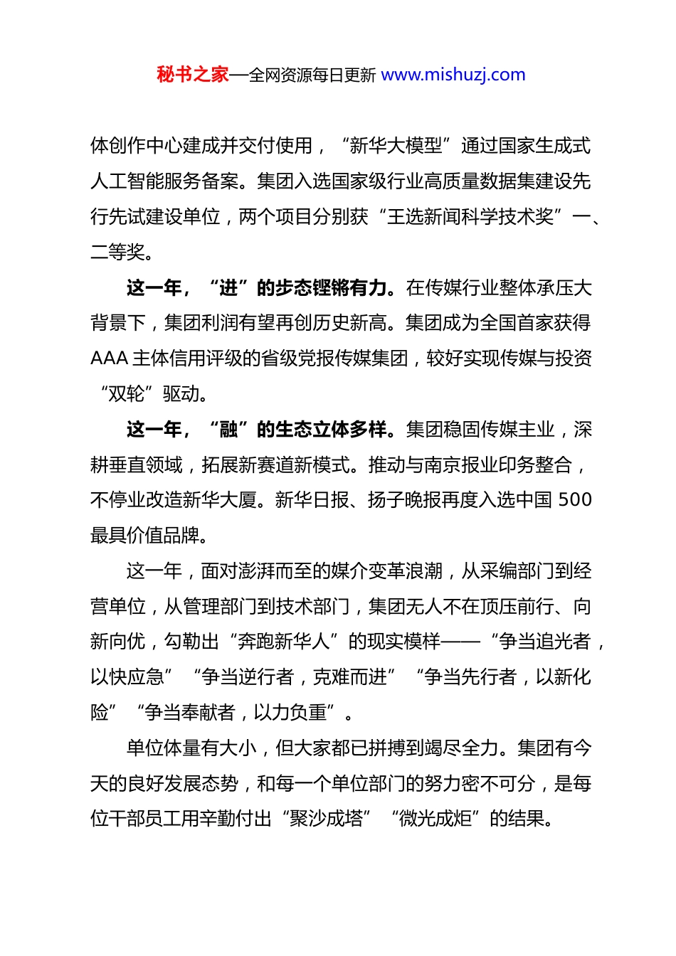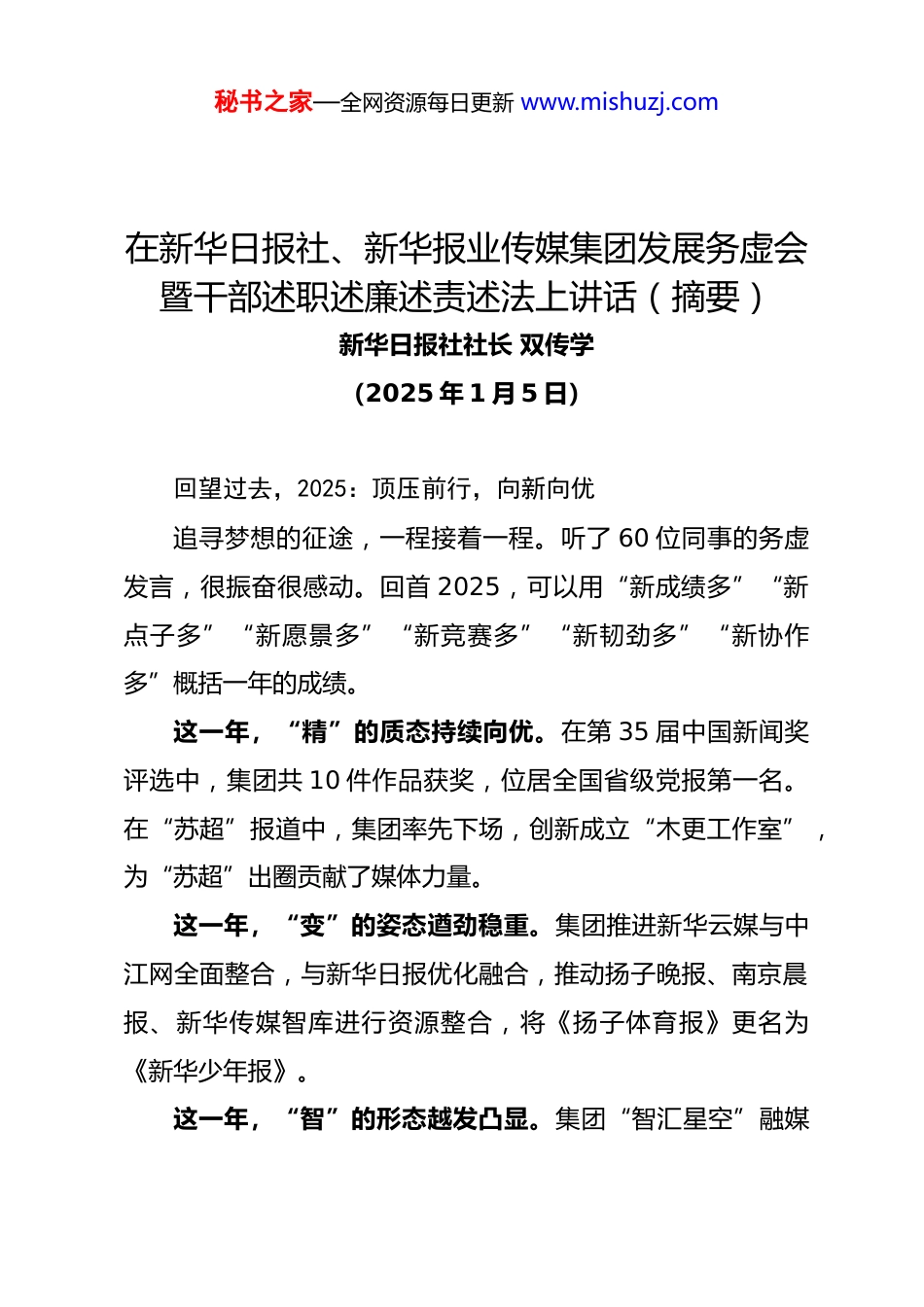 秘书之家—全网资源每日更新 www.mishuzj.com在新华日报社、新华报业传媒集团发展务虚会暨干部述职述廉述责述法上讲话(摘要)新华日报社社长 双传学(2025 年 1 月 5 日)回望过去,2025:顶压前行,向新向优追寻梦想的征途,一程接着一程。听了 60 位同事的务虚发言,很振奋很感动。回首 2025,可以用“新成绩多”“新点子多”“新愿景多”“新竞赛多”“新韧劲多”“新协作多”概括一年的成绩。这一年,“精”的质态持续向优。在第 35 届中国新闻奖评选中,集团共 10 件作品获奖,位居全国省级党报第一名。在“苏超”报道中,集团率先下场,创新成立“木更工作室”,为“苏超”出圈贡献了媒体力量。这一年,“变”的姿态遒劲稳重。集团推进新华云媒与中江网全面整合,与新华日报优化融合,推动扬子晚报、南京晨报、新华传媒智库进行资源整合,将《扬子体育报》更名为《新华少年报》。这一年,“智”的形态越发凸显。集团“智汇星空”融媒秘书之家—全网资源每日更新 www.mishuzj.com体创作中心建成并交付使用,“新华大模型”通过国家生成式人工智能服务备案。集团入选国家级行业高质量数据集建设先行先试建设单位,两个项目分别获“王选新闻科学技术奖”一、二等奖。这一年,“进”的步态铿锵有力。在传媒行业整体承压大背景下,集团利润有望再创历史新高。集团成为全国首家获得AAA 主体信用评级的省级党报传媒集团,较好实现传媒与投资“双轮”驱动。这一年,“融”的生态立体多样。集团稳固传媒主业,深耕垂直领域,拓展新赛道新模式。推动与南京报业印务整合,不停业改造新华大厦。新华日报、扬子晚报再度入选中国 500最具价值品牌。这一年,面对澎湃而至的媒介变革浪潮,从采编部门到经营单位,从管理部门到技术部门,集团无人不在顶压前行、向新向优,勾勒出“奔跑新华人”的现实模样——“争当追光者,以快应急”“争当逆行者,克难而进”“争当先行者,以新化险”“争当奉献者,以力负重”。单位体量有大小,但大家都已拼搏到竭尽全力。集团有今天的良好发展态势,和每一个单位部门的努力密不可分,是每位干部员工用辛勤付出“聚沙成塔”“微光成炬”的结果。秘书之家—全网资源每日更新 www.mishuzj.com总结过去,四个经验:知所从来,方知所往总结经验、把握规律,是集团传承多年的好传统,也是“新华铁军”克难制胜的利器。回顾过去一年,有一些经验值得总结和思考。一是“做好自己的事最重要”。国内发展机遇与挑战并存,风险困难随时都有。其实,从集团到每个单位部门,只要把自己的事做好,就能“风雨不动安如山”,面对这些情况,关键是“把自己的事情解决好”,要有“集中精力办好自己的事”的战略定力。二是“只要思想不滑坡,办法总比困难多”。“拿破仑说过,世界上有两种力量,利剑和思想,利剑总是败在思想之下。”一个干部员工的思想反映了他的思考方法和层次,反映了他的胸襟格局,反映了他能否用全面、辩证、联系的观点看问题,反映了他是否善于用学习成果赋能工作提升。“新华人”身上最可贵的一点是懂得“成就集团就是成就自己”,时时为集团利益着想、为集团荣誉而战,这种宝贵精神值得保护和发扬。三是“一把手很重要、很珍贵”。兵熊熊一个,将熊熊一窝,一家单位精气神怎么样,关键看一把手。集团高度重视一把手的选聘,坚持唯才是举、选贤任能、公平公正。集团绝大秘书之家—全网资源每日更新 www.mishuzj.com多数单位部门一把手能力、品质、敬业精神都较好,这是集团取得可观成绩的关键因子。四是“上下同欲者胜,风雨同舟者兴”。这次务虚会上,不少单位部门负责人‘晒’出自己的团队小伙伴,这让人很温暖、很高兴。心往一处想、劲往一处使,团队就有战无不胜的可能。对于团队管理者而言,能吃苦能吃亏,凡事皆可为;能干事能共事,才能成大事。锚定未来,2026:以“强基拓新”引领“十五五”起步开局从‘十四五’开局的 2021 年到集团百年党报愿景实现的2038 年,一共 17 年时间,可以将其比作一场长跑。“十四五”时期的五年,是集团的“起步跑”,大家跑得很踏实。从“十五五”时期开始,集团进入“途中跑”阶段,...