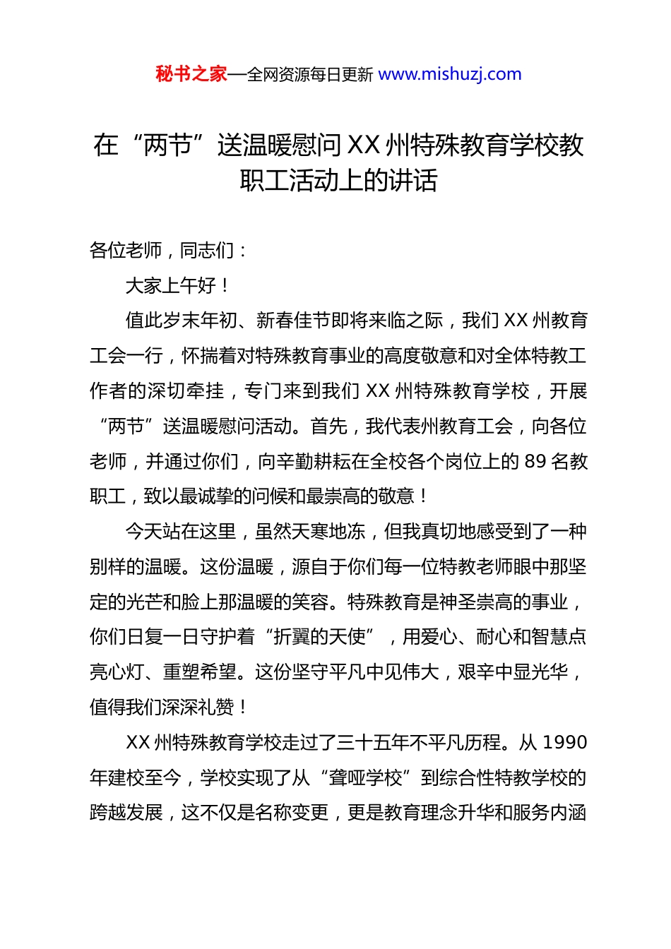 秘书之家—全网资源每日更新 www.mishuzj.com在“两节”送温暖慰问 XX 州特殊教育学校教职工活动上的讲话各位老师,同志们:大家上午好!值此岁末年初、新春佳节即将来临之际,我们 XX 州教育工会一行,怀揣着对特殊教育事业的高度敬意和对全体特教工作者的深切牵挂,专门来到我们 XX 州特殊教育学校,开展“两节”送温暖慰问活动。首先,我代表州教育工会,向各位老师,并通过你们,向辛勤耕耘在全校各个岗位上的 89 名教职工,致以最诚挚的问候和最崇高的敬意!今天站在这里,虽然天寒地冻,但我真切地感受到了一种别样的温暖。这份温暖,源自于你们每一位特教老师眼中那坚定的光芒和脸上那温暖的笑容。特殊教育是神圣崇高的事业,你们日复一日守护着“折翼的天使”,用爱心、耐心和智慧点亮心灯、重塑希望。这份坚守平凡中见伟大,艰辛中显光华,值得我们深深礼赞!XX 州特殊教育学校走过了三十五年不平凡历程。从 1990年建校至今,学校实现了从“聋哑学校”到综合性特教学校的跨越发展,这不仅是名称变更,更是教育理念升华和服务内涵秘书之家—全网资源每日更新 www.mishuzj.com拓展。作为全州特教主阵地,学校承载着无数家庭期盼和社会重托。在自治州党委、人民政府高度重视下,学校办学条件显著改善,现代化教学设施为孩子们成长提供了坚实保障。但比硬件更宝贵的,是你们这支优秀教师队伍。70 名教职工中党员作用突出,涌现出特级教师、天山英才等众多骨干。面对 144名特殊学生,你们因人施教、精准康复,从基础训练到技能培养,每一步都倾注心血。你们不仅是老师,更是孩子生活的照料者、心灵的守护者。这种“以生命影响生命”的教育,是教育本质最动人的体现。学校先后荣获“全国特殊教育先进学校”等多项荣誉 ,2024 年成立全疆唯一孤独症教育康复中心,这些成绩凝聚着全体教职工的智慧汗水。作为教职工的“娘家人”,州教育工会深知特教工作的特殊性与艰巨性。今天我们带来的慰问品虽轻,却承载着组织的关怀与感谢,既是对过往付出的肯定,更是对未来工作的期许。借此机会我也提几点希望:一要继续坚守初心,担当特教使命。以更强责任感守护每个孩子受教育的权利。二要持续提升专业素养。紧跟特教发展前沿,探索康教融合新模式,提高教育康复实效。三要永葆仁爱之心。用真诚关爱温暖每个孩子,尊重差异,促进成长。四要注重身心健康。学会自我调节,保秘书之家—全网资源每日更新 www.mishuzj.com持积极状态,学校工会也要为大家减压赋能。各位老师、同志们,你们是教育战线的特殊尖兵,用大爱点亮特殊儿童的世界,温暖无数家庭,为社会增添文明底色。XX 州教育工会将一如既往支持特教发展,为特教教师营造更好环境。最后,在马年春节即将到来之际,衷心祝愿大家身体健康工作顺利、阖家幸福!祝愿 XX 州特殊教育学校桃李芬芳,再谱华章!谢谢大家!