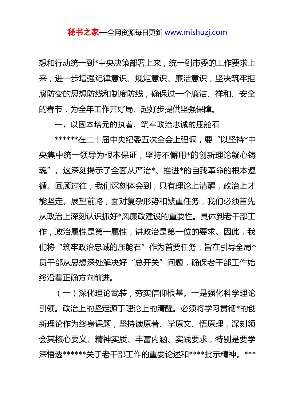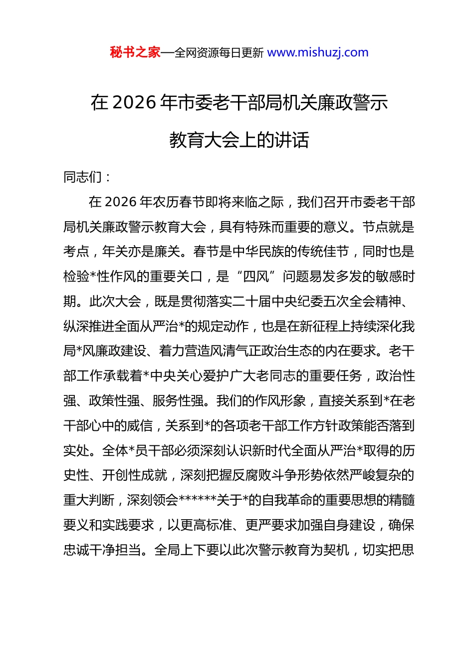 秘书之家—全网资源每日更新 www.mishuzj.com在 2026 年市委老干部局机关廉政警示教育大会上的讲话同志们:在 2026 年农历春节即将来临之际,我们召开市委老干部局机关廉政警示教育大会,具有特殊而重要的意义。节点就是考点,年关亦是廉关。春节是中华民族的传统佳节,同时也是检验*性作风的重要关口,是“四风”问题易发多发的敏感时期。此次大会,既是贯彻落实二十届中央纪委五次全会精神、纵深推进全面从严治*的规定动作,也是在新征程上持续深化我局*风廉政建设、着力营造风清气正政治生态的内在要求。老干部工作承载着*中央关心爱护广大老同志的重要任务,政治性强、政策性强、服务性强。我们的作风形象,直接关系到*在老干部心中的威信,关系到*的各项老干部工作方针政策能否落到实处。全体*员干部必须深刻认识新时代全面从严治*取得的历史性、开创性成就,深刻把握反腐败斗争形势依然严峻复杂的重大判断,深刻领会******关于*的自我革命的重要思想的精髓要义和实践要求,以更高标准、更严要求加强自身建设,确保忠诚干净担当。全局上下要以此次警示教育为契机,切实把思秘书之家—全网资源每日更新 www.mishuzj.com想和行动统一到*中央决策部署上来,统一到市委的工作要求上来,进一步增强纪律意识、规矩意识、廉洁意识,坚决筑牢拒腐防变的思想防线和制度防线,确保过一个廉洁、祥和、安全的春节,为全年工作开好局、起好步提供坚强保障。一、以固本培元的执着,筑牢政治忠诚的压舱石******在二十届中央纪委五次全会上强调,要“以坚持*中央集中统一领导为根本保证,坚持不懈用*的创新理论凝心铸魂”。这深刻揭示了全面从严治*、推进*的自我革命的根本遵循。回顾过往,我们深刻体会到,只有理论上清醒,政治上才能坚定。展望前路,面对复杂形势和繁重任务,我们必须首先从政治上深刻认识抓好*风廉政建设的重要性。具体到老干部工作,政治属性是第一属性,讲政治是第一位的要求。因此,我们将“筑牢政治忠诚的压舱石”作为首要任务,旨在引导全局*员干部从思想深处解决好“总开关”问题,确保老干部工作始终沿着正确方向前进。(一)深化理论武装,夯实信仰根基。一是强化科学理论引领。政治上的坚定源于理论上的清醒。必须将学习贯彻*的创新理论作为终身课题,坚持读原著、学原文、悟原理,深刻领会其核心要义、精神实质、丰富内涵、实践要求,特别是要学深悟透******关于老干部工作的重要论述和****批示精神。***秘书之家—全网资源每日更新 www.mishuzj.com***指出,“老干部是*执政兴国的重要资源,是推进中国特色社会主义伟大事业的重要力量。”这为我们的工作指明了方向、提供了遵循。我们要自觉用*的创新理论观察老干部工作新形势、研究老干部工作新情况、解决老干部工作新问题,不断提高政治判断力、政治领悟力、政治执行力。要坚持理论联系实际,将学习成果转化为精准服务老干部、有效发挥老干部作用的思路举措,确保*的老干部工作方针政策不折不扣落到实处。要旗帜鲜明地反对历史虚无主义等错误思潮,坚决抵制任何歪曲*的历史、否定*的领导的言论和行为,引导老同志和我们自身一道,坚定不移听*话、跟*走。通过持续深入的理论学习,深刻领悟“两个确立”的决定性意义,增强“四个意识”、坚定“四个自信”、做到“两个维护”,在思想上政治上行动上始终同以***同志为核心的*中央保持高度一致。二是坚守理想信念高地。理想信念是共产*人精神上的“钙”,没有理想信念,或者理想信念不坚定,精神上就会“缺钙”,就会得“软骨病”。在老干部工作部门,我们直接服务为*和人民事业奋斗一生的老同志,他们身上所展现的坚定信仰和崇高精神,是我们最生动、最宝贵的教材。我们要从老同志的奋斗历程中汲取精神养分,自觉加强*性锻炼和道德修养,解决好世界观、人生观、价值观这个根本问题。要清醒认识到,腐败问题秘书之家—全网资源每日更新 www.mishuzj.com的根源往往在于理想信念的滑坡。面对社会上形形色色的诱惑和考验,必须时刻保持警惕,不断拧紧理想信念的“总开关”,筑牢拒腐防变的思想堤坝。要深刻认识到,老干部工作虽然不是处在经济社会发展的“火...