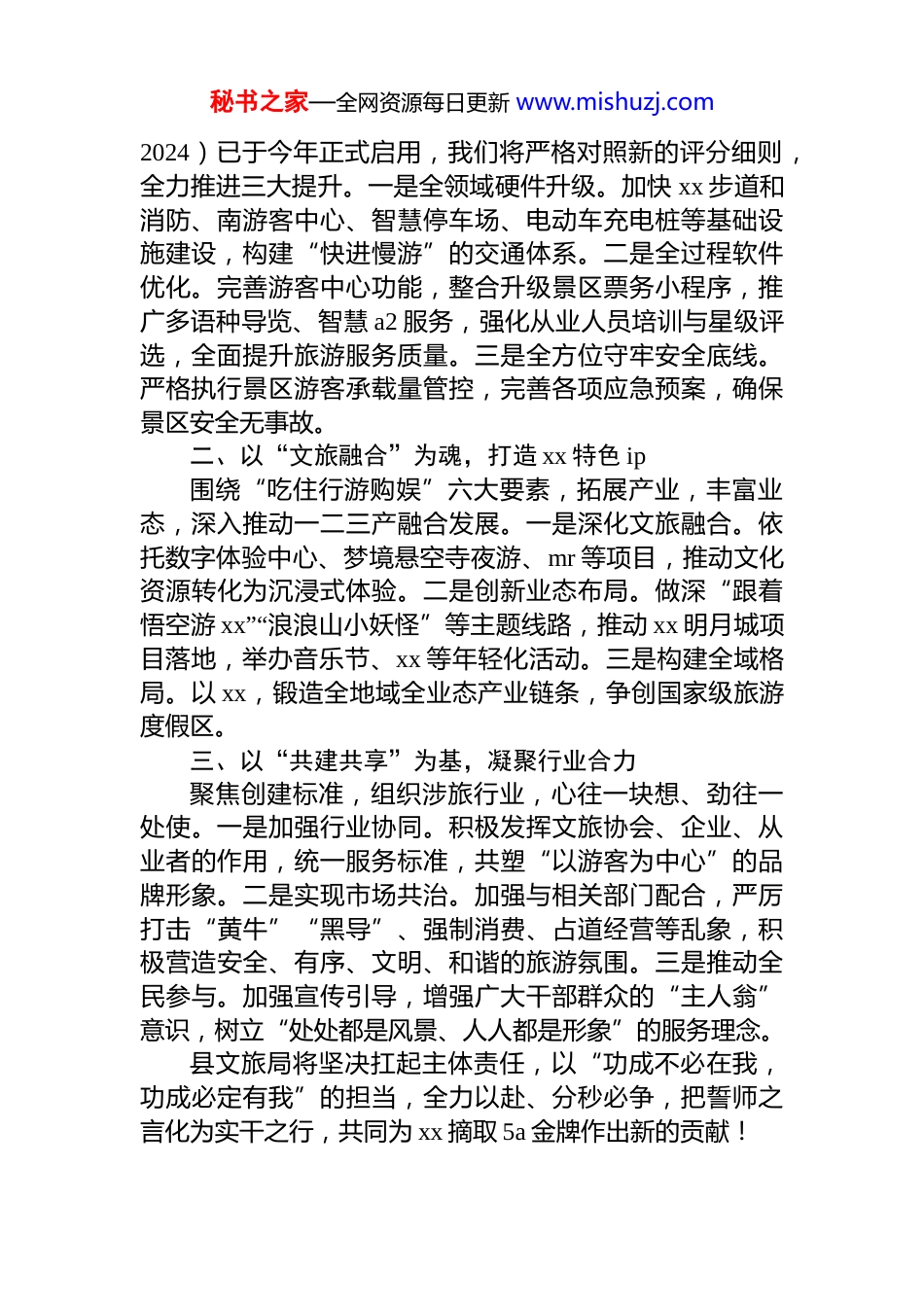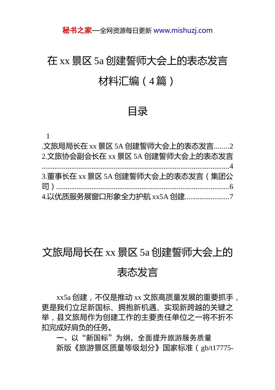 秘书之家—全网资源每日更新 www.mishuzj.com在 xx 景区 5a 创建誓师大会上的表态发言材料汇编(4 篇)目录1.文旅局局长在 xx 景区 5A 创建誓师大会上的表态发言........22.文旅协会副会长在 xx 景区 5A 创建誓师大会上的表态发言.....................................................................................................43.董事长在 xx 景区 5A 创建誓师大会上的表态发言(集团公司).............................................................................................64.以优质服务展窗口形象全力护航 xx5A 创建........................7文旅局局长在 xx 景区 5a 创建誓师大会上的表态发言xx5a 创建,不仅是推动 xx 文旅高质量发展的重要抓手,更是我们立足新国标、拥抱新机遇、实现新跨越的关键之举,县文旅局作为创建工作的主要责任单位之一将不折不扣完成好肩负的任务。一、以“新国标”为纲,全面提升旅游服务质量新版《旅游景区质量等级划分》国家标准(gb/t17775-秘书之家—全网资源每日更新 www.mishuzj.com2024)已于今年正式启用,我们将严格对照新的评分细则,全力推进三大提升。一是全领域硬件升级。加快 xx 步道和消防、南游客中心、智慧停车场、电动车充电桩等基础设施建设,构建“快进慢游”的交通体系。二是全过程软件优化。完善游客中心功能,整合升级景区票务小程序,推广多语种导览、智慧 a2 服务,强化从业人员培训与星级评选,全面提升旅游服务质量。三是全方位守牢安全底线。严格执行景区游客承载量管控,完善各项应急预案,确保景区安全无事故。二、以“文旅融合”为魂,打造 xx 特色 ip围绕“吃住行游购娱”六大要素,拓展产业,丰富业态,深入推动一二三产融合发展。一是深化文旅融合。依托数字体验中心、梦境悬空寺夜游、mr 等项目,推动文化资源转化为沉浸式体验。二是创新业态布局。做深“跟着悟空游 xx”“浪浪山小妖怪”等主题线路,推动 xx 明月城项目落地,举办音乐节、xx 等年轻化活动。三是构建全域格局。以 xx,锻造全地域全业态产业链条,争创国家级旅游度假区。三、以“共建共享”为基,凝聚行业合力聚焦创建标准,组织涉旅行业,心往一块想、劲往一处使。一是加强行业协同。积极发挥文旅协会、企业、从业者的作用,统一服务标准,共塑“以游客为中心”的品牌形象。二是实现市场共治。加强与相关部门配合,严厉打击“黄牛”“黑导”、强制消费、占道经营等乱象,积极营造安全、有序、文明、和谐的旅游氛围。三是推动全民参与。加强宣传引导,增强广大干部群众的“主人翁”意识,树立“处处都是风景、人人都是形象”的服务理念。县文旅局将坚决扛起主体责任,以“功成不必在我,功成必定有我”的担当,全力以赴、分秒必争,把誓师之言化为实干之行,共同为 xx 摘取 5a 金牌作出新的贡献!秘书之家—全网资源每日更新 www.mishuzj.com文旅协会副会长在 xx 景区 5a 创建誓师大会上的表态发言在全县深入贯彻*的四中全会精神、全面完成“十四五”擘画“十五五”、运筹“五心五地”战略、xx 旅游日新月异风生水起的关键时刻,“xx 创建 5a 景区誓师大会”吹响了 xx 文旅迈向新辉煌的奋进号角。xx 县文化旅游协会将全力为 xx5a 创建和文旅振兴添砖加瓦。一、凝聚合力,搭建沟通桥梁创建 xx5a 景区,是一场全民参与的“大合唱”。协会将主动扛起凝聚政企民多方力量的重任。一是,及时收集会员单位在 5a 创建中的需求与困难,精准反馈给相关部门。二是,积极传达县委、县政府的创建部署与工作要求。三是,引导全体文旅从业者统一思想、步调一致,确保各项创建任务不打折扣地落实到位。四是,开展“文明服务互评互促”活动,让每家文旅单位都成为创建 xx5a 的参与者,每位文旅人都成为 xx 形象的守护者。二、攻坚克难,发挥协会职能对照 5a 景区高标准,协会将建立“红黑榜”制度。对表现突出的单位表彰推广,对违规经营、服务失范的单位提出整改意见,使行业服务水平整体提升。同时发动会员单位参与环境整治、设施维护等志愿活动,创建人文与...