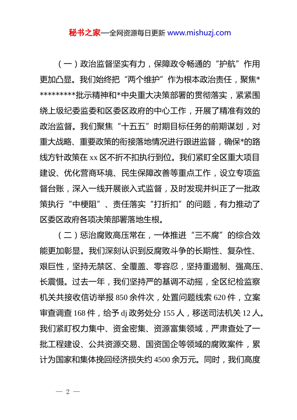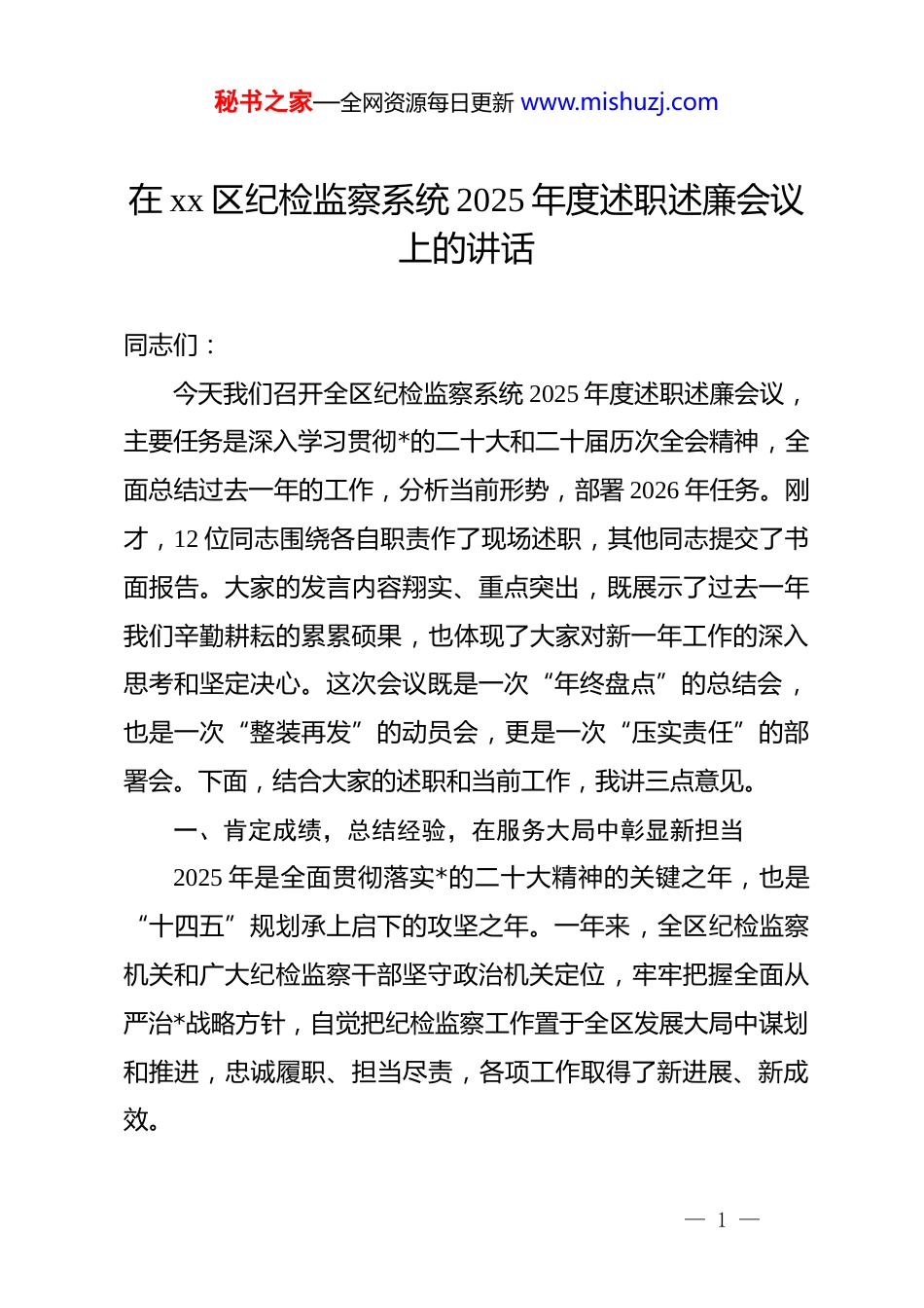 秘书之家—全网资源每日更新 www.mishuzj.com在 xx 区纪检监察系统 2025 年度述职述廉会议上的讲话同志们:今天我们召开全区纪检监察系统 2025 年度述职述廉会议,主要任务是深入学习贯彻*的二十大和二十届历次全会精神,全面总结过去一年的工作,分析当前形势,部署 2026 年任务。刚才,12 位同志围绕各自职责作了现场述职,其他同志提交了书面报告。大家的发言内容翔实、重点突出,既展示了过去一年我们辛勤耕耘的累累硕果,也体现了大家对新一年工作的深入思考和坚定决心。这次会议既是一次“年终盘点”的总结会,也是一次“整装再发”的动员会,更是一次“压实责任”的部署会。下面,结合大家的述职和当前工作,我讲三点意见。一、肯定成绩,总结经验,在服务大局中彰显新担当2025 年是全面贯彻落实*的二十大精神的关键之年,也是“十四五”规划承上启下的攻坚之年。一年来,全区纪检监察机关和广大纪检监察干部坚守政治机关定位,牢牢把握全面从严治*战略方针,自觉把纪检监察工作置于全区发展大局中谋划和推进,忠诚履职、担当尽责,各项工作取得了新进展、新成效。— 1 —秘书之家—全网资源每日更新 www.mishuzj.com(一)政治监督坚实有力,保障政令畅通的“护航”作用更加凸显。我们始终把“两个维护”作为根本政治责任,聚焦**********批示精神和*中央重大决策部署的贯彻落实,紧紧围绕上级纪委监委和区委区政府的中心工作,开展了精准有效的政治监督。我们聚焦“十五五”时期目标任务的前期谋划,对重大战略、重要政策的衔接落地情况进行跟进监督,确保*的路线方针政策在 xx 区不折不扣执行到位。我们紧盯全区重大项目建设、优化营商环境、民生保障改善等重点工作,设立专项监督台账,深入一线开展嵌入式监督,及时发现并纠正了一批政策执行“中梗阻”、责任落实“打折扣”的问题,有力推动了区委区政府各项决策部署落地生根。(二)惩治腐败高压常在,一体推进“三不腐”的综合效能更加彰显。我们深刻认识到反腐败斗争的长期性、复杂性、艰巨性,坚持无禁区、全覆盖、零容忍,坚持重遏制、强高压、长震慑。过去一年,我们坚持严的基调不动摇,全区纪检监察机关共接收信访举报 850 余件次,处置问题线索 620 件,立案审查调查 168 件,给予 dj 政务处分 155 人,移送司法机关 12 人。我们紧盯权力集中、资金密集、资源富集领域,严肃查处了一批工程建设、公共资源交易、国资国企等领域的腐败案件,累计为国家和集体挽回经济损失约 4500 余万元。同时,我们高度— 2 —秘书之家—全网资源每日更新 www.mishuzj.com关注群众身边的“蝇贪蚁腐”,深入开展民生领域专项整治,查处教育医疗、养老社保、生态环保等领域案件 45 件,让人民群众在正风肃纪反腐中感受到更多的公平正义。全国纪检监察机关 2025 年前三季度立案 78.9 万件的数据警示我们,反腐败斗争形势依然严峻复杂,我们必须保持定力,持续发力。(三)正风肃纪驰而不息,作风建设的“金色名片”更加亮丽。作风建设永远在路上。我们把落实中央八项规定精神作为长期有效的铁规矩、硬杠杠,对顶风违纪行为露头就打、寸步不让。2025 年,全区共查处违反中央八项规定精神问题 58 起,批评教育帮助和处理 82 人,其中给予 dj 政务处分 45 人。这些数据与 2025 年 1 至 11 月全国查处 25.2 万起问题的总体态势相一致,表明纠治“四风”必须常抓不懈。我们不仅严肃查处“舌尖上的浪费”“车轮上的腐败”等显性问题,更下大力气整治形式主义、官僚主义等顽瘴痼疾,针对工作中存在的“推、拖、绕、躲”等现象,开展专项督查,推动干部作风持续向好。(四)系统治理深入推进,“治”的综合效应更加深化。我们坚持惩治并举、标本兼治,深化以案促改、以案促治。针对案件查办和日常监督中发现的共性问题、制度漏洞,我们深入剖析问题根源,制发纪检监察建议书 35 份,督促相关单位和部门建章立制、堵塞漏洞。例如,在查办某区属国企“一把— 3 —秘书之家—全网资源每日更新 www.mishuzj.com手”违纪违法案件后,我们推动该企业*委开展了为期三个月的专项整顿...