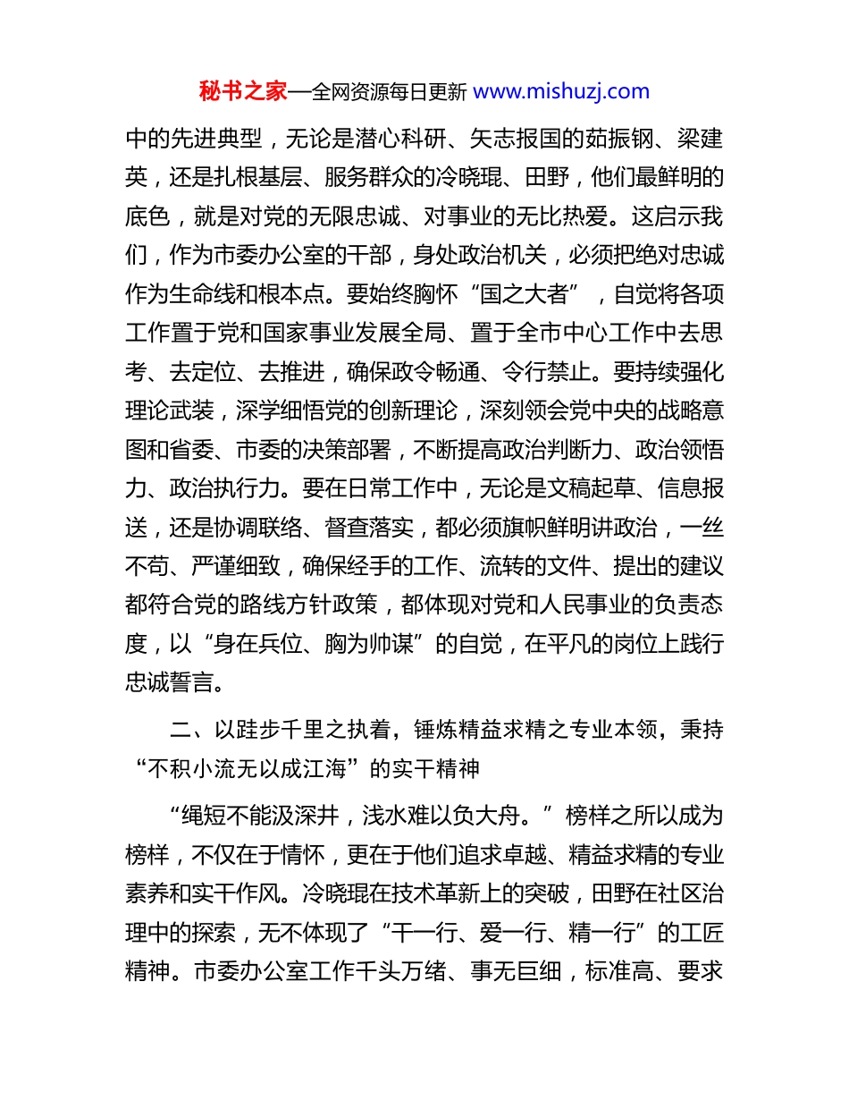 秘书之家—全网资源每日更新 www.mishuzj.com在机关党支部集体观看《榜样 10》专题活动上的讲话同志们:今天,我们机关党支部组织集体观看《榜样 10》专题片,旨在深入学习贯彻习近平新时代中国特色社会主义思想和党的二十大精神,引导全体党员干部从先进典型中汲取精神力量,砥砺初心使命,强化责任担当。习近平总书记深刻指出:“伟大时代呼唤伟大精神,崇高事业需要榜样引领。”组织学习《榜样 10》中茹振钢、梁建英、冷晓琨、田野、罗胤等优秀党员以及先进基层党支部的感人事迹,正是为我们立起了见贤思齐的时代标杆,照亮了奋勇前行的实践路径。市委办公室作为市委的参谋部、联络部、执行部,地位特殊,责任重大。我们每一位同志,都应当以榜样为镜,深刻检视自身在思想境界、党性修养、担当作为、作风形象方面的差距与不足,将学习榜样的精神力量转化为服务发展、服务决策、服务落实的强劲动能,努力在推进中国式现代化 XX 实践中展现新作为、作出新贡献。一、以萤烛末光之热忱,铸就绝对忠诚之政治品格,恪守“位卑未敢忘忧国”的信念担当“对党忠诚,是共产党人首要的政治品质。”《榜样 10》秘书之家—全网资源每日更新 www.mishuzj.com中的先进典型,无论是潜心科研、矢志报国的茹振钢、梁建英,还是扎根基层、服务群众的冷晓琨、田野,他们最鲜明的底色,就是对党的无限忠诚、对事业的无比热爱。这启示我们,作为市委办公室的干部,身处政治机关,必须把绝对忠诚作为生命线和根本点。要始终胸怀“国之大者”,自觉将各项工作置于党和国家事业发展全局、置于全市中心工作中去思考、去定位、去推进,确保政令畅通、令行禁止。要持续强化理论武装,深学细悟党的创新理论,深刻领会党中央的战略意图和省委、市委的决策部署,不断提高政治判断力、政治领悟力、政治执行力。要在日常工作中,无论是文稿起草、信息报送,还是协调联络、督查落实,都必须旗帜鲜明讲政治,一丝不苟、严谨细致,确保经手的工作、流转的文件、提出的建议都符合党的路线方针政策,都体现对党和人民事业的负责态度,以“身在兵位、胸为帅谋”的自觉,在平凡的岗位上践行忠诚誓言。二、以跬步千里之执着,锤炼精益求精之专业本领,秉持“不积小流无以成江海”的实干精神“绳短不能汲深井,浅水难以负大舟。”榜样之所以成为榜样,不仅在于情怀,更在于他们追求卓越、精益求精的专业素养和实干作风。冷晓琨在技术革新上的突破,田野在社区治理中的探索,无不体现了“干一行、爱一行、精一行”的工匠精神。市委办公室工作千头万绪、事无巨细,标准高、要求秘书之家—全网资源每日更新 www.mishuzj.com严、节奏快,任何环节的疏漏都可能影响整体运转乃至市委决策部署的落实。这就要求我们必须发扬“安专迷”精神,把工作当学问来研究,当事业来追求。要聚焦“三服务”核心职能,在文稿服务上力求“短实新”、言之有物,在信息处理上做到“快准全”、反应灵敏,在统筹协调上讲究“艺术性”、周密高效,在督查落实上敢于“动真格”、一抓到底。要主动适应新形势新任务新要求,加强对经济社会发展各领域知识的学习,不断优化知识结构,克服本领恐慌。要注重在实践中学真知、悟真谛,加强磨练、增长本领,把每项任务都作为提升能力的契机,把每个岗位都当作锻炼才干的舞台,以极端负责、极其用心、极为精细的态度,积小胜为大胜,努力成为服务市委决策的“活字典”“政策通”和“多面手”。三、以滴水穿石之韧劲,涵养无私奉献之公仆情怀,践行“春蚕到死丝方尽”的初心使命“共产党就是为人民服务的,就是为老百姓办事的。”《榜样 10》中罗胤等同志及先进基层党组织,生动诠释了“人民至上”的价值理念和“我将无我、不负人民”的崇高境界。他们的奉献,体现在日复一日的坚守,体现在急难险重面前的挺身而出,体现在舍小家为大家的无私选择。市委办公室的工作,本质上就是服务,服务领导、服务基层、服务群众。我们虽然不直接面对群众办理具体事务,但我们的每一项工作都与全市改革发展稳定大局紧密相连,与人民群众的切身利益秘书之家—全网资源每日更新 www.mishuzj.com息息相关。这就要求我们...