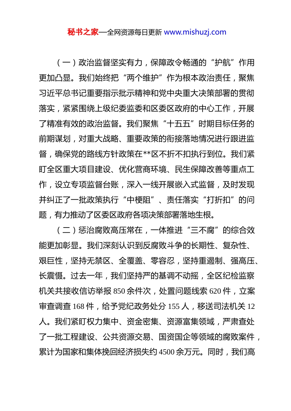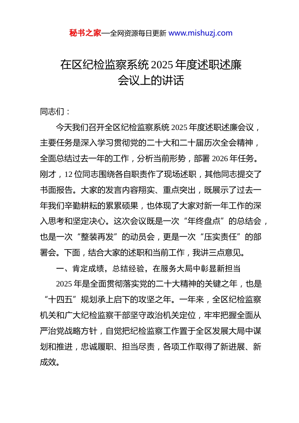 秘书之家—全网资源每日更新 www.mishuzj.com在区纪检监察系统 2025 年度述职述廉会议上的讲话 同志们:今天我们召开全区纪检监察系统 2025 年度述职述廉会议,主要任务是深入学习贯彻党的二十大和二十届历次全会精神,全面总结过去一年的工作,分析当前形势,部署 2026 年任务。刚才,12 位同志围绕各自职责作了现场述职,其他同志提交了书面报告。大家的发言内容翔实、重点突出,既展示了过去一年我们辛勤耕耘的累累硕果,也体现了大家对新一年工作的深入思考和坚定决心。这次会议既是一次“年终盘点”的总结会,也是一次“整装再发”的动员会,更是一次“压实责任”的部署会。下面,结合大家的述职和当前工作,我讲三点意见。一、肯定成绩,总结经验,在服务大局中彰显新担当2025 年是全面贯彻落实党的二十大精神的关键之年,也是“十四五”规划承上启下的攻坚之年。一年来,全区纪检监察机关和广大纪检监察干部坚守政治机关定位,牢牢把握全面从严治党战略方针,自觉把纪检监察工作置于全区发展大局中谋划和推进,忠诚履职、担当尽责,各项工作取得了新进展、新成效。秘书之家—全网资源每日更新 www.mishuzj.com(一)政治监督坚实有力,保障政令畅通的“护航”作用更加凸显。我们始终把“两个维护”作为根本政治责任,聚焦习近平总书记重要指示批示精神和党中央重大决策部署的贯彻落实,紧紧围绕上级纪委监委和区委区政府的中心工作,开展了精准有效的政治监督。我们聚焦“十五五”时期目标任务的前期谋划,对重大战略、重要政策的衔接落地情况进行跟进监督,确保党的路线方针政策在**区不折不扣执行到位。我们紧盯全区重大项目建设、优化营商环境、民生保障改善等重点工作,设立专项监督台账,深入一线开展嵌入式监督,及时发现并纠正了一批政策执行“中梗阻”、责任落实“打折扣”的问题,有力推动了区委区政府各项决策部署落地生根。(二)惩治腐败高压常在,一体推进“三不腐”的综合效能更加彰显。我们深刻认识到反腐败斗争的长期性、复杂性、艰巨性,坚持无禁区、全覆盖、零容忍,坚持重遏制、强高压、长震慑。过去一年,我们坚持严的基调不动摇,全区纪检监察机关共接收信访举报 850 余件次,处置问题线索 620 件,立案审查调查 168 件,给予党纪政务处分 155 人,移送司法机关 12人。我们紧盯权力集中、资金密集、资源富集领域,严肃查处了一批工程建设、公共资源交易、国资国企等领域的腐败案件,累计为国家和集体挽回经济损失约 4500 余万元。同时,我们高秘书之家—全网资源每日更新 www.mishuzj.com度关注群众身边的“蝇贪蚁腐”,深入开展民生领域专项整治,查处教育医疗、养老社保、生态环保等领域案件 45 件,让人民群众在正风肃纪反腐中感受到更多的公平正义。全国纪检监察机关 2025 年前三季度立案 78.9 万件的数据警示我们,反腐败斗争形势依然严峻复杂,我们必须保持定力,持续发力。(三)正风肃纪驰而不息,作风建设的“金色名片”更加亮丽。作风建设永远在路上。我们把落实中央八项规定精神作为长期有效的铁规矩、硬杠杠,对顶风违纪行为露头就打、寸步不让。2025 年,全区共查处违反中央八项规定精神问题 58 起,批评教育帮助和处理 82 人,其中给予党纪政务处分 45 人。这些数据与 2025 年 1 至 11 月全国查处 25.2 万起问题的总体态势相一致,表明纠治“四风”必须常抓不懈。我们不仅严肃查处“舌尖上的浪费”“车轮上的腐败”等显性问题,更下大力气整治形式主义、官僚主义等顽瘴痼疾,针对工作中存在的“推、拖、绕、躲”等现象,开展专项督查,推动干部作风持续向好。(四)系统治理深入推进,“治”的综合效应更加深化。我们坚持惩治并举、标本兼治,深化以案促改、以案促治。针对案件查办和日常监督中发现的共性问题、制度漏洞,我们深入剖析问题根源,制发纪检监察建议书 35 份,督促相关单位和部门建章立制、堵塞漏洞。例如,在查办某区属国企“一把秘书之家—全网资源每日更新 www.mishuzj.com手”违纪违法案件后,我们推动该企业党委开展了为期三个月的专项整顿,完善了“三重一大”决策...
