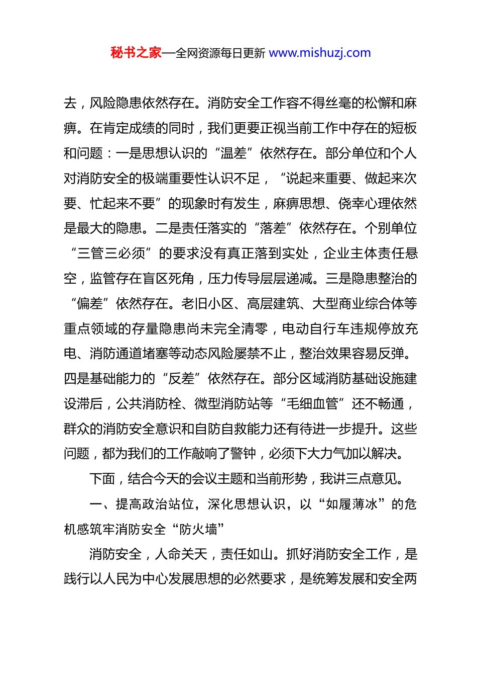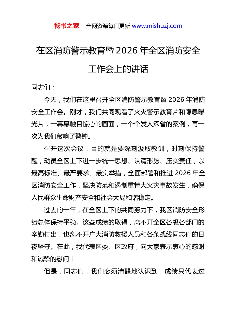 秘书之家—全网资源每日更新 www.mishuzj.com在区消防警示教育暨 2026 年全区消防安全工作会上的讲话同志们:今天,我们在这里召开全区消防警示教育暨 2026 年消防安全工作会。刚才,我们共同观看了火灾警示教育片和隐患曝光片,一幕幕触目惊心的画面,一个个发人深省的案例,再一次为我们敲响了警钟。召开这次会议,目的就是要深刻汲取教训,时刻保持警醒,动员全区上下进一步统一思想、认清形势、压实责任,以最高标准、最严要求、最实举措,全面部署和推进 2026 年全区消防安全工作,坚决防范和遏制重特大火灾事故发生,确保人民群众生命财产安全和社会大局和谐稳定。过去的一年,在全区上下的共同努力下,我区消防安全形势总体保持平稳。这些成绩的取得,离不开全区各级各部门的辛勤付出,也离不开广大消防救援人员和各条战线同志们的日夜坚守。在此,我代表区委、区政府,向大家表示衷心的感谢和诚挚的慰问!但是,同志们,我们必须清醒地认识到,成绩只代表过秘书之家—全网资源每日更新 www.mishuzj.com去,风险隐患依然存在。消防安全工作容不得丝毫的松懈和麻痹。在肯定成绩的同时,我们更要正视当前工作中存在的短板和问题:一是思想认识的“温差”依然存在。部分单位和个人对消防安全的极端重要性认识不足,“说起来重要、做起来次要、忙起来不要”的现象时有发生,麻痹思想、侥幸心理依然是最大的隐患。二是责任落实的“落差”依然存在。个别单位“三管三必须”的要求没有真正落到实处,企业主体责任悬空,监管存在盲区死角,压力传导层层递减。三是隐患整治的“偏差”依然存在。老旧小区、高层建筑、大型商业综合体等重点领域的存量隐患尚未完全清零,电动自行车违规停放充电、消防通道堵塞等动态风险屡禁不止,整治效果容易反弹。四是基础能力的“反差”依然存在。部分区域消防基础设施建设滞后,公共消防栓、微型消防站等“毛细血管”还不畅通,群众的消防安全意识和自防自救能力还有待进一步提升。这些问题,都为我们的工作敲响了警钟,必须下大力气加以解决。下面,结合今天的会议主题和当前形势,我讲三点意见。一、提高政治站位,深化思想认识,以“如履薄冰”的危机感筑牢消防安全“防火墙”消防安全,人命关天,责任如山。抓好消防安全工作,是践行以人民为中心发展思想的必然要求,是统筹发展和安全两秘书之家—全网资源每日更新 www.mishuzj.com件大事的题中应有之义,更是一项必须坚决扛起的重大政治责任。全区上下必须站在讲政治、顾大局、保稳定、促发展的高度,深刻认识消防安全工作的极端重要性和现实紧迫性。第一,必须深刻认识到,抓消防安全就是抓发展。安全是发展的前提,没有安全,一切发展都无从谈起。一个地方如果安全事故频发,不仅会造成巨大的人员伤亡和财产损失,更会严重损害营商环境,影响招商引资,迟滞发展步伐。我区正处在转型升级、高质量发展的关键时期,各类新产业、新业态、新模式不断涌现,市场主体活跃,人流物流密集,这既是我们的发展优势,也对消防安全提出了更高要求。我们必须牢固树立“安全第一、预防为主、综合治理”的方针,将消防安全工作与经济社会发展同规划、同部署、同落实,以高水平的安全保障服务高质量的发展。第二,必须深刻认识到,抓消防安全就是抓民生。国泰民安是人民群众最基本、最普遍的愿望。消防安全直接关系到千家万户的幸福安宁。一场火灾,可能让一个家庭瞬间倾家荡产,甚至阴阳两隔。**“1·17”火灾的惨痛教训,我们永世不能忘记。15 年过去了,但那场事故留下的伤疤依然在警示我们,消防安全是民生大事,任何时候都不能掉以轻心。我们必须始终怀着对人民群众的深厚感情,把保障人民生命财产安全放在秘书之家—全网资源每日更新 www.mishuzj.com第一位,以“时时放心不下”的责任感,用心用情用力解决好群众身边的消防安全问题,切实提升人民群众的获得感、幸福感、安全感。第三,必须深刻认识到,抓消防安全就是抓稳定。当前,我们面临的内外环境复杂严峻,维护社会大局稳定是压倒一切的政治任务。消防安全是社会稳定的重要基石,一旦发生有重大影响的火灾事故,极易引发社会恐慌,...