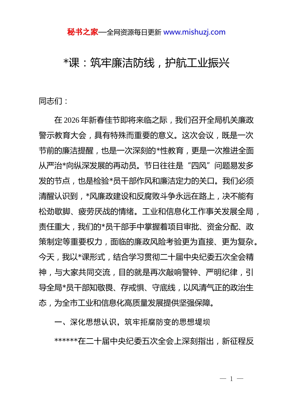秘书之家—全网资源每日更新 www.mishuzj.com*课:筑牢廉洁防线,护航工业振兴同志们:在 2026 年新春佳节即将来临之际,我们召开全局机关廉政警示教育大会,具有特殊而重要的意义。这次会议,既是一次节前的廉洁提醒,也是一次深刻的*性教育,更是一次推进全面从严治*向纵深发展的再动员。节日往往是“四风”问题易发多发的节点,也是检验*员干部作风和廉洁定力的关口。我们必须清醒认识到,*风廉政建设和反腐败斗争永远在路上,决不能有松劲歇脚、疲劳厌战的情绪。工业和信息化工作事关发展全局,责任重大,我们的*员干部手中掌握着项目审批、资金分配、政策制定等重要权力,面临的廉政风险考验更为直接、更为复杂。今天,我以*课形式,结合学习贯彻二十届中央纪委五次全会精神,与大家共同交流,目的就是再次敲响警钟、严明纪律,引导全局*员干部知敬畏、存戒惧、守底线,以风清气正的政治生态,为全市工业和信息化高质量发展提供坚强保障。一、深化思想认识,筑牢拒腐防变的思想堤坝******在二十届中央纪委五次全会上深刻指出,新征程反— 1 —秘书之家—全网资源每日更新 www.mishuzj.com腐败斗争,必须在铲除腐败问题产生的土壤和条件上持续发力、纵深推进,并对加强 d 的纪律建设作出战略部署,强调“以学习贯彻新修订的纪律处分条例为契机,在全*开展一次集中性纪律教育”。这为我们深化全面从严治*指明了方向,提供了遵循。思想是行动的先导。只有从思想深处解决好世界观、人生观、价值观这个“总开关”问题,才能在各种诱惑面前立场坚定,在风浪考验面前无所畏惧。当前,我们肩负着推动新型工业化、建设现代化产业体系的重大使命,任务艰巨繁重,面临的考验也更加严峻。我们必须首先从思想上固本培元,不断提高政治判断力、政治领悟力、政治执行力,深刻认识反腐败斗争的长期性、复杂性、艰巨性,切实增强拒腐防变的思想自觉。(一)坚持政治引领,把稳理想信念“定盘星”******强调,“理想信念是共产*人精神上的‘钙’,没有理想信念,理想信念不坚定,精神上就会‘缺钙’,就会得‘软骨病’”。对于工信部门的*员干部而言,坚定的理想信念是抵御一切诱惑、经受住各种考验的根本保证。我们要始终将政治建设摆在首位,深刻领悟“两个确立”的决定性意义,坚决做到“两个维护”,自觉在思想上政治上行动上同*中央保持高度一致。具体到工作中,就是要不折不扣贯彻落实*中央关于— 2 —秘书之家—全网资源每日更新 www.mishuzj.com新型工业化、制造强国、网络强国等一系列重大决策部署,以及省委、市委的工作要求,确保工信事业始终沿着正确方向前进。要持续强化理论武装,深入学习*的创新理论,特别是关于发展新质生产力、推动高质量发展的重要论述,掌握其核心要义和实践要领,用以指导我们研判产业发展趋势、制定政策措施、服务企业创新。要坚持用*的科学理论改造主观世界,常掸思想尘、常破“心中贼”,从内心深处解决好“为了谁、依靠谁、我是谁”的根本问题,自觉做共产主义远大理想和中国特色社会主义共同理想的坚定信仰者和忠实实践者,永葆共产*人的政治本色。要将理想信念融入日常,转化为爱岗敬业、履职尽责的实际行动,在面对项目审批、资金扶持、行业监管等具体工作时,始终牢记手中的权力是*和人民赋予的,只能用来为产业发展服务、为企业排忧解难,绝不能异化为谋取私利的工具。只有把理想信念的根基打得牢牢的,我们才能在推动产业升级、技术创新、数字赋能的复杂实践中,始终保持清醒头脑和坚定立场,不为任何风险所惧,不为任何干扰所惑,真正做到“风雨不动安如山”。(二)严守纪律规矩,筑牢廉洁从政“防火墙”d 的纪律是*的生命线,是*员干部约束自身行为的基本准— 3 —秘书之家—全网资源每日更新 www.mishuzj.com则。新修订的《中国共产 dj 律处分条例》进一步严明了政治纪律和政治规矩,为我们划定了行为红线。工信部门职能重要、资源富集,权力运行涉及产业规划、项目准入、专项资金管理等诸多环节,纪律规矩的重要性尤为突出。我们必须把学习遵守*章*规 dj 作为终身课题,带头学纪、知纪、明纪、守纪。要突出政治纪律和组...