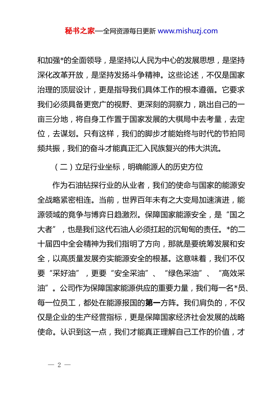 秘书之家—全网资源每日更新 www.mishuzj.com*课讲稿:深学细悟全会精神笃行实干扛牢能源报国使命同志们:大家好。今天,借此机会,围绕学习贯彻*的二十届四中全会精神,结合我个人在公司多年工作的经历与思考,和大家作一次交流。这不仅是一次*课,更是一次思想的碰撞、一次初心的回溯。希望能与各位同志一道,在深学细悟中凝聚共识,在笃行实干中砥砺前行。一、深化思想认识,以全会精神领航定向时代的车轮滚滚向前,每一次*的中央全会,都是我们航程中的重要灯塔。*的二十届四中全会,是在我国迈上全面建设社会主义现代化国家新征程、向第二个百年奋斗目标进军的关键时刻召开的一次十分重要的会议。学习领会其精神,不能停留在表面,必须深入骨髓、融入灵魂。(一)把握时代脉搏,领会全会精神的核心要义*的二十届四中全会擘画了未来发展的宏伟蓝图,系统部署了推进中国式现代化的一系列重大任务。其精神内核,是坚持— 1 —秘书之家—全网资源每日更新 www.mishuzj.com和加强*的全面领导,是坚持以人民为中心的发展思想,是坚持深化改革开放,是坚持发扬斗争精神。这些论述,不仅是国家治理的顶层设计,更是指导我们具体工作的根本遵循。它要求我们必须具备更宽广的视野、更深刻的洞察力,跳出自己的一亩三分地,将自身工作置于国家发展的大棋局中去考量,去定位,去谋划。只有这样,我们的脚步才能始终与时代的节拍同频共振,我们的奋斗才能真正汇入民族复兴的伟大洪流。(二)立足行业坐标,明确能源人的历史方位作为石油钻探行业的从业者,我们的使命与国家的能源安全战略紧密相连。当前,世界百年未有之大变局加速演进,能源领域的竟争与博弈日趋激烈。保障国家能源安全,是“国之大者”,也是我们这代石油人必须扛起的沉甸甸的责任。*的二十届四中全会精神为我们指明了方向,那就是要统筹发展和安全,以高质量发展夯实能源安全的根基。这意味着,我们不仅要“采好油”,更要“安全采油”、“绿色采油”、“高效采油”。公司作为保障国家能源供应的重要力量,我们每一名*员、每一位员工,都处在能源报国的第一方阵。我们肩负的,不仅仅是企业的生产经营指标,更是保障国家经济社会发展的战略使命。认识到这一点,我们才能真正理解自己工作的价值,才— 2 —秘书之家—全网资源每日更新 www.mishuzj.com能在面对艰难险阻时,拥有无穷的力量和坚定的信念。二、坚守安全底线,以系统观念筑牢发展根基在我的职业生涯中,大部分时间都在和安全生产打交道。作为公司的安全总监,安全二字,对我而言,重于泰山。它不是挂在墙上的标语,不是文件里的条款,而是我们事业的生命线,是每一个家庭幸福的基石。(一)回望初心,感悟安全生产的千钧之重我时常回想自己刚参加工作时,在**钻井队当实习技术员的情景。井场上机器轰鸣,钢花飞溅,那种火热的劳动场面至今记忆犹新。但与此同时,老前辈们口中那些因一时疏忽、一次违章而酿成的事故,也像警钟一样时常在耳边敲响。我亲眼目睹过身边同事因为不规范操作而受伤的痛苦,也深刻体会过事故给一个家庭带来的无法弥补的创伤。这些经历让我深刻认识到,安全生产的每一个环节,都容不得半点马虎;每一份操作规程背后,都可能凝结着血的教训。安全是“1”,没有了这个“1”,后面再多的“0”都没有任何意义。这份对生命的敬畏,对责任的坚守,就是我们抓好安全工作的初心。任何时候,我们都不能忘记这份初心,不能因为生产任务重、工期紧张而有— 3 —秘书之家—全网资源每日更新 www.mishuzj.com丝毫的动摇和懈怠。(二)正视现实,破解安全管理的时代课题随着勘探开发的不断深入,我们面临的地质条件越来越复杂,作业环境越来越艰苦,新技术、新设备、新工艺的应用也越来越广泛。这给我们的安全管理带来了前所未有的挑战。过去那种依靠老师傅口传心授、依赖个人经验的“经验治理”模式,已经远远无法适应当前的需求。*的二十届四中全会强调,要完善社会治理体系,提升治理效能。这为我们的安全管理转型升级提供了思想指引。我们必须正视当前管理中存在的短板,比如部门之间协同不够紧密、风险辨识不够精准、隐患排查不够彻底、...