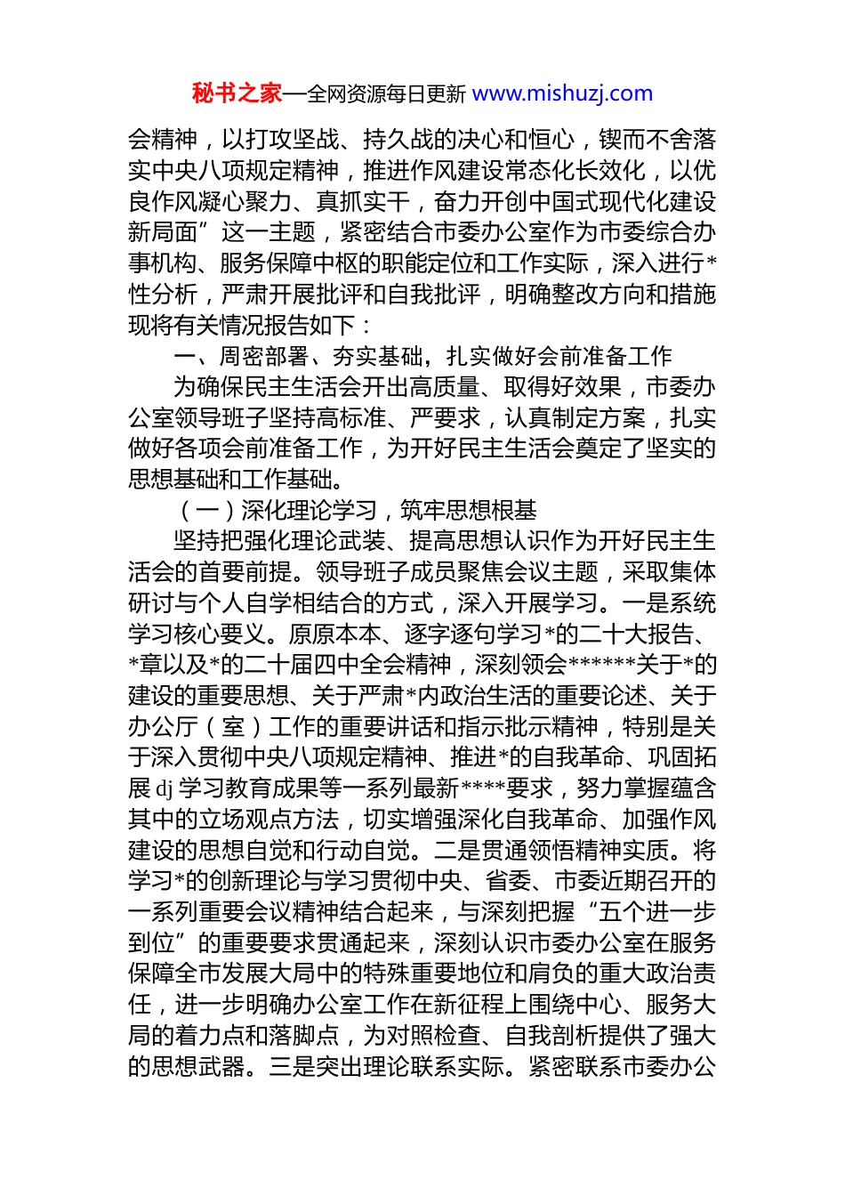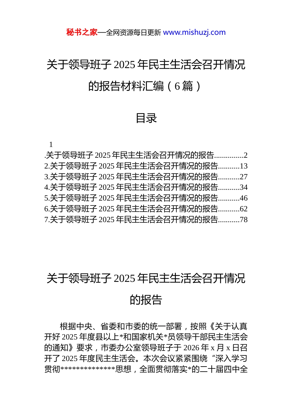 秘书之家—全网资源每日更新 www.mishuzj.com关于领导班子 2025 年民主生活会召开情况的报告材料汇编(6 篇)目录1.关于领导班子 2025 年民主生活会召开情况的报告...............22.关于领导班子 2025 年民主生活会召开情况的报告...........133.关于领导班子 2025 年民主生活会召开情况的报告...........274.关于领导班子 2025 年民主生活会召开情况的报告...........345.关于领导班子 2025 年民主生活会召开情况的报告...........466.关于领导班子 2025 年民主生活会召开情况的报告...........627.关于领导班子 2025 年民主生活会召开情况的报告...........78关于领导班子 2025 年民主生活会召开情况的报告根据中央、省委和市委的统一部署,按照《关于认真开好 2025 年度县以上*和国家机关*员领导干部民主生活会的通知》要求,市委办公室领导班子于 2026 年 x 月 x 日召开了 2025 年度民主生活会。本次会议紧紧围绕“深入学习贯彻**************思想,全面贯彻落实*的二十届四中全秘书之家—全网资源每日更新 www.mishuzj.com会精神,以打攻坚战、持久战的决心和恒心,锲而不舍落实中央八项规定精神,推进作风建设常态化长效化,以优良作风凝心聚力、真抓实干,奋力开创中国式现代化建设新局面”这一主题,紧密结合市委办公室作为市委综合办事机构、服务保障中枢的职能定位和工作实际,深入进行*性分析,严肃开展批评和自我批评,明确整改方向和措施现将有关情况报告如下:一、周密部署、夯实基础,扎实做好会前准备工作为确保民主生活会开出高质量、取得好效果,市委办公室领导班子坚持高标准、严要求,认真制定方案,扎实做好各项会前准备工作,为开好民主生活会奠定了坚实的思想基础和工作基础。(一)深化理论学习,筑牢思想根基坚持把强化理论武装、提高思想认识作为开好民主生活会的首要前提。领导班子成员聚焦会议主题,采取集体研讨与个人自学相结合的方式,深入开展学习。一是系统学习核心要义。原原本本、逐字逐句学习*的二十大报告、*章以及*的二十届四中全会精神,深刻领会******关于*的建设的重要思想、关于严肃*内政治生活的重要论述、关于办公厅(室)工作的重要讲话和指示批示精神,特别是关于深入贯彻中央八项规定精神、推进*的自我革命、巩固拓展 dj 学习教育成果等一系列最新****要求,努力掌握蕴含其中的立场观点方法,切实增强深化自我革命、加强作风建设的思想自觉和行动自觉。二是贯通领悟精神实质。将学习*的创新理论与学习贯彻中央、省委、市委近期召开的一系列重要会议精神结合起来,与深刻把握“五个进一步到位”的重要要求贯通起来,深刻认识市委办公室在服务保障全市发展大局中的特殊重要地位和肩负的重大政治责任,进一步明确办公室工作在新征程上围绕中心、服务大局的着力点和落脚点,为对照检查、自我剖析提供了强大的思想武器。三是突出理论联系实际。紧密联系市委办公秘书之家—全网资源每日更新 www.mishuzj.com室“三服务”工作实际,特别是联系班子成员个人思想、工作、作风实际开展学习研讨,着力在深化、内化、转化上下功夫。通过学习,班子成员进一步统一了思想、深化了认识,深刻认识到开好这次民主生活会,是深入学习贯彻*的二十届四中全会精神、巩固拓展 dj 学习教育成果、持续推进全面从严治*向纵深发展的重要举措,为开好民主生活会打牢了坚实的思想基础。(二)广泛征求意见,找准突出问题坚持开门纳谏,广泛听取各方面意见建议,确保查摆问题精准、全面。一是多维度拓宽渠道。通过发放征求意见表、设立意见箱、召开座谈会、个别访谈等多种形式,广泛征求各县(市、区)委办公室、市直各部门办公室、办公室各科室(局、中心)、基层*员干部群众以及服务对象对领导班子及其成员的意见建议。重点围绕政治建设、理论武装、履职尽责、担当作为、工作作风、廉洁自律等方面,特别是对照落实中央八项规定精神及其实施细则情况、反对形式主义官僚主义、推动办公室工作高质量发展等方面存在的问题征求意见。二是多层次深入聚焦。领导班子成员结合分管工作,主动深入基层联系点、工作一线开展调研,面...