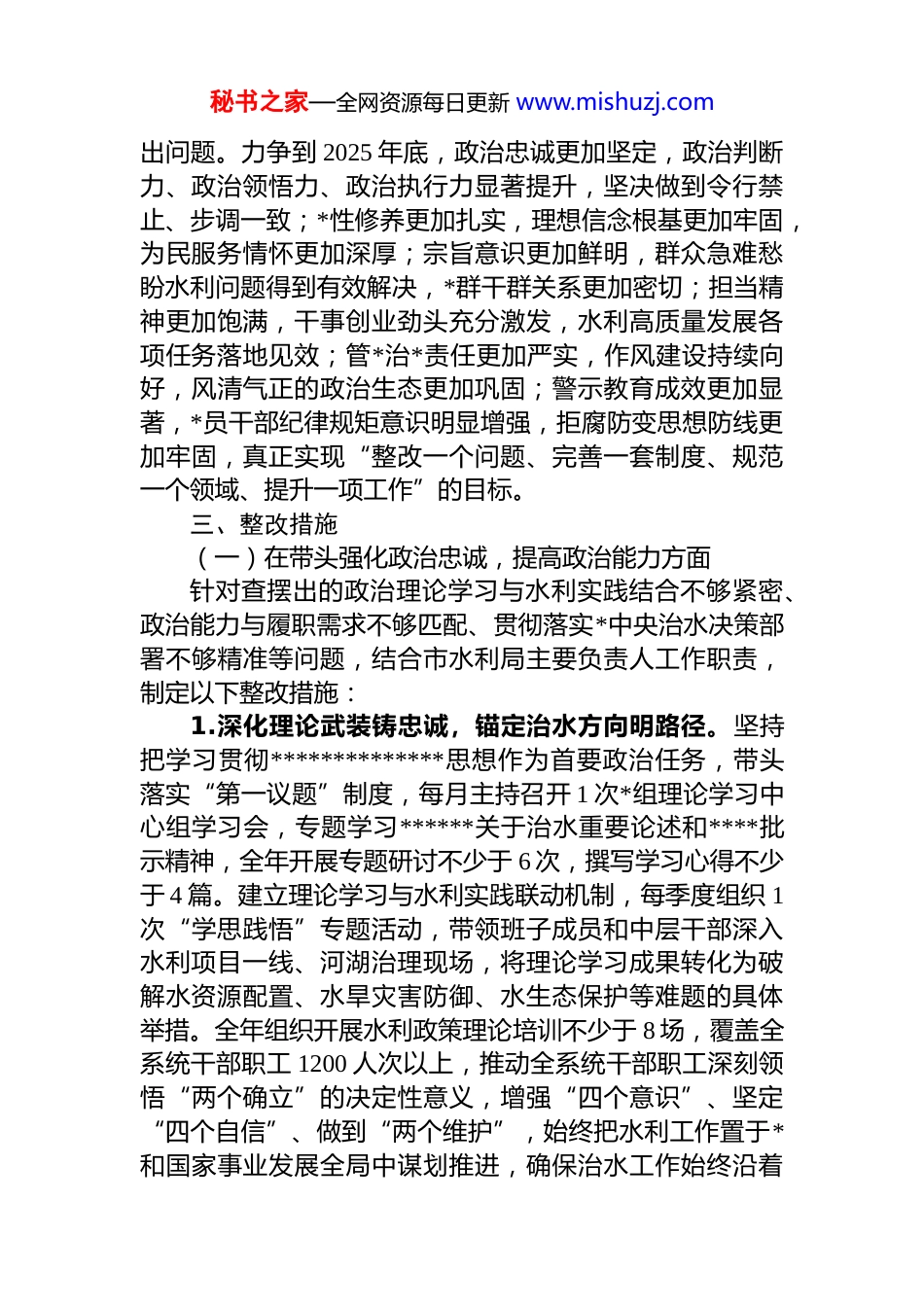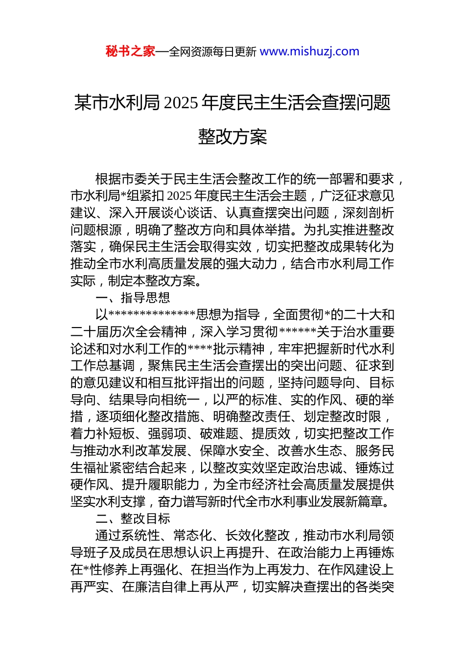 秘书之家—全网资源每日更新 www.mishuzj.com某市水利局 2025 年度民主生活会查摆问题整改方案根据市委关于民主生活会整改工作的统一部署和要求,市水利局*组紧扣 2025 年度民主生活会主题,广泛征求意见建议、深入开展谈心谈话、认真查摆突出问题,深刻剖析问题根源,明确了整改方向和具体举措。为扎实推进整改落实,确保民主生活会取得实效,切实把整改成果转化为推动全市水利高质量发展的强大动力,结合市水利局工作实际,制定本整改方案。一、指导思想以**************思想为指导,全面贯彻*的二十大和二十届历次全会精神,深入学习贯彻******关于治水重要论述和对水利工作的****批示精神,牢牢把握新时代水利工作总基调,聚焦民主生活会查摆出的突出问题、征求到的意见建议和相互批评指出的问题,坚持问题导向、目标导向、结果导向相统一,以严的标准、实的作风、硬的举措,逐项细化整改措施、明确整改责任、划定整改时限,着力补短板、强弱项、破难题、提质效,切实把整改工作与推动水利改革发展、保障水安全、改善水生态、服务民生福祉紧密结合起来,以整改实效坚定政治忠诚、锤炼过硬作风、提升履职能力,为全市经济社会高质量发展提供坚实水利支撑,奋力谱写新时代全市水利事业发展新篇章。二、整改目标通过系统性、常态化、长效化整改,推动市水利局领导班子及成员在思想认识上再提升、在政治能力上再锤炼在*性修养上再强化、在担当作为上再发力、在作风建设上再严实、在廉洁自律上再从严,切实解决查摆出的各类突秘书之家—全网资源每日更新 www.mishuzj.com出问题。力争到 2025 年底,政治忠诚更加坚定,政治判断力、政治领悟力、政治执行力显著提升,坚决做到令行禁止、步调一致;*性修养更加扎实,理想信念根基更加牢固,为民服务情怀更加深厚;宗旨意识更加鲜明,群众急难愁盼水利问题得到有效解决,*群干群关系更加密切;担当精神更加饱满,干事创业劲头充分激发,水利高质量发展各项任务落地见效;管*治*责任更加严实,作风建设持续向好,风清气正的政治生态更加巩固;警示教育成效更加显著,*员干部纪律规矩意识明显增强,拒腐防变思想防线更加牢固,真正实现“整改一个问题、完善一套制度、规范一个领域、提升一项工作”的目标。三、整改措施(一)在带头强化政治忠诚,提高政治能力方面针对查摆出的政治理论学习与水利实践结合不够紧密、政治能力与履职需求不够匹配、贯彻落实*中央治水决策部署不够精准等问题,结合市水利局主要负责人工作职责,制定以下整改措施:1.深化理论武装铸忠诚,锚定治水方向明路径。坚持把学习贯彻**************思想作为首要政治任务,带头落实“第一议题”制度,每月主持召开 1 次*组理论学习中心组学习会,专题学习******关于治水重要论述和****批示精神,全年开展专题研讨不少于 6 次,撰写学习心得不少于 4 篇。建立理论学习与水利实践联动机制,每季度组织 1次“学思践悟”专题活动,带领班子成员和中层干部深入水利项目一线、河湖治理现场,将理论学习成果转化为破解水资源配置、水旱灾害防御、水生态保护等难题的具体举措。全年组织开展水利政策理论培训不少于 8 场,覆盖全系统干部职工 1200 人次以上,推动全系统干部职工深刻领悟“两个确立”的决定性意义,增强“四个意识”、坚定“四个自信”、做到“两个维护”,始终把水利工作置于*和国家事业发展全局中谋划推进,确保治水工作始终沿着秘书之家—全网资源每日更新 www.mishuzj.com正确政治方向前进。2.锤炼政治能力强担当,精准贯彻落实*中央部署。带头提高政治判断力、政治领悟力、政治执行力,每月专题研究 1 次*中央治水决策部署贯彻落实情况,对照上级要求逐项梳理任务清单、责任清单、时限清单,确保各项部署落地落细。建立重大水利工作政治把关机制,对重大水利项目审批、水资源调度、河湖长制落实等重点工作,主动从政治高度分析研判、统筹推进,全年主持召开重点工作政治把关专题会议不少于 12 次。加强政治能力提升培训,每半年组织 1 次全系统政治能力专题培训,带头参与政治素质提升测试,推动班子成员和中层干部不断提高把握...