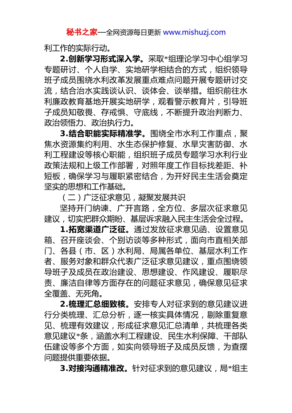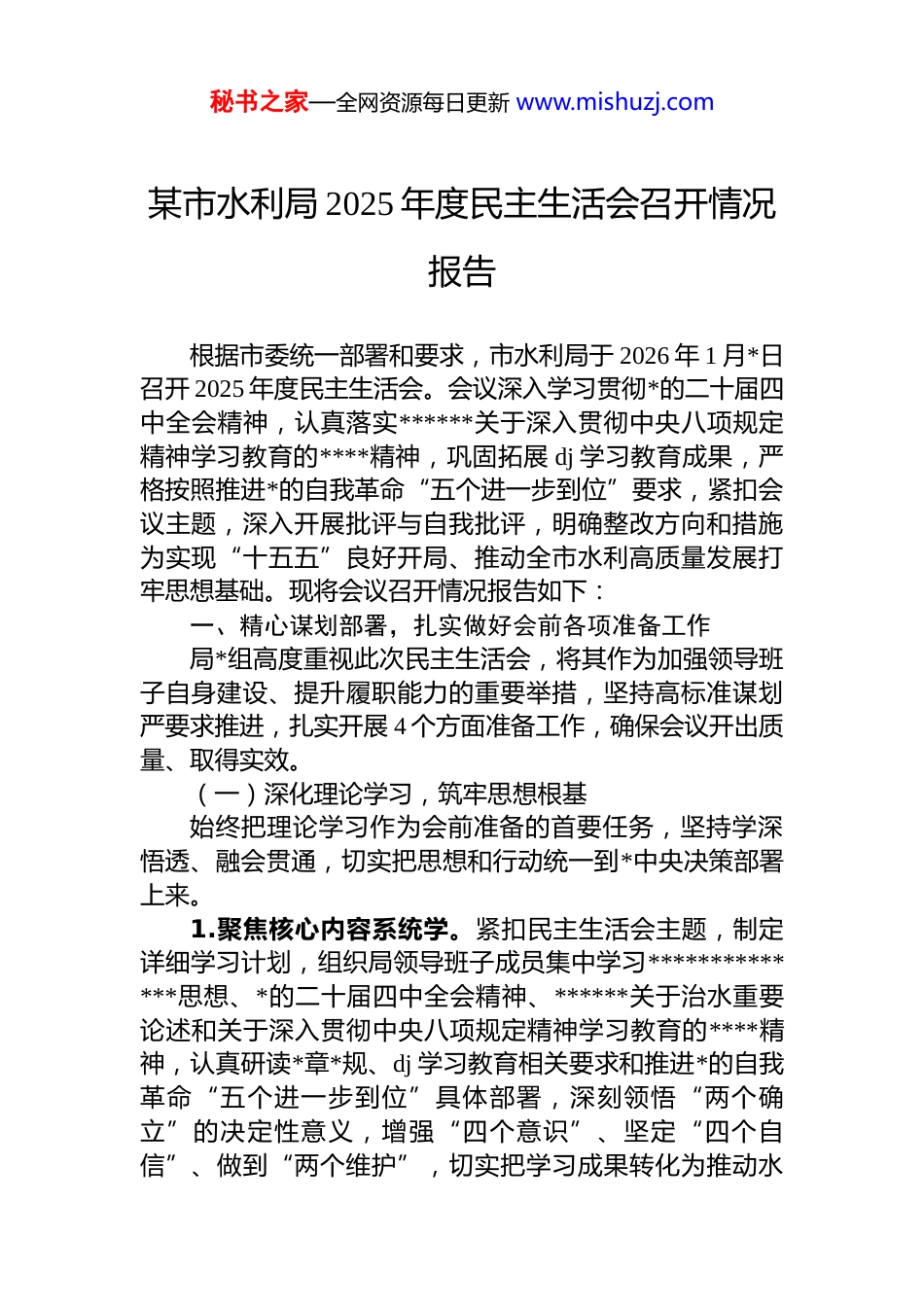 秘书之家—全网资源每日更新 www.mishuzj.com某市水利局 2025 年度民主生活会召开情况报告根据市委统一部署和要求,市水利局于 2026 年 1 月*日召开 2025 年度民主生活会。会议深入学习贯彻*的二十届四中全会精神,认真落实******关于深入贯彻中央八项规定精神学习教育的****精神,巩固拓展 dj 学习教育成果,严格按照推进*的自我革命“五个进一步到位”要求,紧扣会议主题,深入开展批评与自我批评,明确整改方向和措施为实现“十五五”良好开局、推动全市水利高质量发展打牢思想基础。现将会议召开情况报告如下:一、精心谋划部署,扎实做好会前各项准备工作局*组高度重视此次民主生活会,将其作为加强领导班子自身建设、提升履职能力的重要举措,坚持高标准谋划严要求推进,扎实开展 4 个方面准备工作,确保会议开出质量、取得实效。(一)深化理论学习,筑牢思想根基始终把理论学习作为会前准备的首要任务,坚持学深悟透、融会贯通,切实把思想和行动统一到*中央决策部署上来。1.聚焦核心内容系统学。紧扣民主生活会主题,制定详细学习计划,组织局领导班子成员集中学习**************思想、*的二十届四中全会精神、******关于治水重要论述和关于深入贯彻中央八项规定精神学习教育的****精神,认真研读*章*规、dj 学习教育相关要求和推进*的自我革命“五个进一步到位”具体部署,深刻领悟“两个确立”的决定性意义,增强“四个意识”、坚定“四个自信”、做到“两个维护”,切实把学习成果转化为推动水秘书之家—全网资源每日更新 www.mishuzj.com利工作的实际行动。2.创新学习形式深入学。采取*组理论学习中心组学习专题研讨、个人自学、实地研学相结合的方式,组织领导班子成员围绕水利改革发展重点难点问题开展专题研讨交流,结合治水实践谈认识、谈体会、谈举措。组织前往水利廉政教育基地开展实地研学,观看警示教育片,引导班子成员知敬畏、存戒惧、守底线,不断提升政治判断力、政治领悟力、政治执行力。3.结合职能实际精准学。围绕全市水利工作重点,聚焦水资源集约利用、水生态保护修复、水旱灾害防御、水利工程建设等核心职能,组织班子成员专题学习水利行业政策法规和上级工作部署,对照年度工作目标找差距、补短板,确保学习与履职紧密结合,为开好民主生活会奠定坚实的思想和工作基础。(二)广泛征求意见,凝聚发展共识坚持开门纳谏、广开言路,全方位、多层次征求意见建议,切实把群众期盼、基层诉求融入民主生活会全过程。1.拓宽渠道广泛征。通过发放征求意见函、设置意见箱、召开座谈会、个别访谈等多种形式,面向市直相关部门、各县(市、区)水利局、局属各单位、基层水利工作者、服务对象和群众代表广泛征求意见建议,重点围绕领导班子及成员在政治建设、思想建设、作风建设、履职尽责、廉洁自律等方面存在的问题征求意见,确保意见征求全覆盖、无死角。2.梳理汇总细致核。安排专人对征求到的意见建议进行分类梳理、汇总分析,逐一核实具体情况,剔除重复意见、梳理有效建议,形成征求意见汇总清单,共梳理各类意见建议*条,涵盖水利工程建设、民生水利保障、干部队伍建设等多个方面,如实向领导班子及成员反馈,为查摆问题提供重要依据。3.对接沟通精准改。针对征求到的意见建议,局*组主秘书之家—全网资源每日更新 www.mishuzj.com动与相关单位和群众对接沟通,说明情况、解读政策,对能够立即解决的当场回应、迅速整改,对需要长期推进的明确整改方向、细化推进举措,切实把群众意见转化为改进工作的具体行动,凝聚起推动水利高质量发展的强大合力。(三)深入谈心谈话,增进班子团结严格落实谈心谈话要求,坚持坦诚相见、推心置腹,通过深入谈心谈话化解矛盾、凝聚共识,为开展批评与自我批评做好铺垫。1.坚持分级分类谈。按照“主要负责同志与班子成员必谈、班子成员之间必谈、班子成员与分管科室及局属单位主要负责同志必谈、班子成员与本人组织关系所在*支部*员代表必谈”的要求,开展全覆盖谈心谈话,确保谈话不走过场、取得实效。局*组书记主动与每位班子成员谈心谈话,带头查摆问题、听取意见,班子成员之间相互交流思想、沟通...