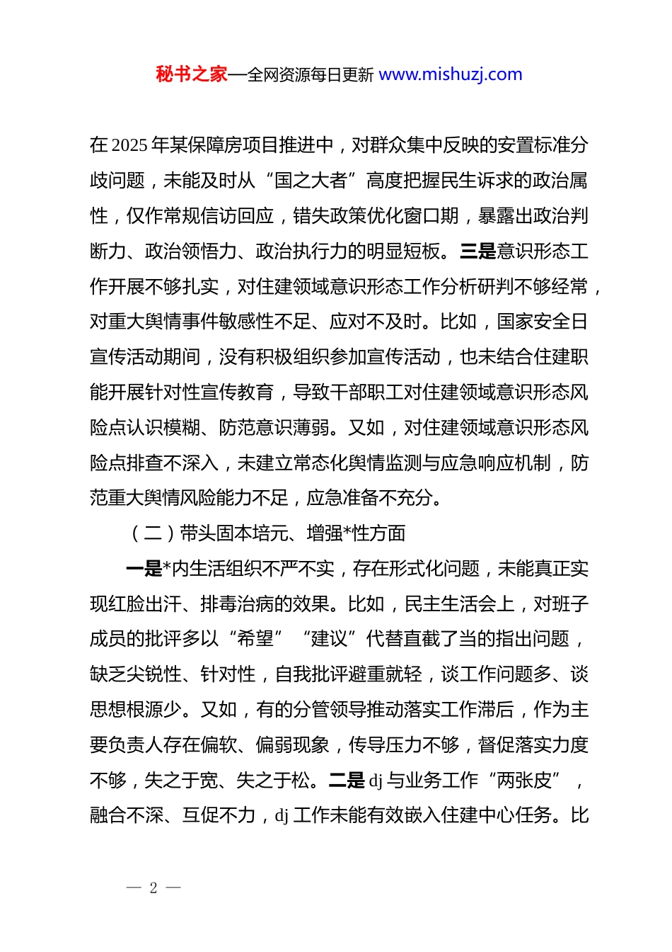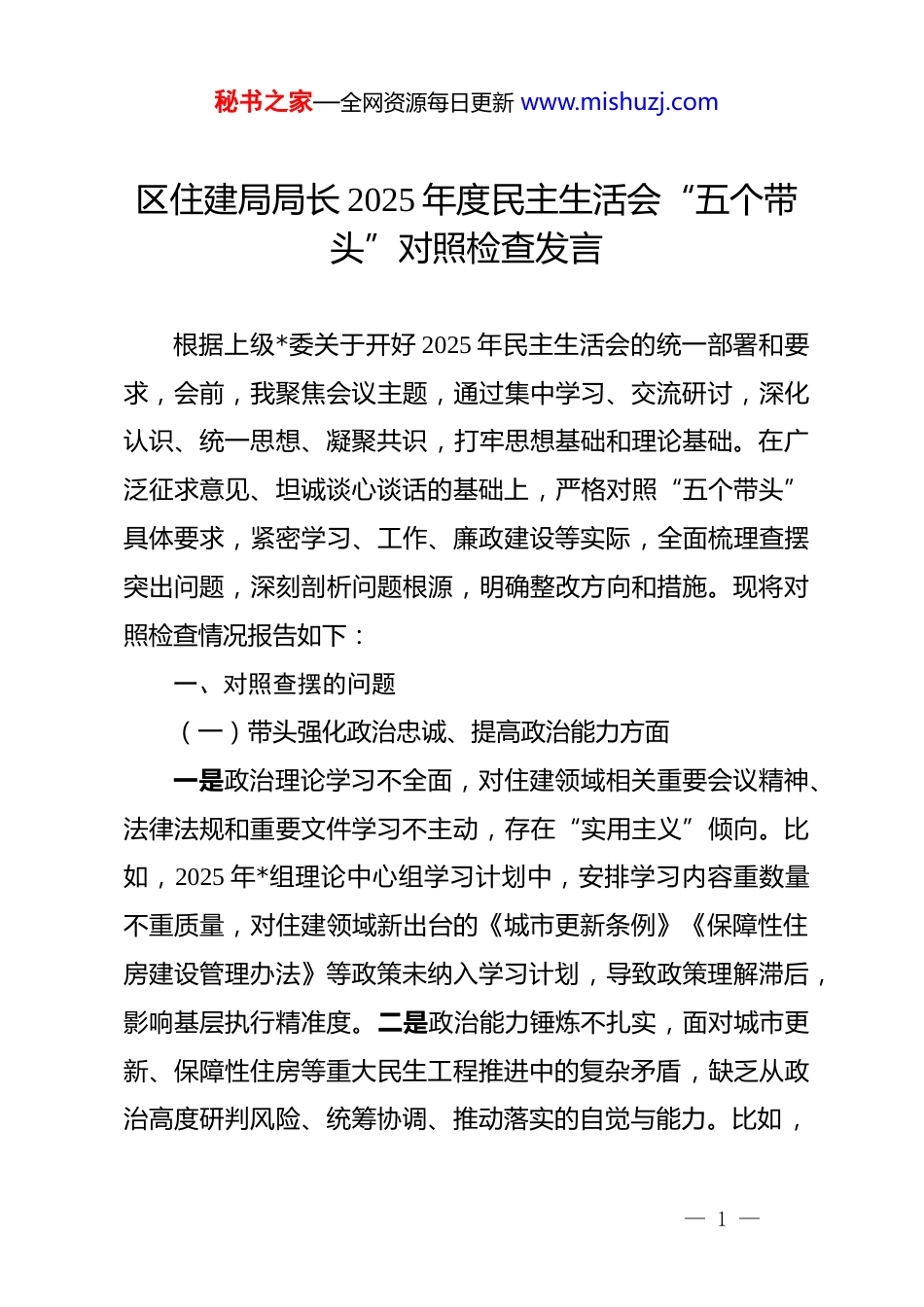 秘书之家—全网资源每日更新 www.mishuzj.com区住建局局长 2025 年度民主生活会“五个带头”对照检查发言根据上级*委关于开好 2025 年民主生活会的统一部署和要求,会前,我聚焦会议主题,通过集中学习、交流研讨,深化认识、统一思想、凝聚共识,打牢思想基础和理论基础。在广泛征求意见、坦诚谈心谈话的基础上,严格对照“五个带头”具体要求,紧密学习、工作、廉政建设等实际,全面梳理查摆突出问题,深刻剖析问题根源,明确整改方向和措施。现将对照检查情况报告如下:一、对照查摆的问题 (一)带头强化政治忠诚、提高政治能力方面一是政治理论学习不全面,对住建领域相关重要会议精神、法律法规和重要文件学习不主动,存在“实用主义”倾向。比如,2025 年*组理论中心组学习计划中,安排学习内容重数量不重质量,对住建领域新出台的《城市更新条例》《保障性住房建设管理办法》等政策未纳入学习计划,导致政策理解滞后,影响基层执行精准度。二是政治能力锤炼不扎实,面对城市更新、保障性住房等重大民生工程推进中的复杂矛盾,缺乏从政治高度研判风险、统筹协调、推动落实的自觉与能力。比如,— 1 —秘书之家—全网资源每日更新 www.mishuzj.com在 2025 年某保障房项目推进中,对群众集中反映的安置标准分歧问题,未能及时从“国之大者”高度把握民生诉求的政治属性,仅作常规信访回应,错失政策优化窗口期,暴露出政治判断力、政治领悟力、政治执行力的明显短板。三是意识形态工作开展不够扎实,对住建领域意识形态工作分析研判不够经常,对重大舆情事件敏感性不足、应对不及时。比如,国家安全日宣传活动期间,没有积极组织参加宣传活动,也未结合住建职能开展针对性宣传教育,导致干部职工对住建领域意识形态风险点认识模糊、防范意识薄弱。又如,对住建领域意识形态风险点排查不深入,未建立常态化舆情监测与应急响应机制,防范重大舆情风险能力不足,应急准备不充分。(二)带头固本培元、增强*性方面一是*内生活组织不严不实,存在形式化问题,未能真正实现红脸出汗、排毒治病的效果。比如,民主生活会上,对班子成员的批评多以“希望”“建议”代替直截了当的指出问题,缺乏尖锐性、针对性,自我批评避重就轻,谈工作问题多、谈思想根源少。又如,有的分管领导推动落实工作滞后,作为主要负责人存在偏软、偏弱现象,传导压力不够,督促落实力度不够,失之于宽、失之于松。二是 dj 与业务工作“两张皮”,融合不深、互促不力,dj 工作未能有效嵌入住建中心任务。比— 2 —秘书之家—全网资源每日更新 www.mishuzj.com如,2025 年城市更新攻坚行动中,*支部未围绕项目难点设立*员责任区、示范岗,组织生活与项目调度、群众协调脱节。三是运用*的创新理论指导实践不够深入,破解复杂问题时仍习惯沿用传统路径,工作缺乏创新突破的韧性与系统思维。比如,在破解住房保障、老旧小区改造等民生痛点难点问题时,习惯用老思维思考问题,过度强调客观条件限制,对新政策研究不深入,导致政策落地的针对性和可操作性不足。(三)带头敬畏人民、敬畏组织、敬畏法纪方面一是营商环境工作重视程度不够,对“放管服”改革的系统性、协同性推进乏力,审批流程优化滞后于企业群众期盼。比如,在办理“获得用水用气”和“办理建筑许可”方面,存在环节冗余、材料重复提交问题,跨部门数据共享机制尚未健全,导致企业平均办理时限较长。二是工作监管不到位,部分工程违规施工的情况未及时进行处罚。例如,在扬尘治理方面,检查力度不足,未能及时发现施工现场违规行为,致使扬尘污染问题反复发生,群众投诉较多。对发现的问题多以口头提醒为主,缺乏刚性执法措施,未能形成有效震慑。三是部分执法行为不规范,执法人员法治意识不强,存在选择性执法、随意裁量现象。比如,对同一类违法行为,不同执法人员处罚标准不一,自由裁量权行使缺乏统一指引和内部监督;个别案件存— 3 —秘书之家—全网资源每日更新 www.mishuzj.com在证据固定不全、程序倒置等问题,影响执法公信力与合法性。(四)带头干事创业、担当作为方面一是风险意识不强,面对复杂局面和突发问题...