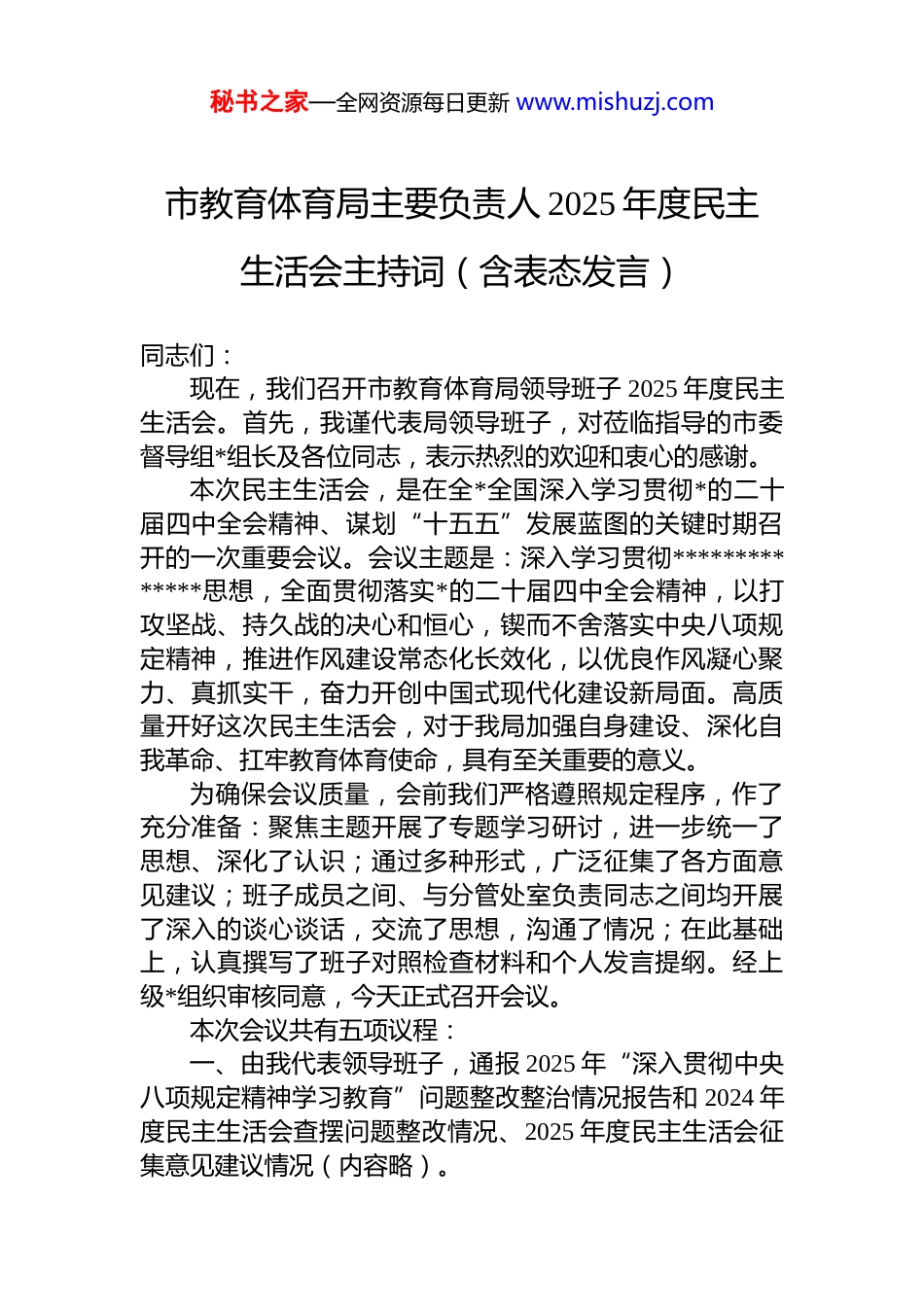秘书之家—全网资源每日更新 www.mishuzj.com市教育体育局主要负责人 2025 年度民主生活会主持词(含表态发言)同志们:现在,我们召开市教育体育局领导班子 2025 年度民主生活会。首先,我谨代表局领导班子,对莅临指导的市委督导组*组长及各位同志,表示热烈的欢迎和衷心的感谢。本次民主生活会,是在全*全国深入学习贯彻*的二十届四中全会精神、谋划“十五五”发展蓝图的关键时期召开的一次重要会议。会议主题是:深入学习贯彻**************思想,全面贯彻落实*的二十届四中全会精神,以打攻坚战、持久战的决心和恒心,锲而不舍落实中央八项规定精神,推进作风建设常态化长效化,以优良作风凝心聚力、真抓实干,奋力开创中国式现代化建设新局面。高质量开好这次民主生活会,对于我局加强自身建设、深化自我革命、扛牢教育体育使命,具有至关重要的意义。为确保会议质量,会前我们严格遵照规定程序,作了充分准备:聚焦主题开展了专题学习研讨,进一步统一了思想、深化了认识;通过多种形式,广泛征集了各方面意见建议;班子成员之间、与分管处室负责同志之间均开展了深入的谈心谈话,交流了思想,沟通了情况;在此基础上,认真撰写了班子对照检查材料和个人发言提纲。经上级*组织审核同意,今天正式召开会议。本次会议共有五项议程:一、由我代表领导班子,通报 2025 年“深入贯彻中央八项规定精神学习教育”问题整改整治情况报告和 2024 年度民主生活会查摆问题整改情况、2025 年度民主生活会征集意见建议情况(内容略)。秘书之家—全网资源每日更新 www.mishuzj.com二、由我代表领导班子作检视剖析发言(内容略)。三、班子成员逐一进行个人对照检查发言,并接受其他同志的批评。四、请*同志(督导组组长)进行点评讲话。五、由我代表领导班子进行表态讲话。现在,进行会议第一项议程……(……第二、三、四项议程依序进行……)刚才,督导组*组长作了非常重要的点评讲话,充分肯定了本次民主生活会的成效,也精准指出了我们存在的问题与不足,并对下一步整改落实和班子建设提出了明确要求,具有很强的政治性、指导性和针对性。我们诚恳接受照单全收,并将坚决贯彻落实到后续整改和各项工作中。下面,进行会议最后一项议程,由我代表局领导班子作表态发言。一、筑牢政治忠诚,在深化理论武装上持续用力、久久为功督导组提出的意见,首要一点就是要求我们进一步强化理论武装、把稳政治方向。我们将把此作为整改的“第一课题”。“在干部干好工作所需的各种能力中,政治能力是第一位的。”我们将始终坚持把*的政治建设摆在首位,将学习贯彻**************思想,特别是******关于*的建设、*的自我革命、教育强国、体育强国的重要论述作为终身课题。不仅要在“学懂”上更深一层,更要在“弄通”和“做实”上狠下功夫,深刻领悟“两个确立”的决定性意义,坚决做到“两个维护”。我们将自觉把教育体育工作置于全市、全省乃至全国发展大局中审视谋划,确保*中央的所有决策部署、省委市委的工作要求,在市教育体育系统不折不扣、雷厉风行地得到贯彻执行,以绝对的政治忠诚履行为*育人、为国育才的神圣职责。二、扛起整改责任,在推动问题清仓见底上动真碰硬、务求实效秘书之家—全网资源每日更新 www.mishuzj.com发现问题、直面问题是起点,解决问题、巩固成效才是关键。针对本次民主生活会查摆出的问题、征集到的意见以及督导组指出的不足,我们将坚决摒弃“过关”思想立即启动全面整改。我们将严格实行“清单化管理、台账式推进、销号制落实”,由我负总责,班子成员各司其职逐条制定整改措施,明确整改时限与责任人。整改过程坚持“当下改”与“长久立”相结合,对能够立即解决的,立行立改;对需要阶段推进的,限时整改;对需长期坚持的,建章立制。我们将以“钉钉子”精神,一锤接着一锤敲,确保每一个问题都整改到位、取得实效,并适时公开整改情况,主动接受*员干部和师生群众的监督,决不允许问题“年年提、年年改、年年在”。三、聚焦主责主业,在服务发展大局上深化改革、攻坚克难民主生活会的成效,最终要体现在推动事业发展、增进人民福祉上。我们将以此次...