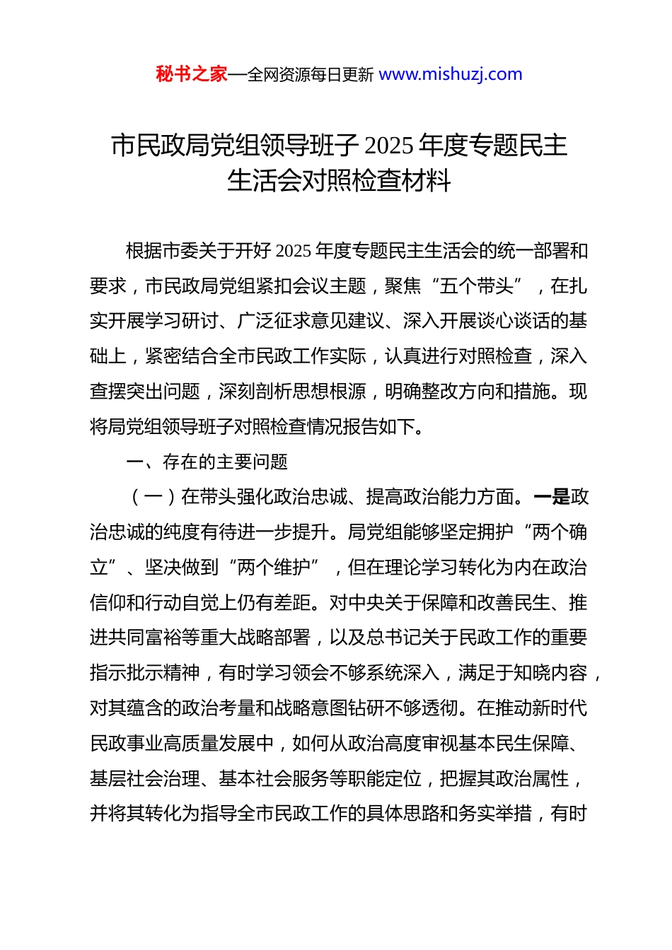 秘书之家—全网资源每日更新 www.mishuzj.com市民政局党组领导班子 2025 年度专题民主生活会对照检查材料 根据市委关于开好 2025 年度专题民主生活会的统一部署和要求,市民政局党组紧扣会议主题,聚焦“五个带头”,在扎实开展学习研讨、广泛征求意见建议、深入开展谈心谈话的基础上,紧密结合全市民政工作实际,认真进行对照检查,深入查摆突出问题,深刻剖析思想根源,明确整改方向和措施。现将局党组领导班子对照检查情况报告如下。一、存在的主要问题(一)在带头强化政治忠诚、提高政治能力方面。一是政治忠诚的纯度有待进一步提升。局党组能够坚定拥护“两个确立”、坚决做到“两个维护”,但在理论学习转化为内在政治信仰和行动自觉上仍有差距。对中央关于保障和改善民生、推进共同富裕等重大战略部署,以及总书记关于民政工作的重要指示批示精神,有时学习领会不够系统深入,满足于知晓内容,对其蕴含的政治考量和战略意图钻研不够透彻。在推动新时代民政事业高质量发展中,如何从政治高度审视基本民生保障、基层社会治理、基本社会服务等职能定位,把握其政治属性,并将其转化为指导全市民政工作的具体思路和务实举措,有时秘书之家—全网资源每日更新 www.mishuzj.com思考不够深、转化不够快,政治判断力、政治领悟力、政治执行力与上级要求相比还存在提升空间。二是政治能力的实践运用有待加强。面对当前民政领域社会救助精准化、养老服务多元化、基层治理现代化等复杂课题和潜在风险,局党组从政治全局出发分析研判、驾驭复杂局面的能力需进一步增强。例如,在推进社会救助制度改革、应对可能出现的舆情风险,或者在处理历史遗留的信访积案、协调跨部门民生政策衔接等难题时,有时前瞻性预判不足,应对方案的政治考量不够周全,未能完全做到见微知著、防患未然。将政治要求全方位融入民政业务工作全链条、各环节的自觉性不够强,有时存在业务工作与政治建设结合不够紧密的现象。(二)在带头固本培元、增强党性方面。一是理论武装的深度和系统性不足。学习党的创新理论有时存在“实用主义”倾向,与民政业务直接相关的内容学习较多,对马克思主义基本原理及其中国化时代化的最新成果进行整体性、贯通性学习研究不够,缺乏“挤”和“钻”的精神。集中学习安排多,个人静下心来读原著、学原文、悟原理,撰写有深度、有见解的心得体会较少。运用科学理论改造主观世界、锤炼坚强党性的自觉性、主动性有待加强,导致在面对新形势新挑战时,理想信念这个“压舱石”筑得不够牢固,运用党的立场观点方法解秘书之家—全网资源每日更新 www.mishuzj.com决实际问题的能力有待提升。二是党性修养锤炼的主动性有所减弱。局党组班子成员能够参加党的组织生活,但有时存在“事务化”倾向,将组织生活等同于一般工作会议。在运用批评和自我批评武器时,“辣味”不足,自我批评有时避重就轻、遮遮掩掩,相互批评多以工作建议代替思想交锋,“好人主义”思想尚未根除。对照党章党规党纪进行自我检视、自我净化、自我革新不够经常、不够严格。在传承民政系统“孺子牛”精神,保持艰苦奋斗、无私奉献的政治本色方面,示范引领作用发挥不够充分。面对日益繁重的民生保障任务和改革压力,有时会产生畏难情绪或歇脚思想,攻坚克难的锐气和韧劲有所消退。(三)在带头敬畏人民、敬畏组织、敬畏法纪方面。一是敬畏人民,但为民服务情怀需进一步厚植。局党组始终坚持以人民为中心的发展思想,但在具体实践中,“从群众中来、到群众中去”的优良传统发扬不够充分。深入基层、深入群众开展调研,有时存在“走马观花”“蜻蜓点水”现象,习惯于听汇报、看“盆景”,随机走访、蹲点调研少,与困难群众、服务对象面对面、心贴心交流不够深入。对群众通过信访、热线等渠道反映的“急难愁盼”问题,虽然能够及时受理,但在推动问题实质性解决、跟踪问效、形成闭环管理上力度不够,有秘书之家—全网资源每日更新 www.mishuzj.com些问题未能从根源上得到化解,与群众对美好生活的新期待存在差距,未能始终将群众满意度作为检验民政工作的最高标准。二是敬畏组织,但组织观念需进一步强化。能够自...