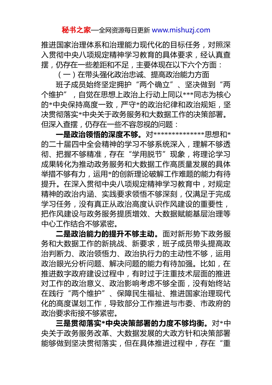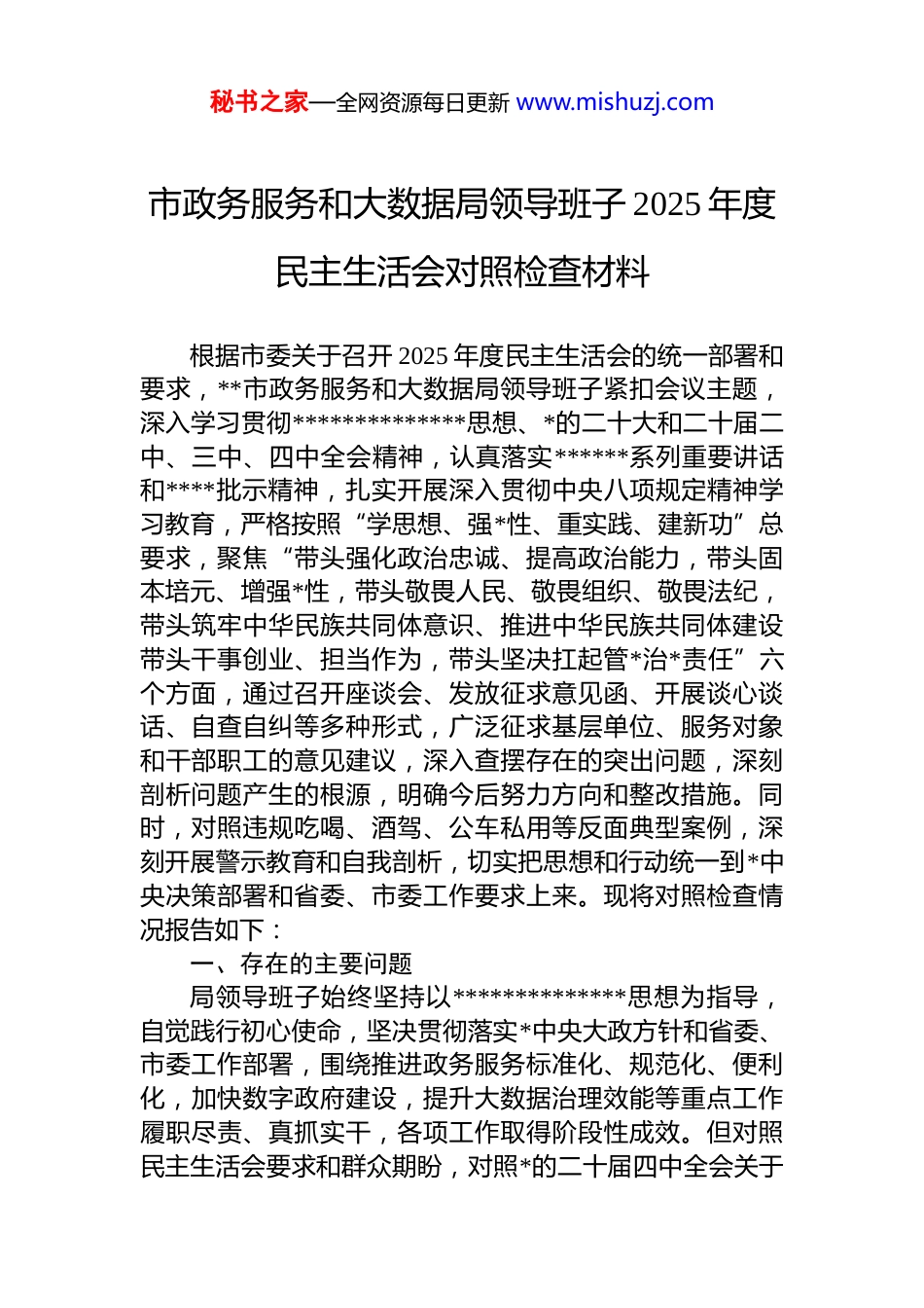 秘书之家—全网资源每日更新 www.mishuzj.com市政务服务和大数据局领导班子 2025 年度民主生活会对照检查材料根据市委关于召开 2025 年度民主生活会的统一部署和要求,**市政务服务和大数据局领导班子紧扣会议主题,深入学习贯彻**************思想、*的二十大和二十届二中、三中、四中全会精神,认真落实******系列重要讲话和****批示精神,扎实开展深入贯彻中央八项规定精神学习教育,严格按照“学思想、强*性、重实践、建新功”总要求,聚焦“带头强化政治忠诚、提高政治能力,带头固本培元、增强*性,带头敬畏人民、敬畏组织、敬畏法纪,带头筑牢中华民族共同体意识、推进中华民族共同体建设带头干事创业、担当作为,带头坚决扛起管*治*责任”六个方面,通过召开座谈会、发放征求意见函、开展谈心谈话、自查自纠等多种形式,广泛征求基层单位、服务对象和干部职工的意见建议,深入查摆存在的突出问题,深刻剖析问题产生的根源,明确今后努力方向和整改措施。同时,对照违规吃喝、酒驾、公车私用等反面典型案例,深刻开展警示教育和自我剖析,切实把思想和行动统一到*中央决策部署和省委、市委工作要求上来。现将对照检查情况报告如下:一、存在的主要问题局领导班子始终坚持以**************思想为指导,自觉践行初心使命,坚决贯彻落实*中央大政方针和省委、市委工作部署,围绕推进政务服务标准化、规范化、便利化,加快数字政府建设,提升大数据治理效能等重点工作履职尽责、真抓实干,各项工作取得阶段性成效。但对照民主生活会要求和群众期盼,对照*的二十届四中全会关于秘书之家—全网资源每日更新 www.mishuzj.com推进国家治理体系和治理能力现代化的目标任务,对照深入贯彻中央八项规定精神学习教育的具体要求,经认真查摆,仍存在一些差距和不足,主要体现在以下六个方面:(一)在带头强化政治忠诚、提高政治能力方面班子成员始终坚定拥护“两个确立”、坚决做到“两个维护”,自觉在思想上政治上行动上同以***同志为核心的*中央保持高度一致,严守*的政治纪律和政治规矩,坚决贯彻落实*中央关于政务服务和大数据工作的决策部署。但深入查摆,仍存在一些不容忽视的问题:一是政治领悟的深度不够。对**************思想和*的二十届四中全会精神的学习不够系统深入,理解不够透彻、把握不够精准,存在“学用脱节”现象,将理论学习成果转化为推动政务服务和大数据工作高质量发展的具体举措不够有力,运用*的创新理论破解工作难题的能力有待提升。在深入贯彻中央八项规定精神学习教育中,对规定精神的政治内涵、实践要求领悟不够深刻,仅满足于完成学习任务,没有真正从政治高度认识作风建设的重要性,把作风建设与政务服务提质增效、大数据赋能基层治理等中心工作结合不够紧密。二是政治能力的提升不够主动。面对新形势下政务服务和大数据工作的新挑战、新要求,班子成员带头提高政治判断力、政治领悟力、政治执行力的主动性不够,运用政治眼光分析问题、解决问题的能力有待加强。比如,在推进数字政府建设过程中,有时过于注重技术层面的推进对工作的政治意义、政治影响考虑不够全面,没有始终站在践行“两个维护”、保障民生福祉、推进国家治理现代化的高度谋划工作,导致部分工作推进与市委、市政府的政治要求衔接不够紧密。三是贯彻落实*中央决策部署的力度不够均衡。对*中央关于政务服务改革、大数据发展的大政方针和决策部署能够做到坚决贯彻落实,但在具体推进过程中,存在“重秘书之家—全网资源每日更新 www.mishuzj.com部署、轻落实”“重形式、轻实效”的现象,部分工作推进缓慢、成效不够明显。比如,在落实关于“推进政务服务一网通办、一窗通办”的部署要求时,虽然制定了实施方案、明确了工作时限,但在统筹协调、督促检查方面力度不足,部分跨部门、跨领域的政务服务事项仍存在办理流程繁琐、数据共享不充分等问题,没有真正实现“让数据多跑路、群众少跑腿”的目标。同时,在贯彻落实中央八项规定精神过程中,对一些细节问题重视不够,比如在政务服务窗口作风建设上,仍有个别工作人员存在态度生硬、办事效率不高的问题,没有真正把规定精神落...