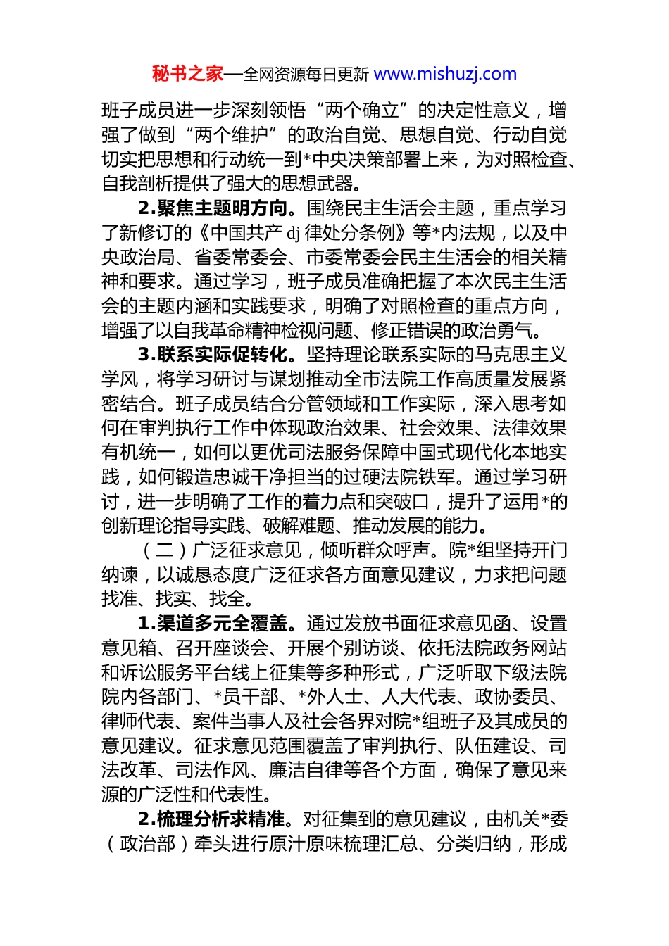 秘书之家—全网资源每日更新 www.mishuzj.com市中级人民法院*组关于 2025 年度民主生活会召开情况的报告市委:根据中央、省委和市委的统一部署,市中级人民法院*组于 2026 年*月*日召开了 2025 年度民主生活会。本次会议紧扣“深入学习贯彻**************思想,全面贯彻落实*的二十届四中全会精神,以打好攻坚战、持久战的决心和恒心,锲而不舍落实中央八项规定精神,推进作风建设常态化长效化,以优良作风凝心聚力、真抓实干,奋力开创中国式现代化建设新局面”主题,严格对标对表上级要求精心组织安排,严肃认真开展批评与自我批评,达到了统一思想、增进团结、改进工作、强化担当的预期目的。现将具体情况报告如下。一、会前准备情况为确保民主生活会开出高质量、好效果,院*组坚持高标准、严要求,扎实做好各项会前准备工作,为会议成功召开奠定了坚实的思想基础、组织基础和群众基础。(一)深化理论武装,筑牢思想根基。院*组坚持将理论学习作为开好民主生活会的首要环节,着力在学懂弄通做实上下功夫。1.系统学习聚共识。*组班子采取集体研讨与个人自学相结合、专题辅导与原文研读相促进的方式,系统重温*的二十大和二十届历次全会精神,深学细悟******关于*的建设的重要思想、关于*的自我革命的重要战略思想、关于严肃*内政治生活的重要论述以及关于政法工作、法院工作的****精神,特别是关于锲而不舍落实中央八项规定精神、推进作风建设常态化长效化的重要要求。通过深入学习,秘书之家—全网资源每日更新 www.mishuzj.com班子成员进一步深刻领悟“两个确立”的决定性意义,增强了做到“两个维护”的政治自觉、思想自觉、行动自觉切实把思想和行动统一到*中央决策部署上来,为对照检查、自我剖析提供了强大的思想武器。2.聚焦主题明方向。围绕民主生活会主题,重点学习了新修订的《中国共产 dj 律处分条例》等*内法规,以及中央政治局、省委常委会、市委常委会民主生活会的相关精神和要求。通过学习,班子成员准确把握了本次民主生活会的主题内涵和实践要求,明确了对照检查的重点方向,增强了以自我革命精神检视问题、修正错误的政治勇气。3.联系实际促转化。坚持理论联系实际的马克思主义学风,将学习研讨与谋划推动全市法院工作高质量发展紧密结合。班子成员结合分管领域和工作实际,深入思考如何在审判执行工作中体现政治效果、社会效果、法律效果有机统一,如何以更优司法服务保障中国式现代化本地实践,如何锻造忠诚干净担当的过硬法院铁军。通过学习研讨,进一步明确了工作的着力点和突破口,提升了运用*的创新理论指导实践、破解难题、推动发展的能力。(二)广泛征求意见,倾听群众呼声。院*组坚持开门纳谏,以诚恳态度广泛征求各方面意见建议,力求把问题找准、找实、找全。1.渠道多元全覆盖。通过发放书面征求意见函、设置意见箱、召开座谈会、开展个别访谈、依托法院政务网站和诉讼服务平台线上征集等多种形式,广泛听取下级法院院内各部门、*员干部、*外人士、人大代表、政协委员、律师代表、案件当事人及社会各界对院*组班子及其成员的意见建议。征求意见范围覆盖了审判执行、队伍建设、司法改革、司法作风、廉洁自律等各个方面,确保了意见来源的广泛性和代表性。2.梳理分析求精准。对征集到的意见建议,由机关*委(政治部)牵头进行原汁原味梳理汇总、分类归纳,形成秘书之家—全网资源每日更新 www.mishuzj.com详细的问题清单。院*组召开专题会议,对清单进行集体“会诊”,逐条分析研判,剔除与事实不符或过于笼统的意见,聚焦群众反映强烈、制约法院发展的突出问题和班子成员存在的具体问题,确保征求到的意见真实反映民意切中要害。3.主动认领不回避。将梳理出的意见建议及时反馈给*组班子和每位成员。班子成员本着有则改之、无则加勉的态度,主动对照检查,将自己摆进去、将职责摆进去、将工作摆进去,对号入座、深入反思,将征求到的意见建议作为撰写对照检查材料和开展批评与自我批评的重要依据为精准画像、深刻剖析提供了丰富素材。(三)深入谈心谈话,增进思想交流。院*组严格按照“四必谈”要求,扎实开展多层次、全覆盖的谈心谈话...
