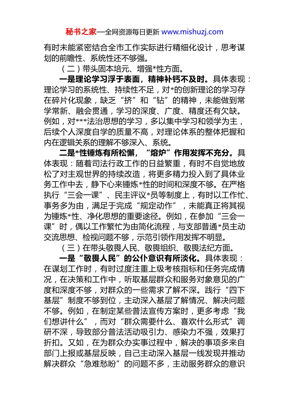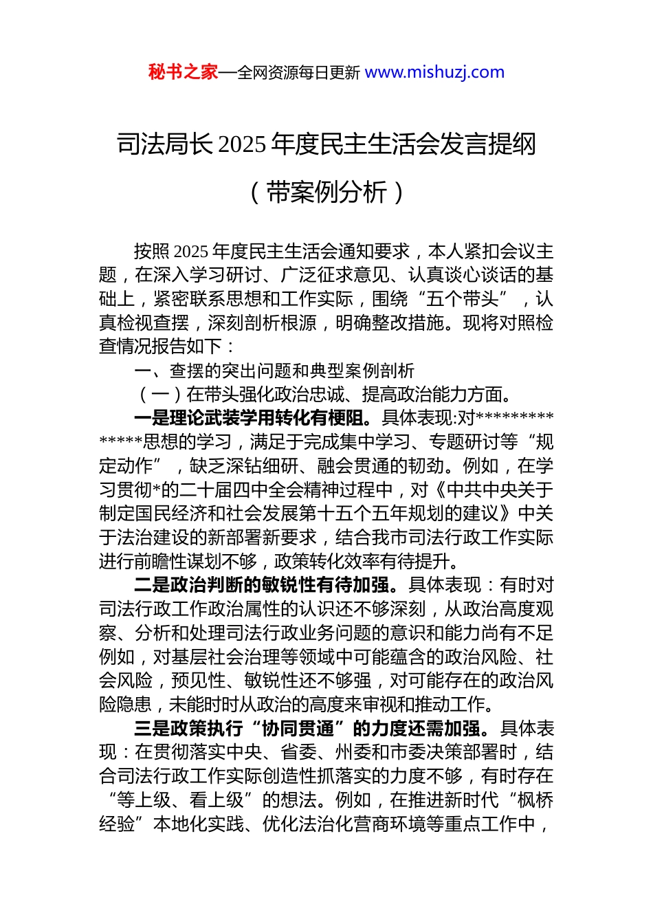 秘书之家—全网资源每日更新 www.mishuzj.com司法局长 2025 年度民主生活会发言提纲(带案例分析)按照 2025 年度民主生活会通知要求,本人紧扣会议主题,在深入学习研讨、广泛征求意见、认真谈心谈话的基础上,紧密联系思想和工作实际,围绕“五个带头”,认真检视查摆,深刻剖析根源,明确整改措施。现将对照检查情况报告如下:一、查摆的突出问题和典型案例剖析(一)在带头强化政治忠诚、提高政治能力方面。一是理论武装学用转化有梗阻。具体表现:对**************思想的学习,满足于完成集中学习、专题研讨等“规定动作”,缺乏深钻细研、融会贯通的韧劲。例如,在学习贯彻*的二十届四中全会精神过程中,对《中共中央关于制定国民经济和社会发展第十五个五年规划的建议》中关于法治建设的新部署新要求,结合我市司法行政工作实际进行前瞻性谋划不够,政策转化效率有待提升。二是政治判断的敏锐性有待加强。具体表现:有时对司法行政工作政治属性的认识还不够深刻,从政治高度观察、分析和处理司法行政业务问题的意识和能力尚有不足例如,对基层社会治理等领域中可能蕴含的政治风险、社会风险,预见性、敏锐性还不够强,对可能存在的政治风险隐患,未能时时从政治的高度来审视和推动工作。三是政策执行“协同贯通”的力度还需加强。具体表现:在贯彻落实中央、省委、州委和市委决策部署时,结合司法行政工作实际创造性抓落实的力度不够,有时存在“等上级、看上级”的想法。例如,在推进新时代“枫桥经验”本地化实践、优化法治化营商环境等重点工作中,秘书之家—全网资源每日更新 www.mishuzj.com有时未能紧密结合全市工作实际进行精细化设计,思考谋划的前瞻性、系统性还不够强。(二)带头固本培元、增强*性方面。一是理论学习浮于表面,精神补钙不及时。具体表现:理论学习的系统性、持续性不足,对*的创新理论的学习存在碎片化现象,缺乏“挤”和“钻”的精神,未能做到常学常新、融会贯通,学习的深度、广度、精度还有欠缺。例如,对***法治思想的学习,多以集中学习和领学为主,后续个人深度自学的质量不高,对理论体系的整体把握和内在逻辑关系的理解不够深入、系统。二是*性锤炼有所松懈,“熔炉”作用发挥不充分。具体表现:随着司法行政工作的日益繁重,有时不自觉地放松了对主观世界的持续改造,将更多精力投入到了具体业务工作中去,静下心来锤炼*性的时间和深度不够。在严格执行“三会一课”、民主评议*员等制度上,有时以工作忙、事务多为由,满足于完成“规定动作”,未能真正将其视为锤炼*性、净化思想的重要途径。例如,在参加“三会一课”时,偶以工作繁忙为由简化流程,与支部普通*员主动交流思想、检视问题不够,示范引领作用发挥不明显。(三)在带头敬畏人民、敬畏组织、敬畏法纪方面。一是“敬畏人民”的公仆意识有所淡化。具体表现:在谋划工作时,有时过度注重上级考核指标和任务完成情况,在决策和工作中,听取基层群众和服务对象意见的广度和深度不够,对群众的一些需求了解不深。践行“四下基层”制度不够到位,主动深入基层了解情况、解决问题不够。例如,在制定某些普法宣传方案时,更多考虑“我们想讲什么”,而对“群众需要什么、喜欢什么形式”调研不深,导致部分普法活动吸引力、感染力不强,效果打折扣。又如,在为群众办实事过程中,解决的事项多来自部门上报或基层反映,自己主动深入基层一线发现并推动解决群众“急难愁盼”的问题不多,主动服务群众的意识秘书之家—全网资源每日更新 www.mishuzj.com不强。二是“敬畏组织”的规矩意识有待提升。具体表现:在推动工作落实过程中,有时过于强调效率和速度,对严格执行组织程序的重要性认识不足,对一些程序性要求执行不够到位,执行标准把握不够精准。例如,在开展社区矫正执法、公证办理、行政复议、矛盾纠纷化解等工作中有时存在“重结果、轻过程”的倾向,对工作中的困难和问题向组织汇报不够及时、全面。在贯彻执行“三重一大”集体决策制度时,对重大活动经费使用、重要岗位人事调整等事项,有时因时间紧张,给班子成员预留的思考讨论时间不足,客观上弱化了“三重一大”...