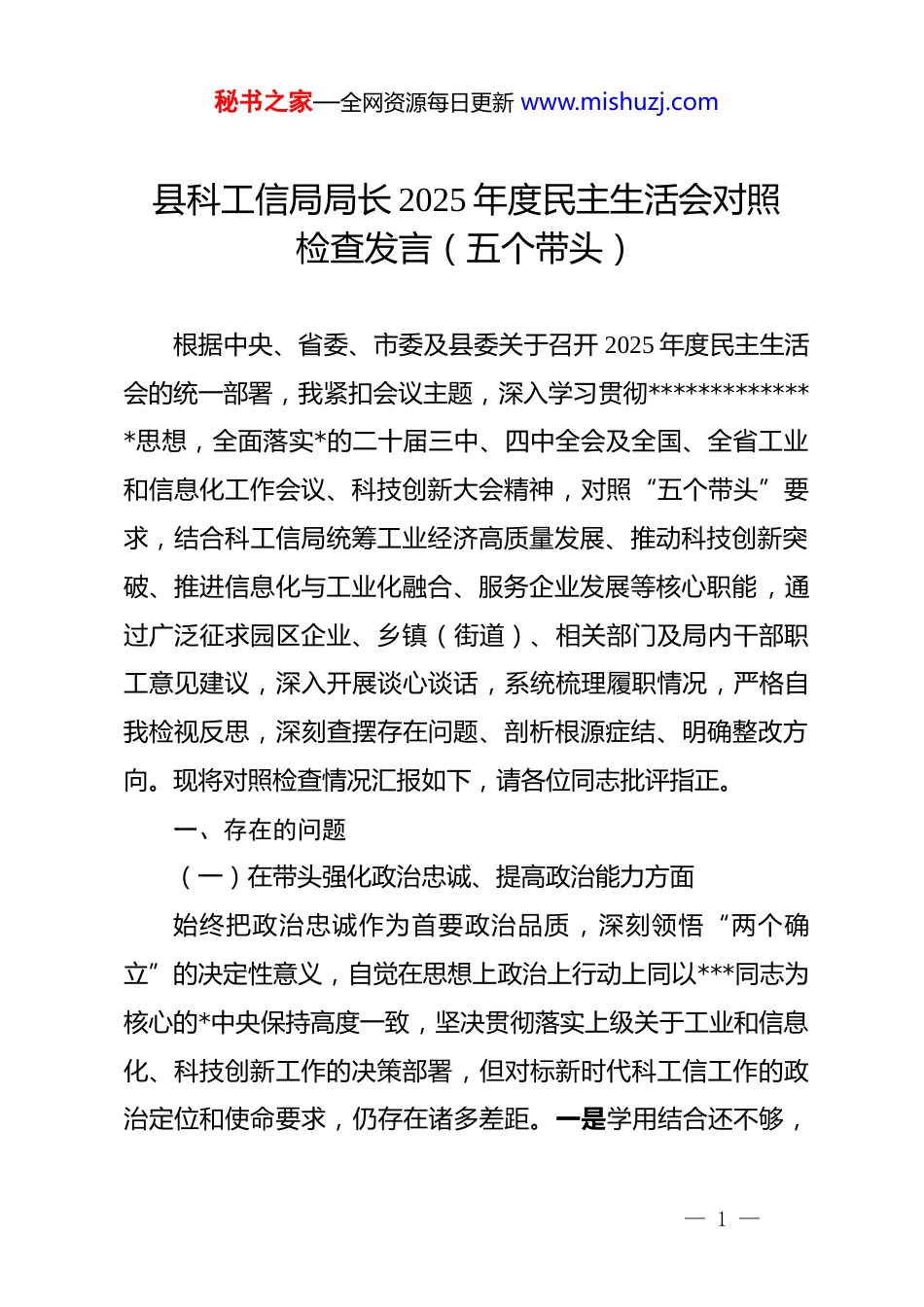 秘书之家—全网资源每日更新 www.mishuzj.com县科工信局局长 2025 年度民主生活会对照检查发言(五个带头)根据中央、省委、市委及县委关于召开 2025 年度民主生活会的统一部署,我紧扣会议主题,深入学习贯彻**************思想,全面落实*的二十届三中、四中全会及全国、全省工业和信息化工作会议、科技创新大会精神,对照“五个带头”要求,结合科工信局统筹工业经济高质量发展、推动科技创新突破、推进信息化与工业化融合、服务企业发展等核心职能,通过广泛征求园区企业、乡镇(街道)、相关部门及局内干部职工意见建议,深入开展谈心谈话,系统梳理履职情况,严格自我检视反思,深刻查摆存在问题、剖析根源症结、明确整改方向。现将对照检查情况汇报如下,请各位同志批评指正。一、存在的问题(一)在带头强化政治忠诚、提高政治能力方面始终把政治忠诚作为首要政治品质,深刻领悟“两个确立”的决定性意义,自觉在思想上政治上行动上同以***同志为核心的*中央保持高度一致,坚决贯彻落实上级关于工业和信息化、科技创新工作的决策部署,但对标新时代科工信工作的政治定位和使命要求,仍存在诸多差距。一是学用结合还不够,— 1 —秘书之家—全网资源每日更新 www.mishuzj.com对******关于制造强国、质量强国、科技强国的重要论述学习不够系统深入,多停留在原文宣读、要点记忆层面,未能深刻把握其蕴含的世界观、方法论和贯穿其中的立场观点方法,在将理论学习成果转化为推动县域工业转型升级、科技创新突破的具体思路和务实举措上思考不深、谋划不细。例如,在贯彻落实“推动传统产业高端化、智能化、绿色化转型”的****精神时,仅简单围绕上级下达的技改补贴指标开展工作,未能结合我县装备制造、农产品加工等主导产业的实际短板,制定差异化、精准化的转型实施方案,导致部分企业技改方向不明确、成效不明显。二是前瞻性预判不足,面对国内外宏观经济形势复杂变化、产业链供应链波动、科技创新迭代加速等新形势,对县域工业经济运行中的潜在风险研判不够精准、应对不够主动,缺乏系统性风险评估和极端情况应对预案。如 2025 年下半年,受上游原材料价格大幅上涨和下游市场需求萎缩双重影响,我县装备制造行业多家企业出现生产经营困难,但此前未能提前预判并建立预警机制,直到企业反映问题后才仓促应对,错失了主动帮扶的最佳时机。三是执行落实有差距,在推动上级决策部署落地见效过程中,存在“重部署、轻落细、弱问效”的现象,对政策执行过程中的堵点、难点问题排查不及时、解决不彻底。例如,在落实国家关于“专精特新”中小企业培育— 2 —秘书之家—全网资源每日更新 www.mishuzj.com的扶持政策时,虽然召开了政策宣讲会、印发了宣传手册,但对企业申报过程中遇到的知识产权认定、研发费用归集等具体难题,未能组织专业力量开展“一对一”精准指导,导致我县2025 年“专精特新”中小企业申报通过率低于全市平均水平,政策红利未能充分释放。四是安全底线意识不强,对工业领域安全生产、数据安全、网络安全等工作重视不够,存在“重发展、轻安全”的倾向。在推进工业企业智能化改造过程中,过于关注生产效率提升,对企业工业控制系统的网络安全防护措施督促检查不到位;在数据资源共享利用工作中,对数据安全风险评估不够全面,存在数据泄露隐患。(二)在带头固本培元、增强*性方面始终坚持以*性修养锤炼自身,努力发挥*员领导干部的先锋模范作用,但自觉锤炼*性的主动性、持续性和深刻性仍需加强,*性修养与岗位职责要求存在差距。一是存在“重业务、轻*性”的倾向,把业务工作成效等同于*性修养提升,对*内政治生活的重要性认识不足。参加局*支部“三会一课”、组织生活会等活动时,存在应付差事的思想,谈工作多、谈思想少,开展批评与自我批评时“辣味”不足,多以工作建议代替问题批评,以笼统表态代替具体剖析,未能真正达到“红脸出汗、排毒治病”的效果,*内政治生活的“熔炉”作用未能充分发挥。— 3 —秘书之家—全网资源每日更新 www.mishuzj.com例如,在 2025 年度局*支部组织生活会上,对班子成员提出的“服务企业主动性不足”...