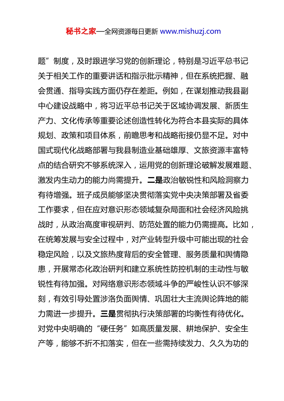 秘书之家—全网资源每日更新 www.mishuzj.com县委领导班子 2025 年专题民主生活会对照检查材料 根据市委关于开好 2025 年度专题民主生活会的统一部署和要求,县委领导班子紧扣会议主题,在深入开展学习研讨、广泛征求意见建议、坦诚进行谈心谈话的基础上,认真对照本次民主生活会明确的重点方面,深入查摆突出问题,深刻剖析问题根源,明确整改方向与措施。现将县委领导班子对照检查情况报告如下:一、存在的主要问题县委领导班子坚持问题导向,对照党的创新理论,对照党章党规党纪,对照初心使命,对照人民群众新期待,对照先进典型、身边榜样,紧密联系奋力推进中国式现代化建设我市实践的具体实际,深入查摆了五个方面的突出问题。(一)在带头强化政治忠诚、提高政治能力方面。班子成员能够深刻领悟“两个确立”的决定性意义,增强“四个意识”、坚定“四个自信”、做到“两个维护”,自觉在思想上政治上行动上同党中央保持高度一致。但对照更高标准、更严要求,政治判断力、政治领悟力、政治执行力仍有提升空间。一是理论武装与实践结合深度有待加强。虽认真落实“第一议秘书之家—全网资源每日更新 www.mishuzj.com题”制度,及时跟进学习党的创新理论,特别是习近平总书记关于相关工作的重要讲话和指示批示精神,但在系统把握、融会贯通、指导实践方面仍存在差距。例如,在谋划推动我县副中心建设战略中,将习近平总书记关于区域协调发展、新质生产力、文化传承等重要论述创造性转化为符合本县实际的具体规划、政策和项目体系,前瞻思考和战略衔接仍显不足。对中国式现代化战略部署与我县制造业基础雄厚、文旅资源丰富特点的结合研究不够系统深入,运用党的创新理论破解发展难题、激发内生动力的能力尚需提升。二是政治敏锐性和风险洞察力有待增强。班子成员能够坚决贯彻落实党中央决策部署及省委工作要求,但在应对意识形态领域复杂局面和社会经济风险挑战时,从政治高度审视研判、防范处置的能力仍需提高。比如,在统筹发展与安全过程中,对产业转型升级中可能出现的社会稳定风险,以及文旅热度背后的安全管理、服务质量和舆情隐患,开展常态化政治研判和建立系统性防控机制的主动性与敏锐性有待加强。对网络意识形态领域斗争的严峻性认识不够深刻,有效引导处置涉洛负面舆情、巩固壮大主流舆论阵地的能力需进一步提升。三是贯彻执行决策部署的均衡性有待优化。对党中央明确的“硬任务”如高质量发展、耕地保护、安全生产等,能够不折不扣落实,但在一些需持续发力、久久为功的秘书之家—全网资源每日更新 www.mishuzj.com“软任务”上,存在压力传导层层递减、工作标准有所放松的现象。例如,在推动绿色低碳转型、落实“双碳”目标方面,虽已制定相关规划,但推动传统产业绿色改造、培育绿色新兴产业、倡导绿色生活方式等方面缺乏刚性约束和有效激励措施,一抓到底的韧劲不足。在推进乡村全面振兴中,将巩固拓展脱贫攻坚成果同乡村振兴有效衔接的政治要求,转化为村庄可持续、群众得实惠的发展实绩,精准施策、末端见效存在差距,政策落地“最后一公里”问题仍较突出。(二)在带头固本培元、增强党性方面。班子成员能够不断加强党性锻炼,提升党性修养,但在持续筑牢理想信念、严格坚守党性原则、高标准践行道德品行上仍有不足。一是理想信念根基在面对复杂实践时仍需加固。面对我县改革发展稳定的繁重任务和深层次矛盾,部分班子成员存在陷入事务主义倾向,运用马克思主义立场观点方法进行反思和内省不够经常。比如,在处理城建领域历史遗留问题、推进国企改革攻坚时,面对利益纠葛和长期困局,个别同志存在畏难情绪和依赖心理,攻坚克难的锐气与“革命理想高于天”的精神支撑有所弱化,“功成不必在我”的境界和“功成必定有我”的担当有待强化。二是党性原则锤炼的严肃性有待提升。能够按要求参加民主生活会、组织生活会,但批评与自我批评的战斗性仍显不足,相秘书之家—全网资源每日更新 www.mishuzj.com互批评时“辣味”不够,存在“老好人”思想。双重组织生活制度执行有时不够严格,以普通党员身份深入支部听取意见、接受监督不够经常。在弘扬艰苦奋斗...
