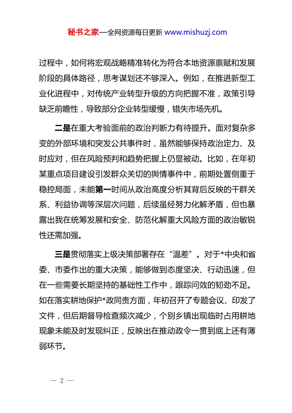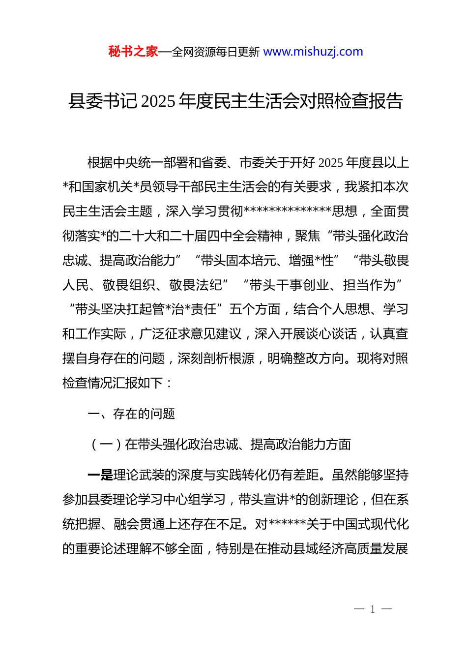 秘书之家—全网资源每日更新 www.mishuzj.com县委书记 2025 年度民主生活会对照检查报告根据中央统一部署和省委、市委关于开好 2025 年度县以上*和国家机关*员领导干部民主生活会的有关要求,我紧扣本次民主生活会主题,深入学习贯彻**************思想,全面贯彻落实*的二十大和二十届四中全会精神,聚焦“带头强化政治忠诚、提高政治能力”“带头固本培元、增强*性”“带头敬畏人民、敬畏组织、敬畏法纪”“带头干事创业、担当作为”“带头坚决扛起管*治*责任”五个方面,结合个人思想、学习和工作实际,广泛征求意见建议,深入开展谈心谈话,认真查摆自身存在的问题,深刻剖析根源,明确整改方向。现将对照检查情况汇报如下:一、存在的问题(一)在带头强化政治忠诚、提高政治能力方面一是理论武装的深度与实践转化仍有差距。虽然能够坚持参加县委理论学习中心组学习,带头宣讲*的创新理论,但在系统把握、融会贯通上还存在不足。对******关于中国式现代化的重要论述理解不够全面,特别是在推动县域经济高质量发展— 1 —秘书之家—全网资源每日更新 www.mishuzj.com过程中,如何将宏观战略精准转化为符合本地资源禀赋和发展阶段的具体路径,思考谋划还不够深入。例如,在推进新型工业化进程中,对传统产业转型升级的方向把握不准,政策引导缺乏前瞻性,导致部分企业转型缓慢,错失市场先机。二是在重大考验面前的政治判断力有待提升。面对复杂多变的外部环境和突发公共事件时,虽然能够保持政治定力、及时应对,但在风险预判和趋势把握上仍显被动。比如,在年初某重点项目建设引发群众关切的舆情事件中,前期处置侧重于稳控局面,未能第一时间从政治高度分析其背后反映的干群关系、利益协调等深层次问题,后续虽经努力化解矛盾,但也暴露出我在统筹发展和安全、防范化解重大风险方面的政治敏锐性还需加强。三是贯彻落实上级决策部署存在“温差”。对于*中央和省委、市委作出的重大决策,能够做到态度坚决、行动迅速,但在一些需要长期坚持的基础性工作中,跟踪问效的韧劲不足。如在落实耕地保护*政同责方面,年初召开了专题会议、印发了文件,但后期督导检查频次减少,个别乡镇出现临时占用耕地现象未能及时发现纠正,反映出在推动政令一贯到底上还有薄弱环节。— 2 —秘书之家—全网资源每日更新 www.mishuzj.com(二)在带头固本培元、增强*性方面一是*性锤炼的主动性有所弱化。随着任职时间增长,有时不自觉地把更多精力放在抓发展、保稳定上,对自我革命的要求有所放松。参加组织生活时,虽然能够按程序发言,但开展批评与自我批评时,对自身问题的剖析多集中于工作层面,触及理想信念、宗旨意识等思想根源的内容较少;对班子成员的提醒也多以工作建议形式提出,辣味不足,存在“顾面子、怕伤感情”的心理。二是宗旨意识树得不够牢固。作为县委书记,始终牢记“为官一任、造福一方”的职责使命,但在实际工作中,有时更关注经济发展指标、重点项目进度,对群众身边的“小事”“急事”关注不够均衡。例如,在推进城市更新过程中,虽然整体提升了人居环境,但对部分低收入群体安置补偿方案考虑不够细致,导致个别群众产生不满情绪。这说明我在践行以人民为中心的发展思想上,还没有真正做到时时处处站在群众立场想问题、作决策。三是斗争精神有所减退。面对改革发展中的深层次矛盾,有时存在求稳怕乱的思想。比如,在推进农村集体产权制度改革过程中,遇到历史遗留问题较多、群众意见分歧较大的情况,— 3 —秘书之家—全网资源每日更新 www.mishuzj.com一度采取“缓一缓、看一看”的策略,未能果断推动试点突破,影响了改革整体进度。这种回避矛盾、不敢碰硬的表现,本质上是*性修养不够坚强的体现。(三)在带头敬畏人民、敬畏组织、敬畏法纪方面一是服务群众的温度还需提升。始终坚持依法依规办事,严守纪律底线,但在处理一些政策边缘事项或历史遗留问题时,有时过于强调“合规性”而忽视“合理性”,未能最大限度争取政策空间解决群众合理诉求。例如,在协调某村集体土地权属纠纷时,因涉及多个部门审批环节,曾以“程序复杂”为由建议走法律途径解决,...