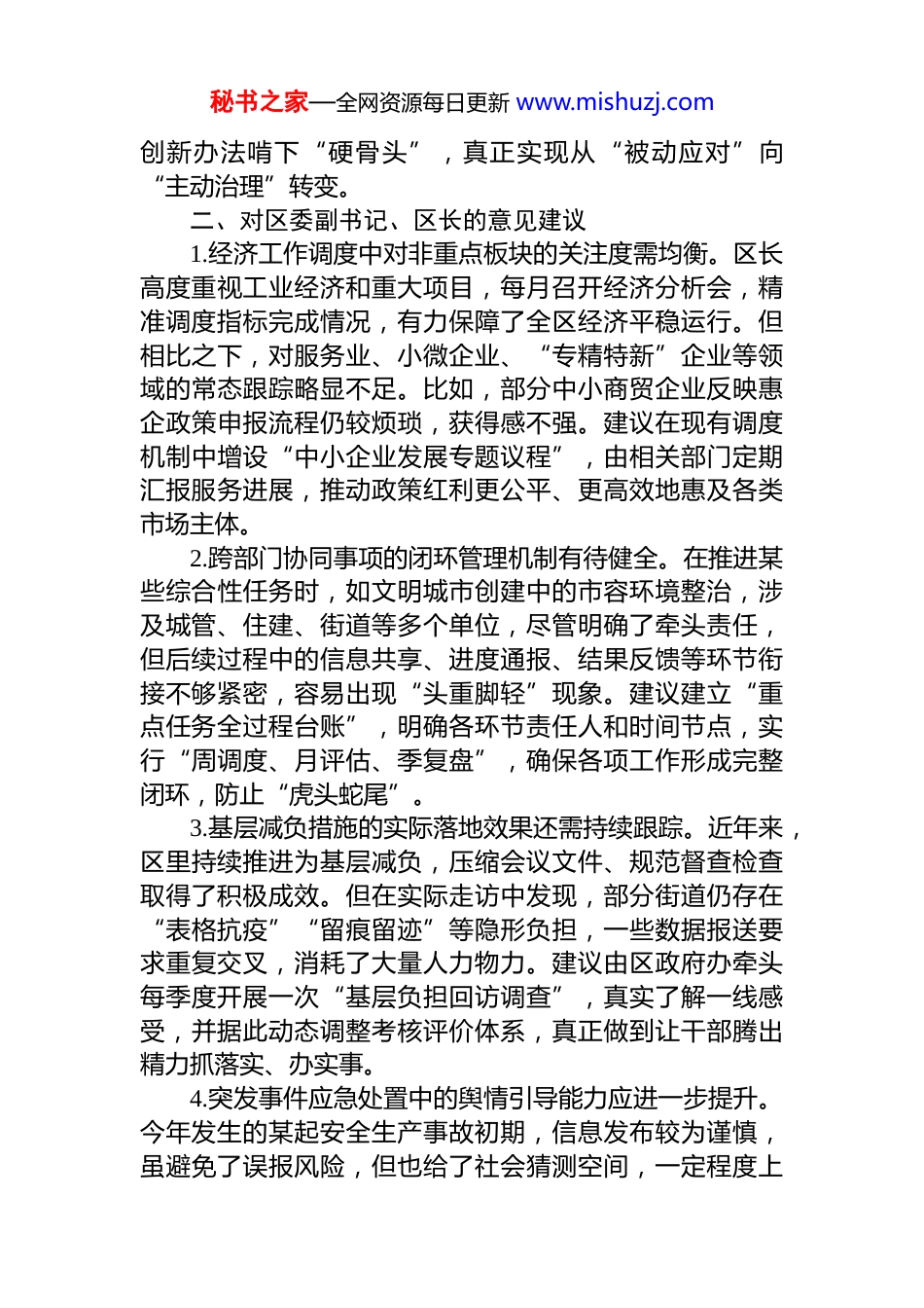 秘书之家—全网资源每日更新 www.mishuzj.com在 2025 年度专题民主生活会上的相互批评意见清单一、对区委书记的意见建议1.重大决策部署前的基层调研深度有待加强。在推进部分重点改革任务过程中,如今年初启动的城市更新片区改造项目,决策节奏较快,虽有前期论证,但实地走访居民代表、听取一线工作人员意见的频次相对有限。导致政策出台后,个别社区反映配套实施细则跟进不够及时,群众理解存在偏差。建议今后在重大政策酝酿阶段,进一步扩大“下沉式调研”覆盖面,尤其多走进老旧小区、城中村等矛盾集中区域,面对面倾听群众诉求,真正把“民情地图”绘准画实,使顶层设计更接地气、更具操作性。2.对分管领域干部的思想动态关注需更加细致。作为班长,×注重抓班子带队伍,但在高强度工作压力下,有时对个别班子成员的心理状态和思想波动掌握不够全面。例如在年中经济指标冲刺阶段,部分同志连续加班加点,精神较为紧张,此时若能适时开展一对一谈心谈话,给予更多情感支持和心理疏导,将更有助于凝聚共识、激发干劲。建议定期组织开展班子成员间的“思想交流日”,既谈工作也谈心,增强团队凝聚力和归属感。3.推动破解历史遗留问题的攻坚韧劲还可再强化。我区在土地征迁、信访积案等方面仍有一些“老大难”问题尚未彻底解决。虽然书记亲自包案督办取得一定成效,但面对复杂利益纠葛时,有时倾向于采取“稳控为主、逐步化解”的策略,短期内避免了风险外溢,但从长远看,可能错失一次性根治的窗口期。建议在守住安全底线的前提下进一步加大攻坚力度,组建专班集中突破,用改革思维和秘书之家—全网资源每日更新 www.mishuzj.com创新办法啃下“硬骨头”,真正实现从“被动应对”向“主动治理”转变。二、对区委副书记、区长的意见建议1.经济工作调度中对非重点板块的关注度需均衡。区长高度重视工业经济和重大项目,每月召开经济分析会,精准调度指标完成情况,有力保障了全区经济平稳运行。但相比之下,对服务业、小微企业、“专精特新”企业等领域的常态跟踪略显不足。比如,部分中小商贸企业反映惠企政策申报流程仍较烦琐,获得感不强。建议在现有调度机制中增设“中小企业发展专题议程”,由相关部门定期汇报服务进展,推动政策红利更公平、更高效地惠及各类市场主体。2.跨部门协同事项的闭环管理机制有待健全。在推进某些综合性任务时,如文明城市创建中的市容环境整治,涉及城管、住建、街道等多个单位,尽管明确了牵头责任,但后续过程中的信息共享、进度通报、结果反馈等环节衔接不够紧密,容易出现“头重脚轻”现象。建议建立“重点任务全过程台账”,明确各环节责任人和时间节点,实行“周调度、月评估、季复盘”,确保各项工作形成完整闭环,防止“虎头蛇尾”。3.基层减负措施的实际落地效果还需持续跟踪。近年来,区里持续推进为基层减负,压缩会议文件、规范督查检查取得了积极成效。但在实际走访中发现,部分街道仍存在“表格抗疫”“留痕留迹”等隐形负担,一些数据报送要求重复交叉,消耗了大量人力物力。建议由区政府办牵头每季度开展一次“基层负担回访调查”,真实了解一线感受,并据此动态调整考核评价体系,真正做到让干部腾出精力抓落实、办实事。4.突发事件应急处置中的舆情引导能力应进一步提升。今年发生的某起安全生产事故初期,信息发布较为谨慎,虽避免了误报风险,但也给了社会猜测空间,一定程度上秘书之家—全网资源每日更新 www.mishuzj.com影响了政府公信力。建议完善“舆情响应联动机制”,在确保信息准确的前提下,做到“快报事实、慎报原因、续报进展”,主动设置议题、回应关切,牢牢掌握舆论引导主动权。三、对区委副书记的意见建议1.dj 工作与中心工作的融合度有待深化。当前 dj 工作载体丰富,活动开展有序,但在如何更好服务中心大局上,仍有提升空间。例如,在推动 dj 引领基层治理过程中,部分社区*组织仍停留在“搞活动、做展板”层面,未能有效嵌入物业管理、矛盾调解等具体事务中。建议探索推行“dj+项目”模式,将组织生活会开到重点项目现场、开进群众家中,切实把组织优势转化为治理效能和发展动能。2.年轻干部培养...