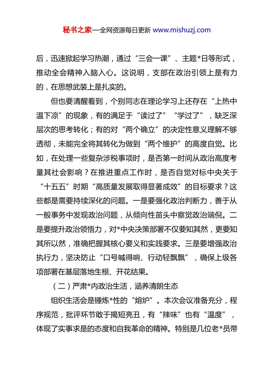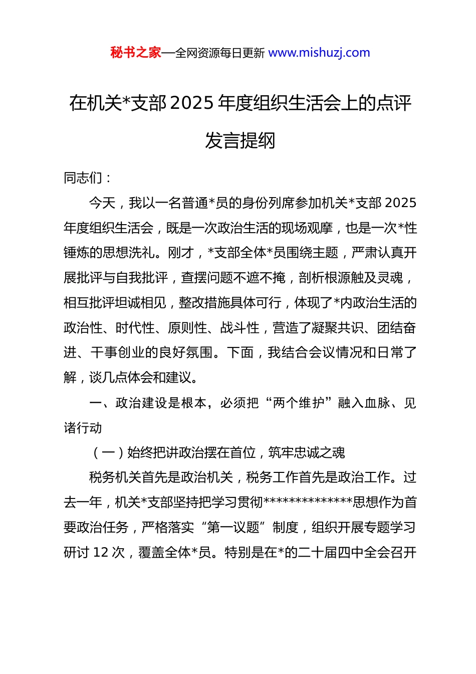 秘书之家—全网资源每日更新 www.mishuzj.com在机关*支部 2025 年度组织生活会上的点评发言提纲同志们:今天,我以一名普通*员的身份列席参加机关*支部 2025年度组织生活会,既是一次政治生活的现场观摩,也是一次*性锤炼的思想洗礼。刚才,*支部全体*员围绕主题,严肃认真开展批评与自我批评,查摆问题不遮不掩,剖析根源触及灵魂,相互批评坦诚相见,整改措施具体可行,体现了*内政治生活的政治性、时代性、原则性、战斗性,营造了凝聚共识、团结奋进、干事创业的良好氛围。下面,我结合会议情况和日常了解,谈几点体会和建议。一、政治建设是根本,必须把“两个维护”融入血脉、见诸行动(一)始终把讲政治摆在首位,筑牢忠诚之魂税务机关首先是政治机关,税务工作首先是政治工作。过去一年,机关*支部坚持把学习贯彻**************思想作为首要政治任务,严格落实“第一议题”制度,组织开展专题学习研讨 12 次,覆盖全体*员。特别是在*的二十届四中全会召开秘书之家—全网资源每日更新 www.mishuzj.com后,迅速掀起学习热潮,通过“三会一课”、主题*日等形式,推动全会精神入脑入心。这说明,支部在政治引领上是有力的,在思想武装上是扎实的。但也要清醒看到,个别同志在理论学习上还存在“上热中温下凉”的现象,有的满足于“读过了”“学过了”,缺乏深层次的思考转化;有的对“两个确立”的决定性意义理解不够透彻,未能完全将其转化为做到“两个维护”的高度自觉。比如,在处理一些复杂涉税事项时,是否第一时间从政治高度考量其社会影响?在推进重点工作时,是否自觉对标中央关于“十五五”时期“高质量发展取得显著成效”的目标要求?这些都是需要持续深化的问题。一是要强化政治判断力,善于从一般事务中发现政治问题,从倾向性苗头中察觉政治端倪。二是要提升政治领悟力,对*中央决策部署不仅要知其然,更要知其所以然,准确把握其核心要义和实践要求。三是要增强政治执行力,坚决防止“口号喊得响、行动轻飘飘”,确保上级各项部署在基层落地生根、开花结果。(二)严肃*内政治生活,涵养清朗生态组织生活会是锤炼*性的“熔炉”。本次会议准备充分,程序规范,批评环节敢于揭短亮丑,有“辣味”也有“温度”,体现了实事求是的态度和自我革命的精神。特别是几位老*员带秘书之家—全网资源每日更新 www.mishuzj.com头开展自我批评,坦诚剖析自身在传帮带作用发挥不足等问题,为年轻同志树立了榜样。但我们也要警惕形式主义的隐形变异。例如,有的同志在查摆问题时习惯于“模板化”表述,如“理论学习不够深入”“工作创新不足”等,缺乏具体事例支撑;有的相互批评仍存有“老好人”思想,点问题避重就轻,怕伤和气。这些问题虽属个别,但若不加以纠正,久而久之就会削弱组织生活的严肃性。下一步,要持续用好批评和自我批评这个武器,建立“问题清单+整改台账+销号管理”闭环机制。支部书记要履行好第一责任人职责,带头示范、严格把关,确保每次组织生活都成为思想交锋、灵魂触动的过程,真正让*员干部在组织生活中“红脸出汗”“排毒治病”。二、服务大局是使命,必须将税收职能嵌入发展全局(一)聚焦“国之大者”,精准落实政策红利2025 年,全市税务部门累计新增减税降费及退税缓费超**亿元,惠及市场主体 12.6 万户次,其中小微企业占比达83%。这些数据背后,是无数企业得以喘息、复苏、发展的生动写照。机关*支部作为政策执行的“最先一公里”,在政策解读、秘书之家—全网资源每日更新 www.mishuzj.com系统配置、宣传辅导等方面做了大量细致工作。比如,政策法规科*员牵头编制《2025 年度税费优惠操作指引》,图文并茂、通俗易懂;征收管理科*员加班加点完成金税系统参数调整,确保政策“即出即享”。这种主动担当、靠前服务的精神值得充分肯定。但也应看到,部分政策在基层落地过程中仍存在“最后一米”梗阻。有的纳税人反映,某些政策享受条件较为复杂,申报流程烦琐;有的对政策变动反应滞后,导致应享未享。这暴露出我们在政策推送的精准度、辅导的个性化方面还有提升空间。建议探索建立“政策标签画像”机制,依托大数据分析纳税人行业、...