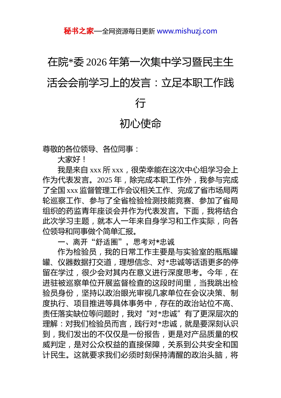 秘书之家—全网资源每日更新 www.mishuzj.com在院*委 2026 年第一次集中学习暨民主生活会会前学习上的发言:立足本职工作践行初心使命尊敬的各位领导、各位同事:大家好!我是来自 xxx 所 xxx,很荣幸能在这次中心组学习会上作为代表发言。2025 年,除完成本职工作外,我参与完成了全国 xxx 监督管理工作会议相关工作、完成了省市场局两轮巡察工作、参与了全省检验检测技能竞赛、参加了省局组织的药监青年座谈会并作为代表发言。下面,我将结合此次学习主题,就本人一年来自身学习和工作实际,向各位领导和同事做个简单汇报。一、离开“舒适圈”,思考对*忠诚作为检验员,我的日常工作主要是与实验室的瓶瓶罐罐、仪器数据打交道,理想信念、对*忠诚等话语更多的停留在学过,很少会对其内在意义进行深度思考。今年,在进驻被巡察单位开展监督检查的这段时间里,当我跳出检验员身份,坚持以政治眼光审视几家单位在会议决策、制度执行、项目推进等具体事务中,存在的政治站位不高、责任落实缺位等问题时,我对“对*忠诚”有了更深层次的理解:对我们检验员而言,践行对*忠诚,就是要深刻认识到,我们发出的不仅仅是一份报告,更是对产品质量的权威判定,是对公众权益的直接保障,关系到公共安全和国计民生。这就要求我们必须时刻保持清醒的政治头脑,将秘书之家—全网资源每日更新 www.mishuzj.com“科学、公正、优质、高效”的理念内化于心、外化于行。二、跳出经验思维,严格执行制度在参与巡察工作的过程中,我们对照标准“把脉会诊”,帮助被巡察单位发现那些在日常工作中习焉不察的“隐疾”。这也让我深刻体会到程序化操作、制度化管理的重要性。巡察中发现人事任免缺少民主推荐程序、财务报销缺少关键凭证时,看到的不仅是几个孤立的问题,更是整个管理体系的松懈与失序。而解决问题的“良方”,恰恰就蕴含在对单位规章制度的严格执行与不断完善之中对我们单位来说,质量手册、程序文件和管理制度等体系文件,是经过长期实践检验、凝聚集体智慧的“标准操作”和“避坑宝典”。它们将抽象的法律法规转化为具体的、可执行的岗位职责和操作步骤,确保无论人员如何更迭,工作的标准和质量都不会走样。体系文件中所规定的每一个签字、每一次记录、每一项审批,都不是可有可无的繁文缛节,而是权力运行轨迹的忠实“留痕”,是确保决策科学、过程透明、结果可溯的关键证据。任何对程序的简化、变通甚至省略,都可能为后续的权力寻租、资金风险乃至腐败问题埋下隐患。因此,严格遵循程序,就是为权力运行装上“安全阀”,为廉洁从业构筑“防火墙”。三、保持空杯心态,深耕专业技能药品、医疗器械、xxx 检验工作是守护人民群众身体健康的“技术关口”,容不得半点马虎。12 月初,我有幸参与了全省检验检测技能竞赛,获得了一个较好成绩的同时更让我对自身从事检验检测工作更深层次的理解:一是精准是检验工作的生命线。大赛实操环节中,零点几毫克的称量误差、几滴溶液的移取偏差,都可能导致结果的巨大偏差。日常工作中我们手中的每一份检验报告,都关系着药品 xxx 的质量安全,关系着人民群众的切身利益,容不得丝毫马虎,必须做到一丝不苟、精益求精;二是团队协作是攻坚克难的坚强后盾。备赛期间,单位为我提供了最优秘书之家—全网资源每日更新 www.mishuzj.com的训练条件,部门同志为我提供了更多的锻炼时间、经验丰富的前辈们主动为我答疑解惑,分享实操技巧和应急处理方法。这让我明白,个人的成长离不开集体的支撑,检验检测事业的发展更需要全体药检人凝心聚力、携手共进三是学无止境是检验人员的必修课。随着科技的发展,新技术、新方法、新标准不断涌现,只有始终保持求知若渴的心态,把学习当成常态,同时,积极参加各类技能培训能力验证和学术交流活动,在学中干、在干中学,才能跟上行业发展的步伐,胜任新时代检验检测工作的要求。四、坚持科研引领,不断推进创新xxx 直接关系消费者的健康安全,是守护美丽的第一道防线,而检验检测则是这道防线的核心支撑。随着美妆行业技术迭代加速、新原料新配方层出不穷,消费者对产品安全、功效的需求日益多元,传...