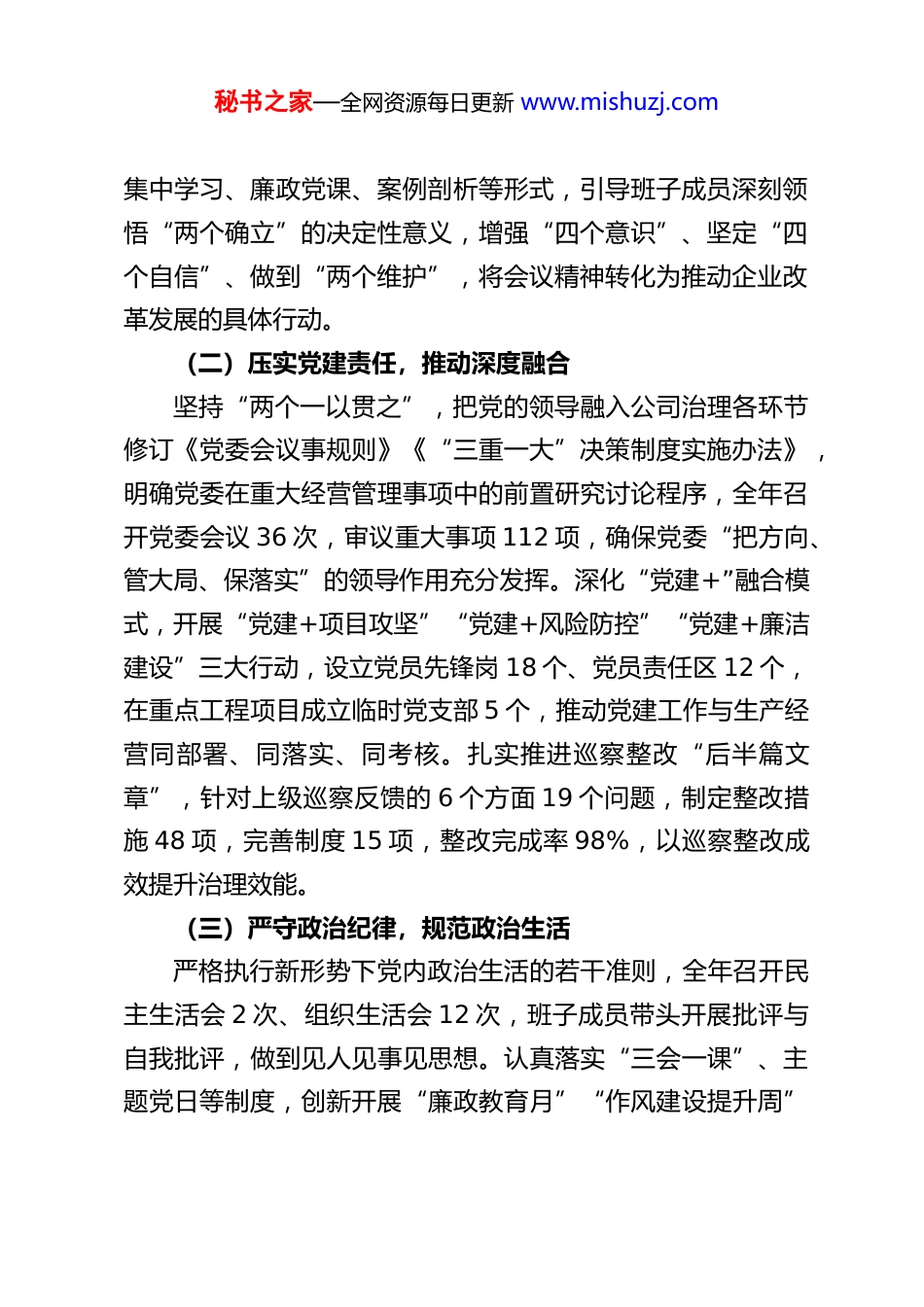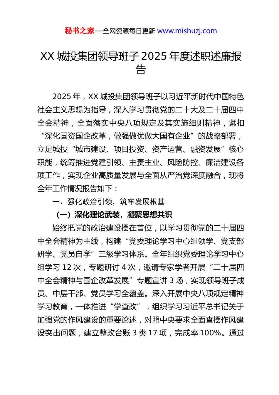 秘书之家—全网资源每日更新 www.mishuzj.comXX 城投集团领导班子 2025 年度述职述廉报告2025 年,XX 城投集团领导班子以习近平新时代中国特色社会主义思想为指导,深入学习贯彻党的二十大及二十届四中全会精神,全面落实中央八项规定及其实施细则精神,紧扣“深化国资国企改革,做强做优做大国有企业”的战略部署,立足城投“城市建设、项目投资、资产运营、融资发展”核心职能,统筹推进党建引领、主责主业、风险防控、廉洁建设各项工作,实现企业高质量发展与全面从严治党深度融合,现将全年工作情况报告如下:一、强化政治引领,筑牢发展根基(一)深化理论武装,凝聚思想共识始终把党的政治建设摆在首位,以学习贯彻党的二十届四中全会精神为主线,构建“党委理论学习中心组领学、党支部研学、党员自学”三级学习体系。全年组织党委理论学习中心组学习 12 次,专题研讨 4 次,邀请专家学者开展“二十届四中全会精神与国企改革发展”专题宣讲 3 场,实现领导班子成员、中层干部、党员学习全覆盖。深入开展中央八项规定精神学习教育,一体推进“学查改”,组织学习习近平总书记关于加强党的作风建设的重要论述,对照中央要求全面查摆作风建设突出问题,建立整改台账 3 类 17 项,完成率 100%。通过秘书之家—全网资源每日更新 www.mishuzj.com集中学习、廉政党课、案例剖析等形式,引导班子成员深刻领悟“两个确立”的决定性意义,增强“四个意识”、坚定“四个自信”、做到“两个维护”,将会议精神转化为推动企业改革发展的具体行动。(二)压实党建责任,推动深度融合坚持“两个一以贯之”,把党的领导融入公司治理各环节修订《党委会议事规则》《“三重一大”决策制度实施办法》,明确党委在重大经营管理事项中的前置研究讨论程序,全年召开党委会议 36 次,审议重大事项 112 项,确保党委“把方向、管大局、保落实”的领导作用充分发挥。深化“党建+”融合模式,开展“党建+项目攻坚”“党建+风险防控”“党建+廉洁建设”三大行动,设立党员先锋岗 18 个、党员责任区 12 个,在重点工程项目成立临时党支部 5 个,推动党建工作与生产经营同部署、同落实、同考核。扎实推进巡察整改“后半篇文章”,针对上级巡察反馈的 6 个方面 19 个问题,制定整改措施 48 项,完善制度 15 项,整改完成率 98%,以巡察整改成效提升治理效能。(三)严守政治纪律,规范政治生活严格执行新形势下党内政治生活的若干准则,全年召开民主生活会 2 次、组织生活会 12 次,班子成员带头开展批评与自我批评,做到见人见事见思想。认真落实“三会一课”、主题党日等制度,创新开展“廉政教育月”“作风建设提升周”秘书之家—全网资源每日更新 www.mishuzj.com等活动,组织参观廉政教育基地 3 次,观看警示教育片 6 部,通报典型案例 12 起,用身边事教育身边人,引导班子成员知敬畏、存戒惧、守底线。加强对下级党组织的监督指导,开展党建工作专项督查 4 次,整改问题 23 项,推动基层党组织标准化规范化建设达标率 100%。二、聚焦主责主业,推动高质量发展(一)攻坚项目建设,服务城市发展紧扣党的二十届四中全会“构建现代化产业体系”要求,聚焦城市基础设施建设和民生保障领域,全年实施重点项目 42个,总投资 386 亿元,完成年度投资 152 亿元,投资完成率108%。其中,城市路网优化工程 18 项,新建改造道路 35 公里,打通断头路 8 条,提升了城市交通通达性;民生保障项目12 项,新建保障性住房 2800 套,改造老旧小区 45 个,惠及群众 3.2 万户;生态环保项目 6 项,建设城市湿地公园 2 个,改造污水管网 48 公里,助力城市绿色低碳转型。创新项目管理模式,推行“班子成员包保制+项目专班制+节点考核制”,建立项目推进台账,实行周调度、月通报、季考核,确保项目按期保质完工。在项目建设中融入新质生产力培育要求,推广使用装配式建筑、绿色建材等新技术新材料,4 个项目获评省级优质工程,2 个项目入选全省新型基础设施建设示范项目。(二)创新融资模式,保障资金需求面对复杂的金融环境,坚持“多...