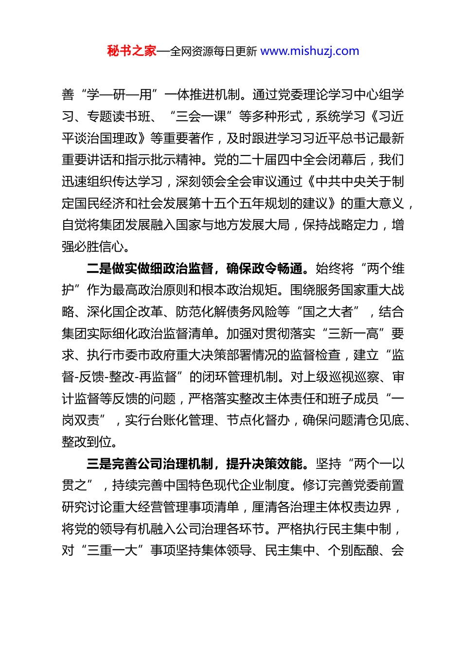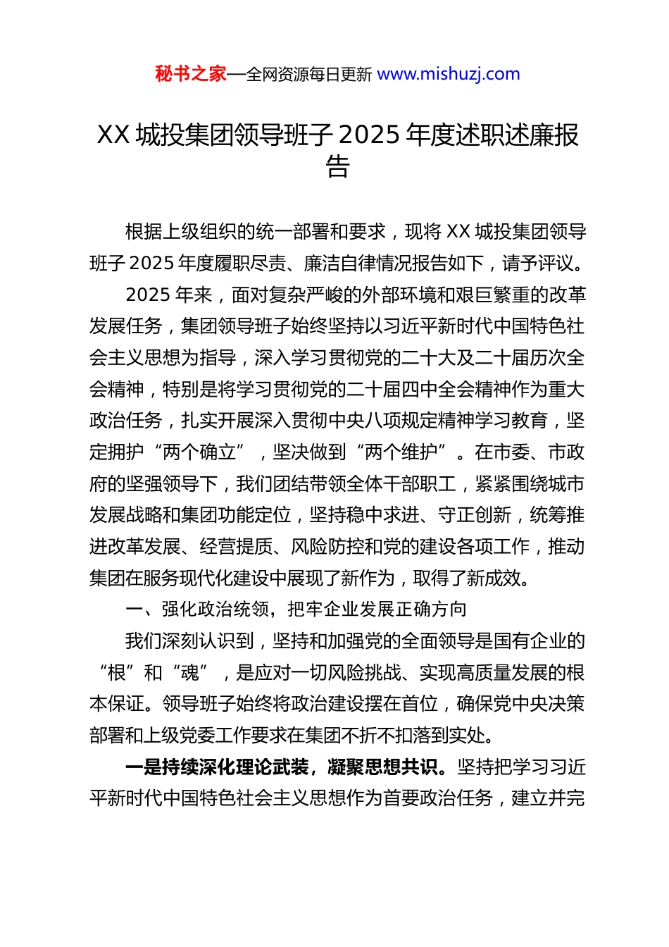 秘书之家—全网资源每日更新 www.mishuzj.comXX 城投集团领导班子 2025 年度述职述廉报告根据上级组织的统一部署和要求,现将 XX 城投集团领导班子 2025 年度履职尽责、廉洁自律情况报告如下,请予评议。2025 年来,面对复杂严峻的外部环境和艰巨繁重的改革发展任务,集团领导班子始终坚持以习近平新时代中国特色社会主义思想为指导,深入学习贯彻党的二十大及二十届历次全会精神,特别是将学习贯彻党的二十届四中全会精神作为重大政治任务,扎实开展深入贯彻中央八项规定精神学习教育,坚定拥护“两个确立”,坚决做到“两个维护”。在市委、市政府的坚强领导下,我们团结带领全体干部职工,紧紧围绕城市发展战略和集团功能定位,坚持稳中求进、守正创新,统筹推进改革发展、经营提质、风险防控和党的建设各项工作,推动集团在服务现代化建设中展现了新作为,取得了新成效。一、强化政治统领,把牢企业发展正确方向我们深刻认识到,坚持和加强党的全面领导是国有企业的“根”和“魂”,是应对一切风险挑战、实现高质量发展的根本保证。领导班子始终将政治建设摆在首位,确保党中央决策部署和上级党委工作要求在集团不折不扣落到实处。一是持续深化理论武装,凝聚思想共识。坚持把学习习近平新时代中国特色社会主义思想作为首要政治任务,建立并完秘书之家—全网资源每日更新 www.mishuzj.com善“学—研—用”一体推进机制。通过党委理论学习中心组学习、专题读书班、“三会一课”等多种形式,系统学习《习近平谈治国理政》等重要著作,及时跟进学习习近平总书记最新重要讲话和指示批示精神。党的二十届四中全会闭幕后,我们迅速组织传达学习,深刻领会全会审议通过《中共中央关于制定国民经济和社会发展第十五个五年规划的建议》的重大意义,自觉将集团发展融入国家与地方发展大局,保持战略定力,增强必胜信心。二是做实做细政治监督,确保政令畅通。始终将“两个维护”作为最高政治原则和根本政治规矩。围绕服务国家重大战略、深化国企改革、防范化解债务风险等“国之大者”,结合集团实际细化政治监督清单。加强对贯彻落实“三新一高”要求、执行市委市政府重大决策部署情况的监督检查,建立“监督-反馈-整改-再监督”的闭环管理机制。对上级巡视巡察、审计监督等反馈的问题,严格落实整改主体责任和班子成员“一岗双责”,实行台账化管理、节点化督办,确保问题清仓见底、整改到位。三是完善公司治理机制,提升决策效能。坚持“两个一以贯之”,持续完善中国特色现代企业制度。修订完善党委前置研究讨论重大经营管理事项清单,厘清各治理主体权责边界,将党的领导有机融入公司治理各环节。严格执行民主集中制,对“三重一大”事项坚持集体领导、民主集中、个别酝酿、会秘书之家—全网资源每日更新 www.mishuzj.com议决定,推动决策过程更加科学民主、规范高效。强化决议执行的督查督办,确保党委的决策部署转化为具体行动和实际成果。二、聚焦主责主业,服务城市发展彰显担当我们紧扣城投集团“城市建设运营服务商”的核心定位,推动主责主业做强做优。一是全力保障重大项目建设。始终将服务城市发展和民生改善作为首要职责。2025 年,集团承建的 XX 项市级重点工程均按计划稳步推进,其中 XX 项目提前竣工投用,XX 综合交通枢纽完成主体结构封顶。在项目建设中,我们注重应用新技术、新工艺,推行精细化管理,着力打造精品工程、廉洁工程。同时,积极谋划储备一批契合“十五五”发展方向、利于城市功能提升的重大项目。二是稳步推进产业转型升级。围绕“巩固壮大实体经济根基”的要求,我们审慎优化资产和业务结构。一方面,持续做强片区开发、市政公用、保障性住房建设等传统优势板块,提升专业化运营能力和服务品质。另一方面,积极探索培育新增长点,在智慧城市、绿色建筑、城市更新、产业园区运营等领域加大布局力度,推动集团从“融资建设”向“投资建设运营”一体化转型。年内完成了对 XX 低效无效资产的处置,推动资源向主业和关键领域集中。三是着力提升市场化经营能力。面对市场竞争和化债压力,秘书之家—全网资源每日更新 www.mishuzj.com集...