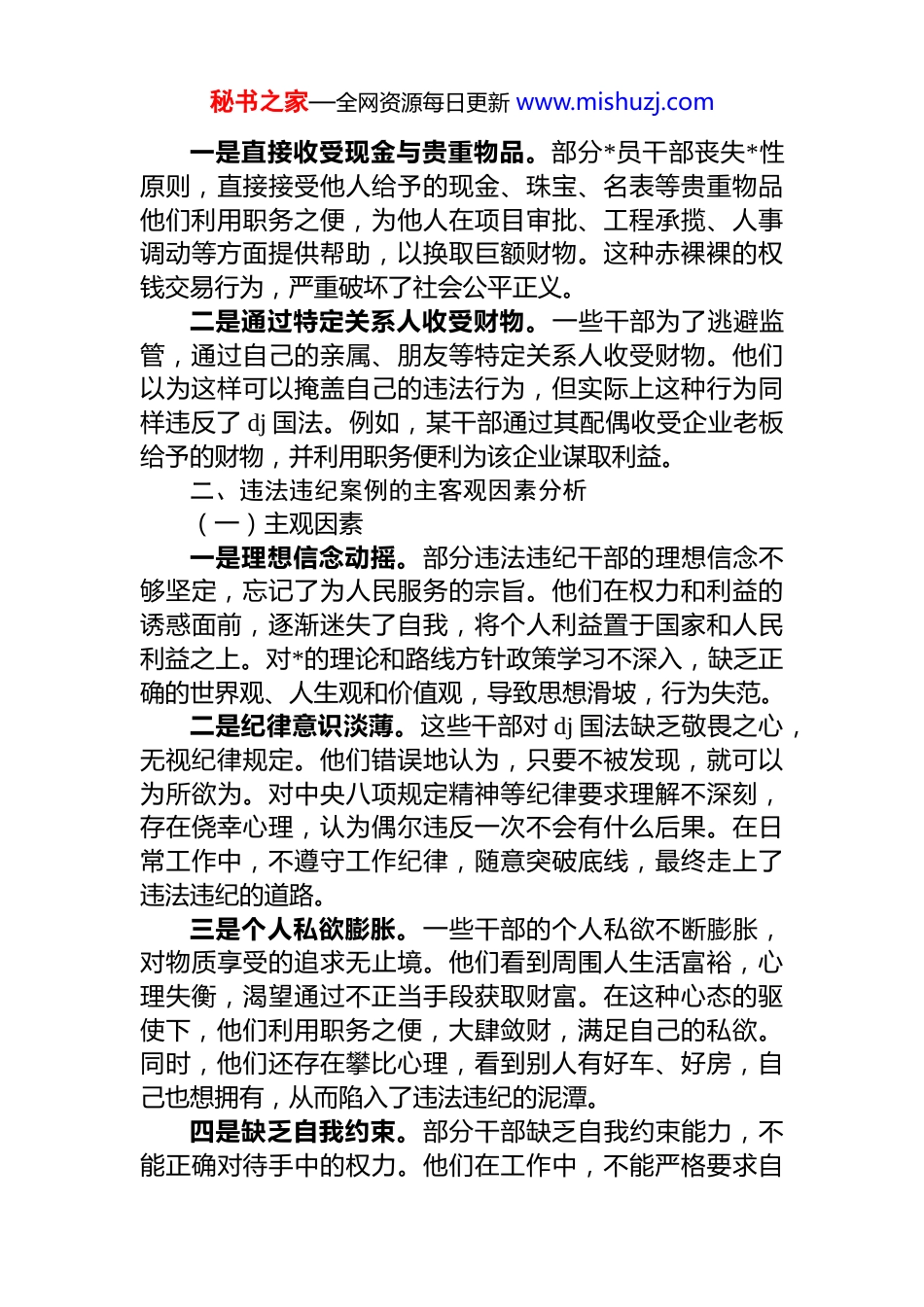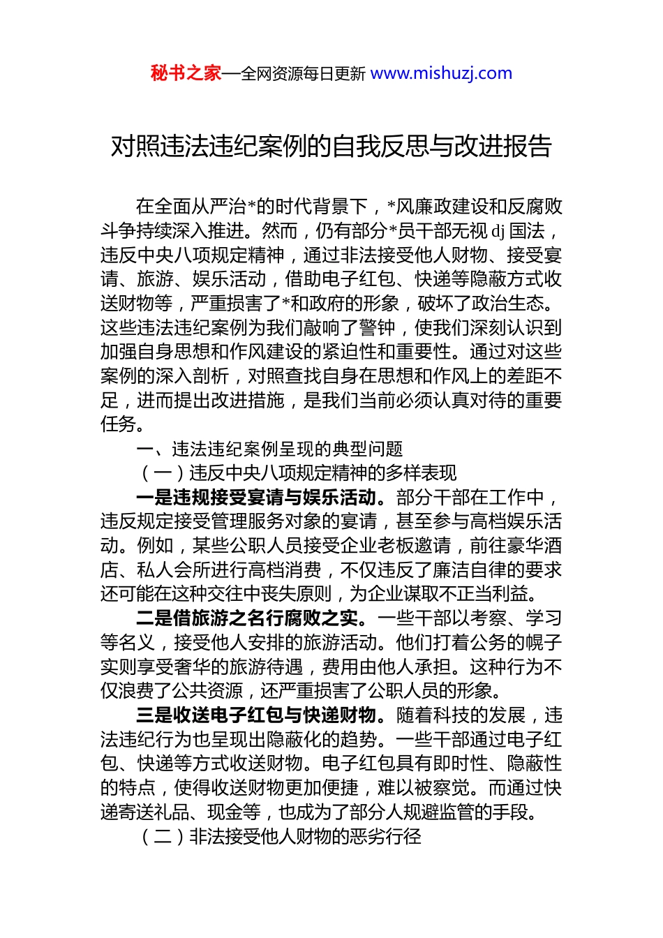 秘书之家—全网资源每日更新 www.mishuzj.com对照违法违纪案例的自我反思与改进报告在全面从严治*的时代背景下,*风廉政建设和反腐败斗争持续深入推进。然而,仍有部分*员干部无视 dj 国法,违反中央八项规定精神,通过非法接受他人财物、接受宴请、旅游、娱乐活动,借助电子红包、快递等隐蔽方式收送财物等,严重损害了*和政府的形象,破坏了政治生态。这些违法违纪案例为我们敲响了警钟,使我们深刻认识到加强自身思想和作风建设的紧迫性和重要性。通过对这些案例的深入剖析,对照查找自身在思想和作风上的差距不足,进而提出改进措施,是我们当前必须认真对待的重要任务。一、违法违纪案例呈现的典型问题(一)违反中央八项规定精神的多样表现一是违规接受宴请与娱乐活动。部分干部在工作中,违反规定接受管理服务对象的宴请,甚至参与高档娱乐活动。例如,某些公职人员接受企业老板邀请,前往豪华酒店、私人会所进行高档消费,不仅违反了廉洁自律的要求还可能在这种交往中丧失原则,为企业谋取不正当利益。二是借旅游之名行腐败之实。一些干部以考察、学习等名义,接受他人安排的旅游活动。他们打着公务的幌子实则享受奢华的旅游待遇,费用由他人承担。这种行为不仅浪费了公共资源,还严重损害了公职人员的形象。三是收送电子红包与快递财物。随着科技的发展,违法违纪行为也呈现出隐蔽化的趋势。一些干部通过电子红包、快递等方式收送财物。电子红包具有即时性、隐蔽性的特点,使得收送财物更加便捷,难以被察觉。而通过快递寄送礼品、现金等,也成为了部分人规避监管的手段。(二)非法接受他人财物的恶劣行径秘书之家—全网资源每日更新 www.mishuzj.com一是直接收受现金与贵重物品。部分*员干部丧失*性原则,直接接受他人给予的现金、珠宝、名表等贵重物品他们利用职务之便,为他人在项目审批、工程承揽、人事调动等方面提供帮助,以换取巨额财物。这种赤裸裸的权钱交易行为,严重破坏了社会公平正义。二是通过特定关系人收受财物。一些干部为了逃避监管,通过自己的亲属、朋友等特定关系人收受财物。他们以为这样可以掩盖自己的违法行为,但实际上这种行为同样违反了 dj 国法。例如,某干部通过其配偶收受企业老板给予的财物,并利用职务便利为该企业谋取利益。二、违法违纪案例的主客观因素分析(一)主观因素一是理想信念动摇。部分违法违纪干部的理想信念不够坚定,忘记了为人民服务的宗旨。他们在权力和利益的诱惑面前,逐渐迷失了自我,将个人利益置于国家和人民利益之上。对*的理论和路线方针政策学习不深入,缺乏正确的世界观、人生观和价值观,导致思想滑坡,行为失范。二是纪律意识淡薄。这些干部对 dj 国法缺乏敬畏之心,无视纪律规定。他们错误地认为,只要不被发现,就可以为所欲为。对中央八项规定精神等纪律要求理解不深刻,存在侥幸心理,认为偶尔违反一次不会有什么后果。在日常工作中,不遵守工作纪律,随意突破底线,最终走上了违法违纪的道路。三是个人私欲膨胀。一些干部的个人私欲不断膨胀,对物质享受的追求无止境。他们看到周围人生活富裕,心理失衡,渴望通过不正当手段获取财富。在这种心态的驱使下,他们利用职务之便,大肆敛财,满足自己的私欲。同时,他们还存在攀比心理,看到别人有好车、好房,自己也想拥有,从而陷入了违法违纪的泥潭。四是缺乏自我约束。部分干部缺乏自我约束能力,不能正确对待手中的权力。他们在工作中,不能严格要求自秘书之家—全网资源每日更新 www.mishuzj.com己,对自己的行为缺乏有效的监督和控制。面对各种诱惑不能坚守原则,轻易被拉拢腐蚀。在人际交往中,不能把握好分寸,与一些不良商人、社会人员交往过密,最终被其利用。(二)客观因素一是制度执行不力。虽然国家制定了一系列完善的法律法规和规章制度,但在实际执行过程中,存在执行不力的情况。一些单位对制度落实不到位,缺乏有效的监督检查机制,导致制度形同虚设。在干部选拔任用、项目审批资金管理等关键环节,制度执行不严格,给违法违纪行为提供了可乘之机。二是监督机制不完善。目前的监督机制还存在一些漏洞,对违法违纪行为的发现和...
