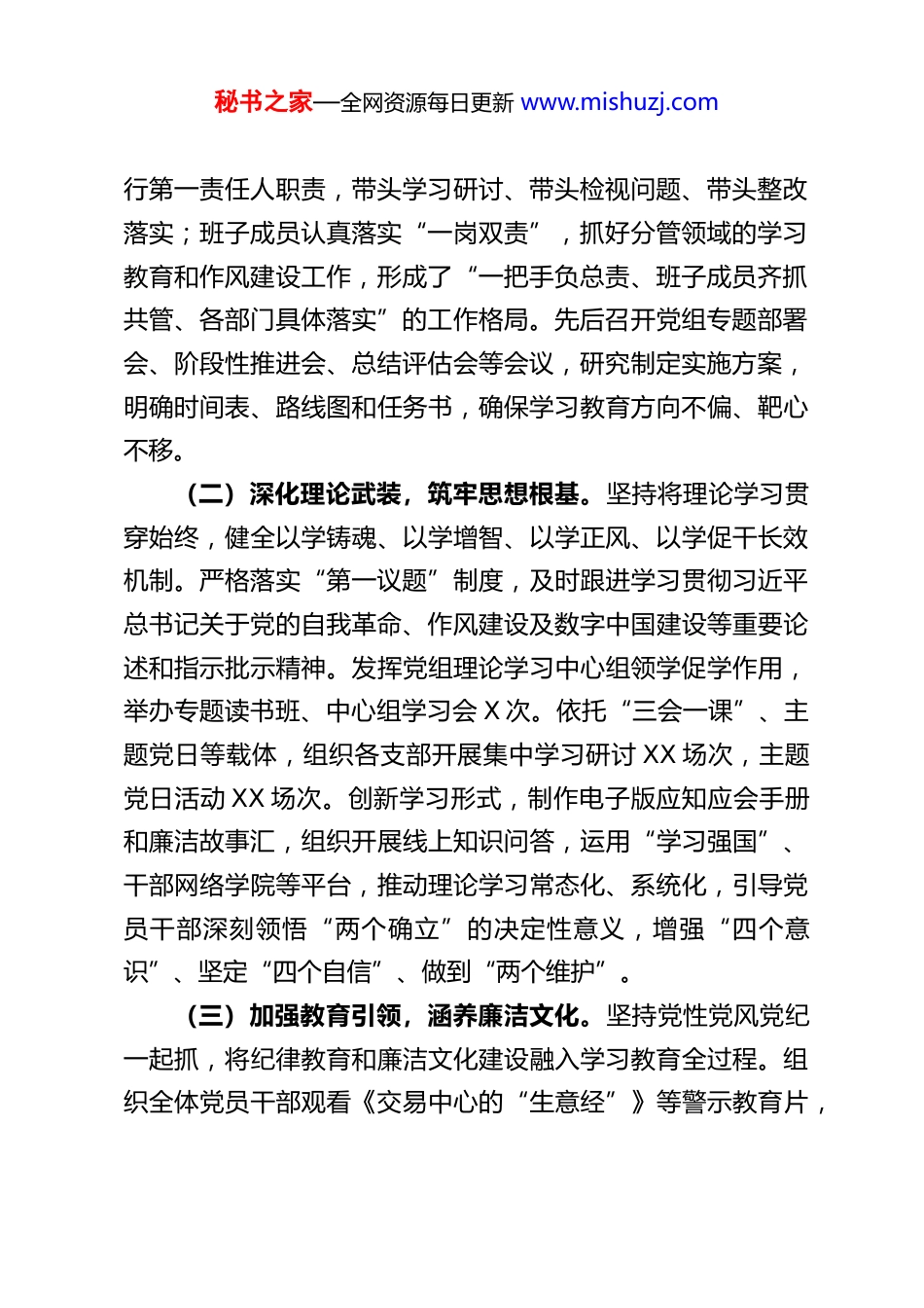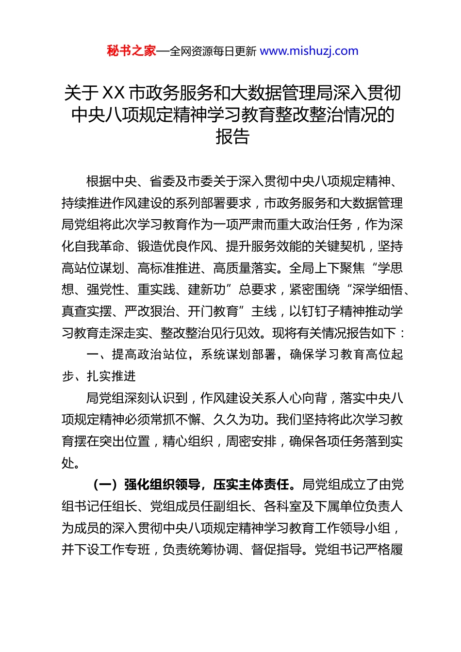 秘书之家—全网资源每日更新 www.mishuzj.com关于 XX 市政务服务和大数据管理局深入贯彻中央八项规定精神学习教育整改整治情况的报告根据中央、省委及市委关于深入贯彻中央八项规定精神、持续推进作风建设的系列部署要求,市政务服务和大数据管理局党组将此次学习教育作为一项严肃而重大政治任务,作为深化自我革命、锻造优良作风、提升服务效能的关键契机,坚持高站位谋划、高标准推进、高质量落实。全局上下聚焦“学思想、强党性、重实践、建新功”总要求,紧密围绕“深学细悟、真查实摆、严改狠治、开门教育”主线,以钉钉子精神推动学习教育走深走实、整改整治见行见效。现将有关情况报告如下:一、提高政治站位,系统谋划部署,确保学习教育高位起步、扎实推进局党组深刻认识到,作风建设关系人心向背,落实中央八项规定精神必须常抓不懈、久久为功。我们坚持将此次学习教育摆在突出位置,精心组织,周密安排,确保各项任务落到实处。(一)强化组织领导,压实主体责任。局党组成立了由党组书记任组长、党组成员任副组长、各科室及下属单位负责人为成员的深入贯彻中央八项规定精神学习教育工作领导小组,并下设工作专班,负责统筹协调、督促指导。党组书记严格履秘书之家—全网资源每日更新 www.mishuzj.com行第一责任人职责,带头学习研讨、带头检视问题、带头整改落实;班子成员认真落实“一岗双责”,抓好分管领域的学习教育和作风建设工作,形成了“一把手负总责、班子成员齐抓共管、各部门具体落实”的工作格局。先后召开党组专题部署会、阶段性推进会、总结评估会等会议,研究制定实施方案,明确时间表、路线图和任务书,确保学习教育方向不偏、靶心不移。(二)深化理论武装,筑牢思想根基。坚持将理论学习贯穿始终,健全以学铸魂、以学增智、以学正风、以学促干长效机制。严格落实“第一议题”制度,及时跟进学习贯彻习近平总书记关于党的自我革命、作风建设及数字中国建设等重要论述和指示批示精神。发挥党组理论学习中心组领学促学作用,举办专题读书班、中心组学习会 X 次。依托“三会一课”、主题党日等载体,组织各支部开展集中学习研讨 XX 场次,主题党日活动 XX 场次。创新学习形式,制作电子版应知应会手册和廉洁故事汇,组织开展线上知识问答,运用“学习强国”、干部网络学院等平台,推动理论学习常态化、系统化,引导党员干部深刻领悟“两个确立”的决定性意义,增强“四个意识”、坚定“四个自信”、做到“两个维护”。(三)加强教育引领,涵养廉洁文化。坚持党性党风党纪一起抓,将纪律教育和廉洁文化建设融入学习教育全过程。组织全体党员干部观看《交易中心的“生意经”》等警示教育片,秘书之家—全网资源每日更新 www.mishuzj.com召开全面从严治党警示教育会议,以案明纪、以案说法。由局机关纪委书记作专题辅导报告,巩固党纪学习教育成果。在政务服务大厅显著位置布置廉洁宣传图、标语,定期评选“流动红旗窗口”和“服务标兵”,营造崇廉拒腐、风清气正的浓厚氛围。加强年轻干部、新提拔干部、关键岗位干部的教育管理监督,组织签署《自觉抵制违规吃喝承诺书》,签署率达100%,引导党员干部知敬畏、存戒惧、守底线。二、坚持问题导向,深入查摆整治,推动作风建设走深走实、常态长效局党组坚持发扬自我革命精神,将发现问题、剖析问题、解决问题作为检验学习教育成效的试金石,以严实作风推动问题整改清仓见底。(一)广开言路,全面精准查摆问题。坚持开门搞教育,主动接受群众监督。在政务服务大厅常态化设置“办不成事反映窗口”“不满意请找我”窗口,并公开“纪委监督二维码”,广泛收集企业和群众办事过程中遇到的难点、堵点问题及对工作人员作风效能的意见建议。深入开展“局长坐窗口、走流程、优服务”活动,组织领导干部以办事群众和工作人员“双重身份”体验业务流程,现场发现并解决问题。通过召开座谈会、发放征求意见函、深入基层调研等方式,主动征求服务对象、相关部门、“两代表一委员”的意见建议。例如,梁子湖区数据局通过开门教育累计征求意见建议 8 条,均纳入问题清单。秘书之家—全网资源每日更新 www.mis...