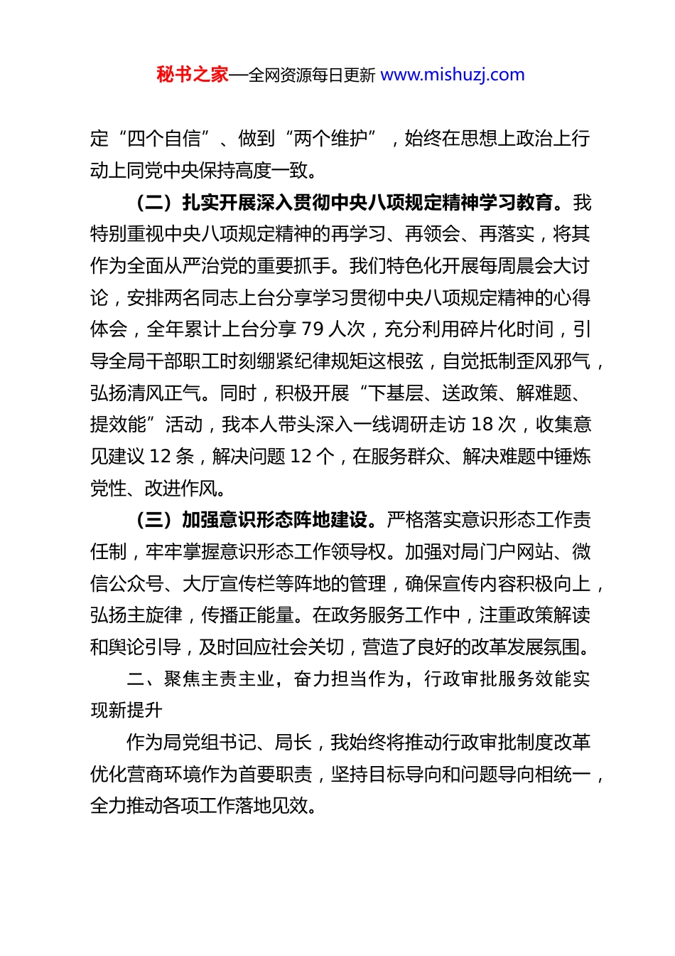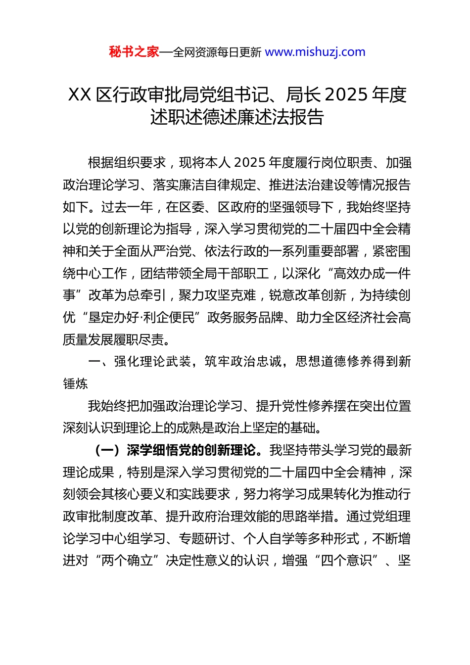 秘书之家—全网资源每日更新 www.mishuzj.comXX 区行政审批局党组书记、局长 2025 年度述职述德述廉述法报告根据组织要求,现将本人 2025 年度履行岗位职责、加强政治理论学习、落实廉洁自律规定、推进法治建设等情况报告如下。过去一年,在区委、区政府的坚强领导下,我始终坚持以党的创新理论为指导,深入学习贯彻党的二十届四中全会精神和关于全面从严治党、依法行政的一系列重要部署,紧密围绕中心工作,团结带领全局干部职工,以深化“高效办成一件事”改革为总牵引,聚力攻坚克难,锐意改革创新,为持续创优“垦定办好·利企便民”政务服务品牌、助力全区经济社会高质量发展履职尽责。一、强化理论武装,筑牢政治忠诚,思想道德修养得到新锤炼我始终把加强政治理论学习、提升党性修养摆在突出位置深刻认识到理论上的成熟是政治上坚定的基础。(一)深学细悟党的创新理论。我坚持带头学习党的最新理论成果,特别是深入学习贯彻党的二十届四中全会精神,深刻领会其核心要义和实践要求,努力将学习成果转化为推动行政审批制度改革、提升政府治理效能的思路举措。通过党组理论学习中心组学习、专题研讨、个人自学等多种形式,不断增进对“两个确立”决定性意义的认识,增强“四个意识”、坚秘书之家—全网资源每日更新 www.mishuzj.com定“四个自信”、做到“两个维护”,始终在思想上政治上行动上同党中央保持高度一致。(二)扎实开展深入贯彻中央八项规定精神学习教育。我特别重视中央八项规定精神的再学习、再领会、再落实,将其作为全面从严治党的重要抓手。我们特色化开展每周晨会大讨论,安排两名同志上台分享学习贯彻中央八项规定精神的心得体会,全年累计上台分享 79 人次,充分利用碎片化时间,引导全局干部职工时刻绷紧纪律规矩这根弦,自觉抵制歪风邪气,弘扬清风正气。同时,积极开展“下基层、送政策、解难题、提效能”活动,我本人带头深入一线调研走访 18 次,收集意见建议 12 条,解决问题 12 个,在服务群众、解决难题中锤炼党性、改进作风。(三)加强意识形态阵地建设。严格落实意识形态工作责任制,牢牢掌握意识形态工作领导权。加强对局门户网站、微信公众号、大厅宣传栏等阵地的管理,确保宣传内容积极向上,弘扬主旋律,传播正能量。在政务服务工作中,注重政策解读和舆论引导,及时回应社会关切,营造了良好的改革发展氛围。二、聚焦主责主业,奋力担当作为,行政审批服务效能实现新提升作为局党组书记、局长,我始终将推动行政审批制度改革优化营商环境作为首要职责,坚持目标导向和问题导向相统一,全力推动各项工作落地见效。秘书之家—全网资源每日更新 www.mishuzj.com(一)深化改革攻坚,“高效办成一件事”落地生根。我深刻认识到,深化“放管服”改革、优化营商环境是激发市场活力和社会创造力的关键之举。我们坚决贯彻落实国家、省、市关于“高效办成一件事”的部署要求,将其作为全局工作的重中之重。一年来,我们推动 37 项国家、省、市“一件事”主题服务全面落地,实现线下“只进一门”、线上“一网通办”,平均办理时长压减 67%,跑动次数压减 90%,企业群众办事便捷度显著提升。特别是,我们紧密结合 XX 区产业特色,创新推出养殖场、城市建筑垃圾处置核准等“一件事”服务场景,其中农药经营许可、农作物种子生产经营许可“一件事”改革案例入选省级典型案例汇编,相关经验做法得到上级肯定和推广。牵头总结提炼的《XX 区“三位一体”优化营商环境赋能新能源产业高质量发展》典型经验被市委改革办刊发,《“创优服务+多元赋能”助推黄河口大闸蟹产业高质量发展》获评全市“最佳案例”,改革成效获得广泛认可。(二)夯实服务基础,政务服务水平提档升级。我始终认为,标准化、规范化是提升政务服务质量的基石。我们高度重视政务服务标准化建设,组织编制涵盖业务流程、机制保障等4 个方面的标准文件 438 件,构建了较为完备的标准体系,并于 12 月顺利通过省级标准化试点验收,实现了“事事有标准可依、处处有规范可循”。为保障线上服务能力,我们组织骨干力量对全区 37 个部门的 1615 项政务服务事...