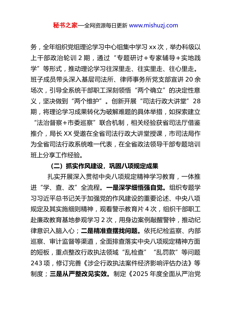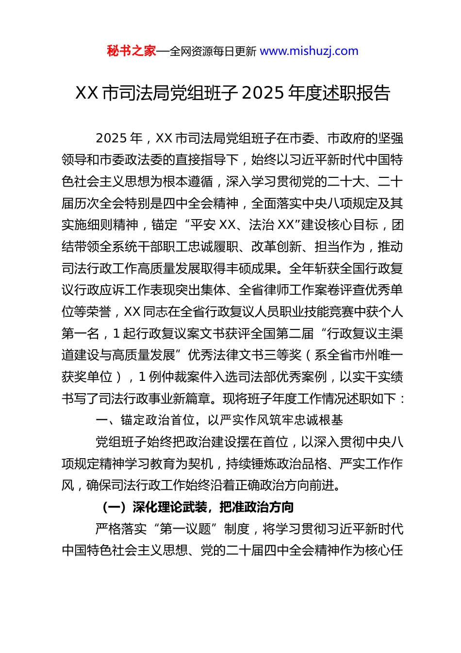 秘书之家—全网资源每日更新 www.mishuzj.comXX 市司法局党组班子 2025 年度述职报告2025 年,XX 市司法局党组班子在市委、市政府的坚强领导和市委政法委的直接指导下,始终以习近平新时代中国特色社会主义思想为根本遵循,深入学习贯彻党的二十大、二十届历次全会特别是四中全会精神,全面落实中央八项规定及其实施细则精神,锚定“平安 XX、法治 XX”建设核心目标,团结带领全系统干部职工忠诚履职、改革创新、担当作为,推动司法行政工作高质量发展取得丰硕成果。全年斩获全国行政复议行政应诉工作表现突出集体、全省律师工作案卷评查优秀单位等荣誉,XX 同志在全省行政复议人员职业技能竞赛中获个人第一名,1 起行政复议案文书获评全国第二届“行政复议主渠道建设与高质量发展”优秀法律文书三等奖(系全省市州唯一获奖单位),1 例仲裁案件入选司法部优秀案例,以实干实绩书写了司法行政事业新篇章。现将班子年度工作情况述职如下:一、锚定政治首位,以严实作风筑牢忠诚根基党组班子始终把政治建设摆在首位,以深入贯彻中央八项规定精神学习教育为契机,持续锤炼政治品格、严实工作作风,确保司法行政工作始终沿着正确政治方向前进。(一)深化理论武装,把准政治方向严格落实“第一议题”制度,将学习贯彻习近平新时代中国特色社会主义思想、党的二十届四中全会精神作为核心任秘书之家—全网资源每日更新 www.mishuzj.com务,全年组织党组理论学习中心组集中学习 xx 次,举办科级以上干部政治轮训 2 期,通过“专题研讨+专家辅导+实地践学”等形式,推动理论学习往深里走、往实里走、往心里走。班子成员带头深入基层司法所、律师事务所党支部宣讲 20 余场次,引导全系统干部职工深刻领悟“两个确立”的决定性意义,坚决做到“两个维护”。创新开展“司法行政大讲堂”28期,将理论学习成果转化为破解难题的具体举措,如探索建立“法治督察+市委巡察”联合机制,相关经验获省司法厅借鉴推介,局长 XX 受邀在全省司法行政大讲堂授课,市司法局作为全省司法行政系统唯一代表,在全省政法领导干部专题培训班上分享工作经验。(二)抓实作风建设,巩固八项规定成果扎实开展深入贯彻中央八项规定精神学习教育,一体推进“学、查、改”全流程。一是深学细悟强自觉。组织专题学习习近平总书记关于加强党的作风建设的重要论述、中央八项规定及其实施细则精神,观看警示教育片 4 次,组织干部职工赴廉政教育基地参观学习 2 次,用身边案例敲醒警钟,推动纪律意识入脑入心;二是精准查摆找问题。依托纪检监察、内部巡察、审计监督等渠道,全面排查落实中央八项规定精神方面的短板,重点整改行政执法领域“乱检查”“乱罚款”等问题243 项,修订完善《涉企行政执法案件经济影响评估办法》等制度;三是从严整改见实效。制定《2025 年度全面从严治党秘书之家—全网资源每日更新 www.mishuzj.com责任清单》,班子成员严格履行“一岗双责”,层层签订责任书,构建“横向到边、纵向到底”的责任体系。运用监督执纪“四种形态”特别是第一种形态,对苗头性、倾向性问题早发现、早提醒、早纠正,全年开展内部巡察和专项督察 3 轮次,坚决整治违规代理案件、违规收受财物等风险点,营造风清气正的政治生态。(三)建强基层组织,凝聚党建合力深入实施党建质量提升工程,坚持“抓党建带队建促业务”工作思路。一是夯实组织基础。推动法律服务行业党的组织和工作全覆盖,新成立律师行业党支部 5 个,选派优秀党建指导员 12 名,指导全市律所、公证、鉴定机构开展“红旗党支部”创建活动;二是创新党建载体。打造“党建+法治先锋”联动机制,设立党员责任区 30 个、党员示范岗 15 个,引导党员干部在法律援助、人民调解、社区矫正等一线亮身份、作表率,如党员律师牵头组建“护航高质量发展法律服务团”,结对服务企业 759 家,开展“法治体检”546 次;三是强化品牌效应。党建与业务融合成果获主流媒体关注,新华社、“学习强国”平台、《省法治报》头版头条报道我市司法行政创新做法,浏览量突破 114 万,推动 XX 司法行政工作跻身全省先进典型行列。...