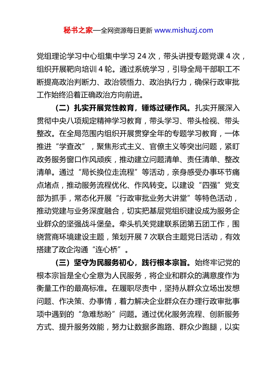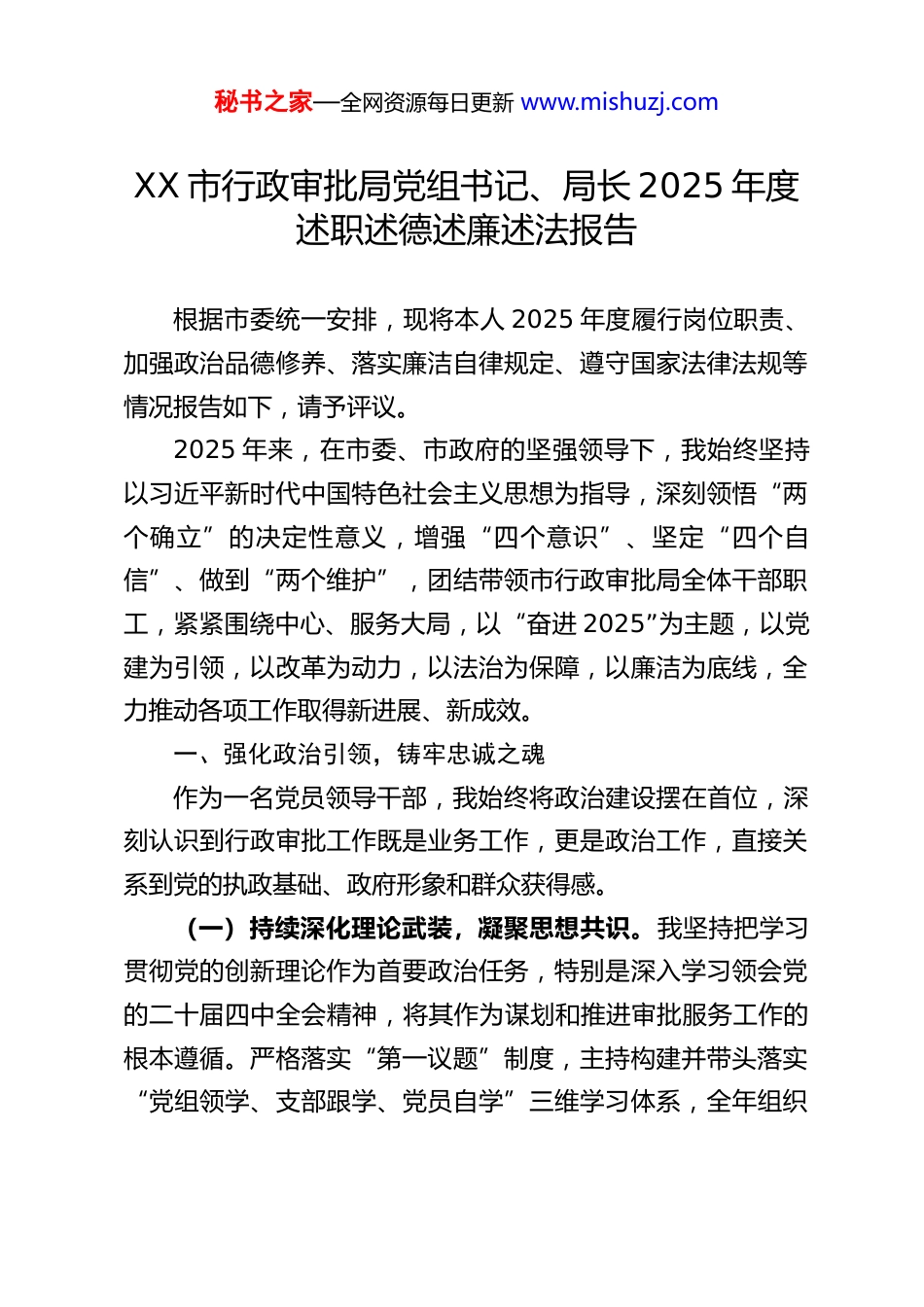 秘书之家—全网资源每日更新 www.mishuzj.comXX 市行政审批局党组书记、局长 2025 年度述职述德述廉述法报告根据市委统一安排,现将本人 2025 年度履行岗位职责、加强政治品德修养、落实廉洁自律规定、遵守国家法律法规等情况报告如下,请予评议。2025 年来,在市委、市政府的坚强领导下,我始终坚持以习近平新时代中国特色社会主义思想为指导,深刻领悟“两个确立”的决定性意义,增强“四个意识”、坚定“四个自信”、做到“两个维护”,团结带领市行政审批局全体干部职工,紧紧围绕中心、服务大局,以“奋进 2025”为主题,以党建为引领,以改革为动力,以法治为保障,以廉洁为底线,全力推动各项工作取得新进展、新成效。一、强化政治引领,铸牢忠诚之魂作为一名党员领导干部,我始终将政治建设摆在首位,深刻认识到行政审批工作既是业务工作,更是政治工作,直接关系到党的执政基础、政府形象和群众获得感。(一)持续深化理论武装,凝聚思想共识。我坚持把学习贯彻党的创新理论作为首要政治任务,特别是深入学习领会党的二十届四中全会精神,将其作为谋划和推进审批服务工作的根本遵循。严格落实“第一议题”制度,主持构建并带头落实“党组领学、支部跟学、党员自学”三维学习体系,全年组织秘书之家—全网资源每日更新 www.mishuzj.com党组理论学习中心组集中学习 24 次,带头讲授专题党课 4 次,组织开展靶向培训 4 轮。通过系统学习,引导全局干部职工不断提高政治判断力、政治领悟力、政治执行力,确保行政审批工作始终沿着正确政治方向前进。(二)扎实开展党性教育,锤炼过硬作风。扎实开展深入贯彻中央八项规定精神学习教育,带头学习、带头检视、带头整改。在全局范围内组织开展贯穿全年的专题学习教育,一体推进“学查改”,聚焦形式主义、官僚主义等突出问题,紧盯政务服务窗口作风顽疾,推动建立问题清单、责任清单、整改清单。通过“局长换位走流程”等活动,亲身感受办事环节痛点堵点,推动服务流程优化、作风转变。以建设“四强”党支部为抓手,常态化开展“行政审批业务大讲堂”等特色活动,推动党建与业务深度融合,切实把基层党组织建设成为服务企业群众的坚强战斗堡垒。牵头机关党建联系团第五团工作,围绕营商环境建设主题,策划开展 7 次联合主题党日活动,有效搭建了政企沟通“连心桥”。(三)坚守为民服务初心,践行根本宗旨。始终牢记党的根本宗旨是全心全意为人民服务,将企业和群众的满意度作为衡量工作的最高标准。在履职尽责中,坚持从群众立场出发想问题、作决策、办事情,着力解决企业群众在办理行政审批事项中遇到的“急难愁盼”问题。通过优化服务流程、创新服务方式、提升服务效能,努力让数据多跑路、群众少跑腿,以实秘书之家—全网资源每日更新 www.mishuzj.com际行动践行以人民为中心的发展思想,不断厚植党的执政根基。二、聚焦主责主业,扛起担当之责作为市行政审批局的主要负责人,我深知责任重大,始终秉持“优商重商、审批提效、阳光政务、智慧赋能”的工作思路,全力推动各项改革任务落地见效。(一)聚力营商环境优化,激发市场活力。坚持以企业感受为第一标尺,将优化营商环境作为“一把手”工程来抓。统筹实施营商环境综合改革,牵头制定印发“攻坚方案”及年度重点任务清单,编发工作简报 7 期加强调度督导。全力推动惠企政策精准直达快享,全年兑付本级惠企资金超过 1500 万元;创新编制发布“惠企政策月历”12 期 254 项,精准推送超7000 份“政策明白卡”,并对 9 条政策 39 个事项实行标签化管理。深化“智优”攻坚,建立“1+5+N”推进机制,推动“免申即享”事项扩面至 36 条,让企业享受政策红利更加便捷。依托“企业走访服务”系统,常态化开展“进解优促”行动,市场主体登记便利化水平显著提升,全年新增市场主体5250 户,相关经验做法获《中国改革报》等主流媒体宣传推介。(二)聚力审批效能提升,助推经济发展。紧紧围绕市委市政府“立园满园”等中心工作,全力服务保障重点项目落地。2 月 7 日,成功推动羊安分中心正式入驻 XX 经开区,实现 17家单位、240 项高频事...