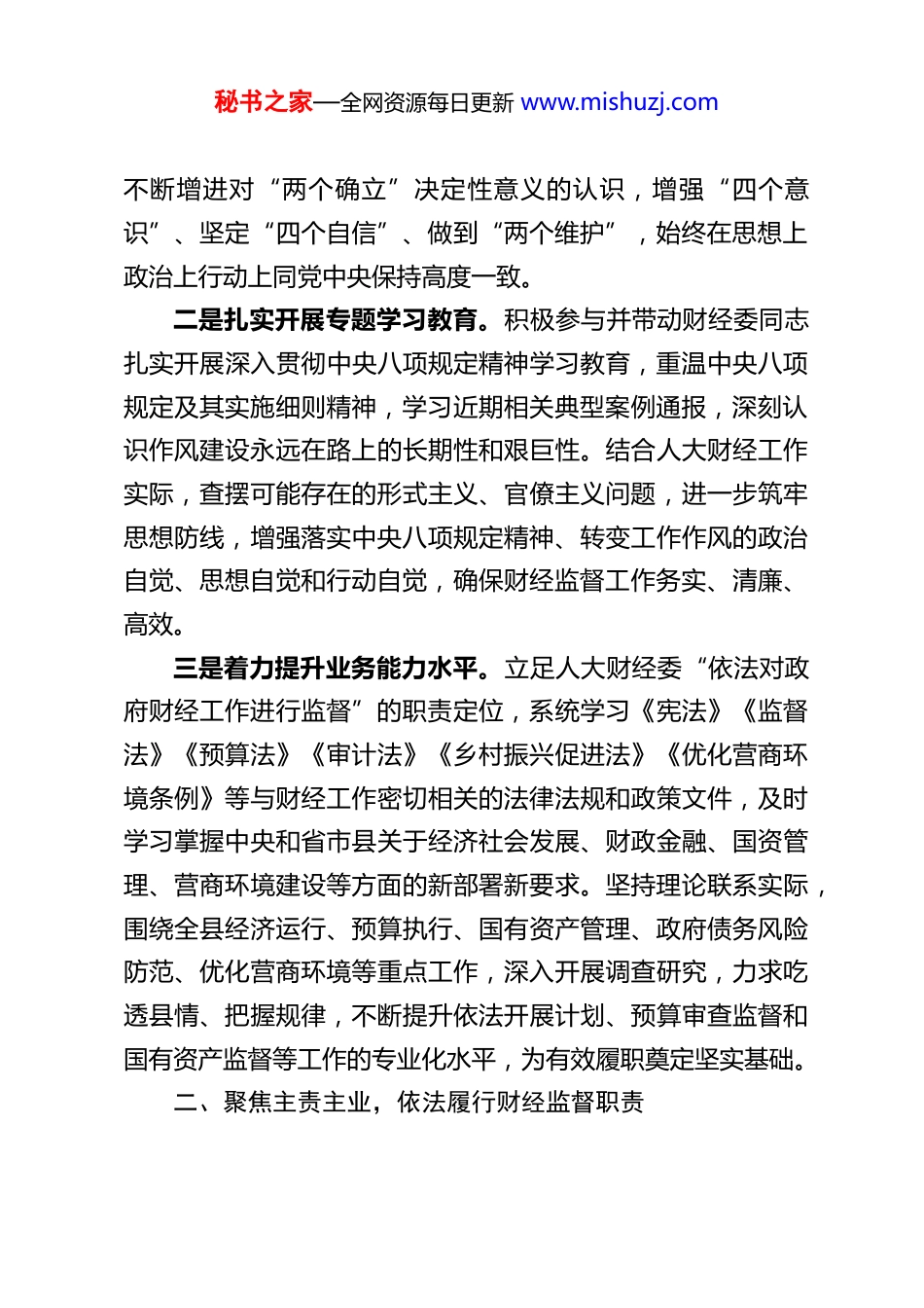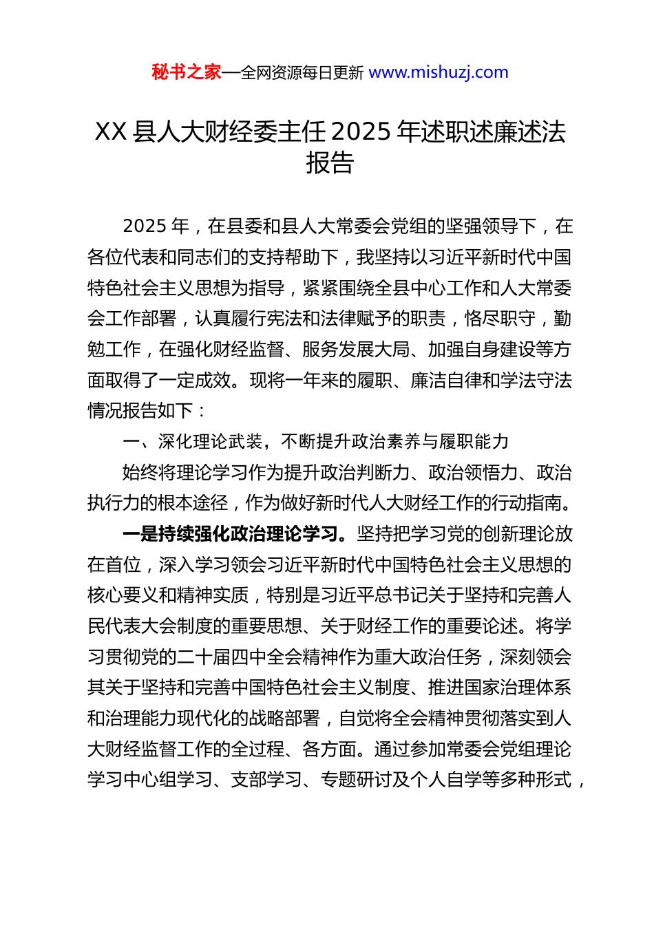 秘书之家—全网资源每日更新 www.mishuzj.comXX 县人大财经委主任 2025 年述职述廉述法报告2025 年,在县委和县人大常委会党组的坚强领导下,在各位代表和同志们的支持帮助下,我坚持以习近平新时代中国特色社会主义思想为指导,紧紧围绕全县中心工作和人大常委会工作部署,认真履行宪法和法律赋予的职责,恪尽职守,勤勉工作,在强化财经监督、服务发展大局、加强自身建设等方面取得了一定成效。现将一年来的履职、廉洁自律和学法守法情况报告如下:一、深化理论武装,不断提升政治素养与履职能力始终将理论学习作为提升政治判断力、政治领悟力、政治执行力的根本途径,作为做好新时代人大财经工作的行动指南。一是持续强化政治理论学习。坚持把学习党的创新理论放在首位,深入学习领会习近平新时代中国特色社会主义思想的核心要义和精神实质,特别是习近平总书记关于坚持和完善人民代表大会制度的重要思想、关于财经工作的重要论述。将学习贯彻党的二十届四中全会精神作为重大政治任务,深刻领会其关于坚持和完善中国特色社会主义制度、推进国家治理体系和治理能力现代化的战略部署,自觉将全会精神贯彻落实到人大财经监督工作的全过程、各方面。通过参加常委会党组理论学习中心组学习、支部学习、专题研讨及个人自学等多种形式,秘书之家—全网资源每日更新 www.mishuzj.com不断增进对“两个确立”决定性意义的认识,增强“四个意识”、坚定“四个自信”、做到“两个维护”,始终在思想上政治上行动上同党中央保持高度一致。二是扎实开展专题学习教育。积极参与并带动财经委同志扎实开展深入贯彻中央八项规定精神学习教育,重温中央八项规定及其实施细则精神,学习近期相关典型案例通报,深刻认识作风建设永远在路上的长期性和艰巨性。结合人大财经工作实际,查摆可能存在的形式主义、官僚主义问题,进一步筑牢思想防线,增强落实中央八项规定精神、转变工作作风的政治自觉、思想自觉和行动自觉,确保财经监督工作务实、清廉、高效。三是着力提升业务能力水平。立足人大财经委“依法对政府财经工作进行监督”的职责定位,系统学习《宪法》《监督法》《预算法》《审计法》《乡村振兴促进法》《优化营商环境条例》等与财经工作密切相关的法律法规和政策文件,及时学习掌握中央和省市县关于经济社会发展、财政金融、国资管理、营商环境建设等方面的新部署新要求。坚持理论联系实际,围绕全县经济运行、预算执行、国有资产管理、政府债务风险防范、优化营商环境等重点工作,深入开展调查研究,力求吃透县情、把握规律,不断提升依法开展计划、预算审查监督和国有资产监督等工作的专业化水平,为有效履职奠定坚实基础。二、聚焦主责主业,依法履行财经监督职责秘书之家—全网资源每日更新 www.mishuzj.com紧紧围绕全县高质量发展大局和县人大常委会年度工作要点,依法行使监督职权,推动重大决策部署和法律法规有效实施。一是深化经济工作监督。密切关注宏观经济形势和县域经济运行态势,围绕年度国民经济和社会发展计划执行情况开展监督。听取和审议县政府关于上半年计划执行情况的报告,组织代表就产业发展、项目建设、消费提振等关键领域开展专题调研和视察,提出针对性审议意见,推动政府更好统筹发展和安全,确保经济实现质的有效提升和量的合理增长。加强对“十四五”规划纲要中期评估的监督,推动各项目标任务稳步落实。二是强化预算决算审查监督。严格执行预算法、监督法等法律法规,扎实推进全过程预算绩效管理监督。初步审查县本级预算草案、预算调整方案和决算草案,聚焦预算编制的科学性、完整性、规范性,支出政策的有效性以及重点支出和重大投资项目安排。加强对财政预算绩效的监督,推动建立健全“预算编制有目标、预算执行有监控、预算完成有评价、评价结果有应用”的全过程绩效管理机制,提高财政资源配置效率和使用效益。听取和审议县政府关于审计工作报告及审计查出问题整改情况的报告,强化审计结果运用,推动问题整改到位,维护预算的严肃性和权威性。三是加强国有资产管理情况监督。依照县人大常委会关于秘书之家—全网资源每日更新 www.mishuzj.com加...