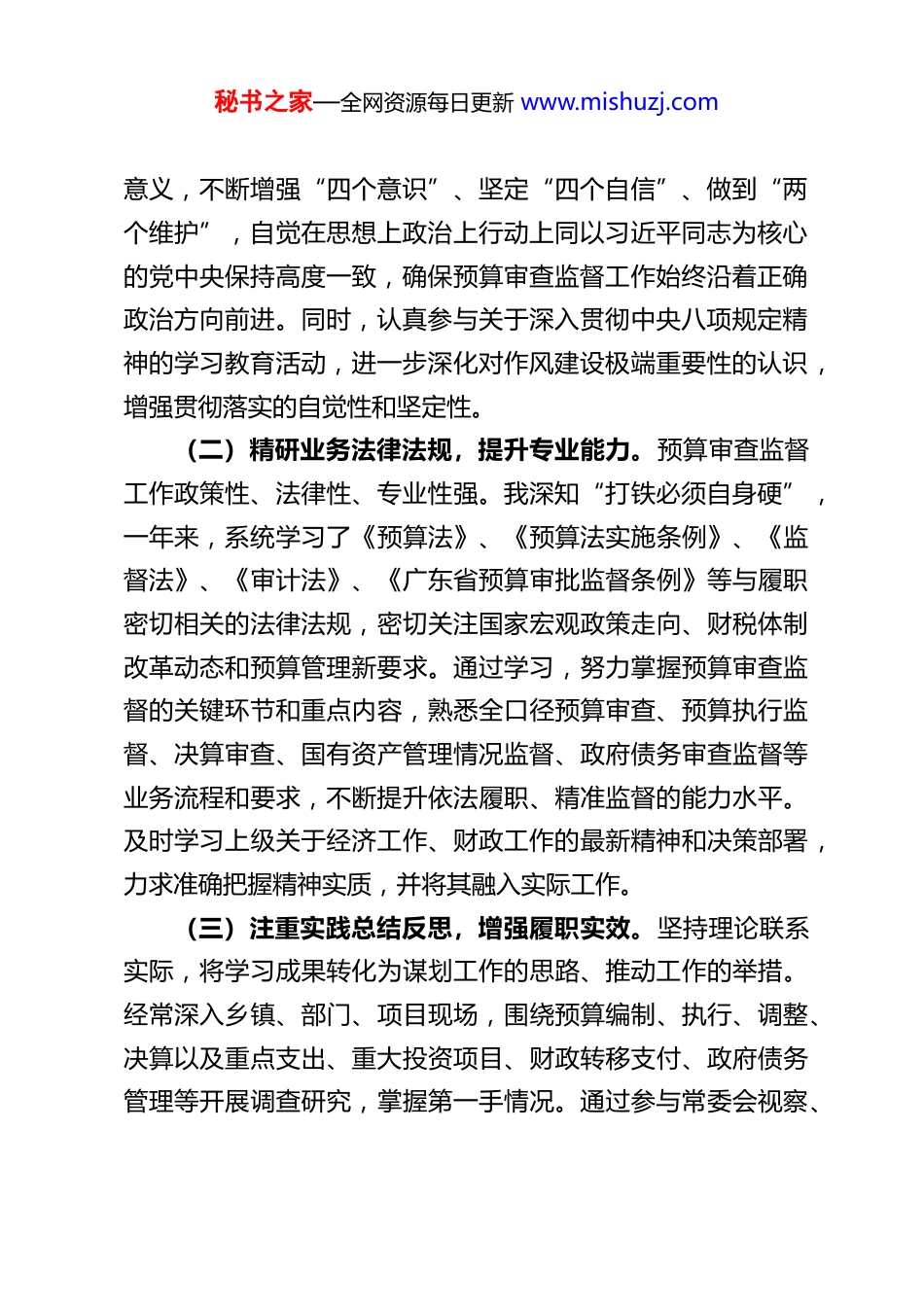 秘书之家—全网资源每日更新 www.mishuzj.comXX 县人大预算委主任 2025 年度述职述廉述法报告2025 年,在县委和县人大常委会党组的坚强领导下,在同志们的关心支持下,我始终坚持以党的创新理论为指导,深入学习贯彻党的二十届四中全会精神和习近平总书记关于坚持和完善人民代表大会制度的重要思想,紧紧围绕全县经济社会发展大局和县人大常委会中心工作,认真履行宪法和法律赋予的预算审查监督职责,恪尽职守,勤勉工作,廉洁自律,较好地完成了各项任务。现将一年来的履职、廉洁自律和学法守法情况报告如下:一、强化理论武装,不断提升政治能力与业务素养始终把加强学习作为提升政治素养、履职能力和领导水平的重要途径,坚持学思用贯通、知信行统一。(一)深学党的创新理论,筑牢政治忠诚。将政治理论学习摆在首位,积极参加县委、县人大常委会党组组织的各类学习活动,坚持个人自学与集中学习相结合。重点深入学习领会习近平新时代中国特色社会主义思想的核心要义和精神实质,特别是习近平总书记关于财政预算工作的重要论述,系统学习党的二十届四中全会作出的关于坚持党的全面领导、发展全过程人民民主、推进国家治理体系和治理能力现代化等一系列重大决策部署。通过深入学习,深刻领悟“两个确立”的决定性秘书之家—全网资源每日更新 www.mishuzj.com意义,不断增强“四个意识”、坚定“四个自信”、做到“两个维护”,自觉在思想上政治上行动上同以习近平同志为核心的党中央保持高度一致,确保预算审查监督工作始终沿着正确政治方向前进。同时,认真参与关于深入贯彻中央八项规定精神的学习教育活动,进一步深化对作风建设极端重要性的认识,增强贯彻落实的自觉性和坚定性。(二)精研业务法律法规,提升专业能力。预算审查监督工作政策性、法律性、专业性强。我深知“打铁必须自身硬”,一年来,系统学习了《预算法》、《预算法实施条例》、《监督法》、《审计法》、《广东省预算审批监督条例》等与履职密切相关的法律法规,密切关注国家宏观政策走向、财税体制改革动态和预算管理新要求。通过学习,努力掌握预算审查监督的关键环节和重点内容,熟悉全口径预算审查、预算执行监督、决算审查、国有资产管理情况监督、政府债务审查监督等业务流程和要求,不断提升依法履职、精准监督的能力水平。及时学习上级关于经济工作、财政工作的最新精神和决策部署,力求准确把握精神实质,并将其融入实际工作。(三)注重实践总结反思,增强履职实效。坚持理论联系实际,将学习成果转化为谋划工作的思路、推动工作的举措。经常深入乡镇、部门、项目现场,围绕预算编制、执行、调整、决算以及重点支出、重大投资项目、财政转移支付、政府债务管理等开展调查研究,掌握第一手情况。通过参与常委会视察、秘书之家—全网资源每日更新 www.mishuzj.com执法检查、专题调研等活动,听取人大代表和人民群众的意见建议,不断深化对县情实际和财政运行状况的认识,努力使预算审查监督工作更接地气、更富成效。二、聚焦主责主业,依法履行预算审查监督职责紧紧围绕全县中心工作和发展大局,依法行使预算审查监督职权,努力管好“国家账本”,服务保障高质量发展。(一)深化预算审查监督,看好人民“钱袋子”。强化全口径预算审查。牵头组织对县政府提交的 2025 年全县预算草案、部门预算草案进行初步审查。严格审查一般公共预算、政府性基金预算、国有资本经营预算、社会保险基金预算的完整性、规范性、合理性,重点关注预算收入测算是否科学稳妥、支出结构是否优化、重点领域保障是否有力、债务风险是否可控等。在审查中,注重与财政部门沟通,提前介入,提出针对性审查意见,为县人代会审查批准预算做好基础性工作。全年共组织预算草案集中审查 X 次,提出审查意见 X 条,多数被采纳。加强预算执行监督。坚持每季度对全县预算执行情况进行分析,密切关注财政收入进度、支出效益、重点科目执行情况以及预算收支平衡状况。针对预算执行中出现的苗头性、倾向性问题,及时向县政府及财政部门提出意见建议。依法对2025 年县级预算调整方案进行初步审查,确保预算调整符合法律规定...