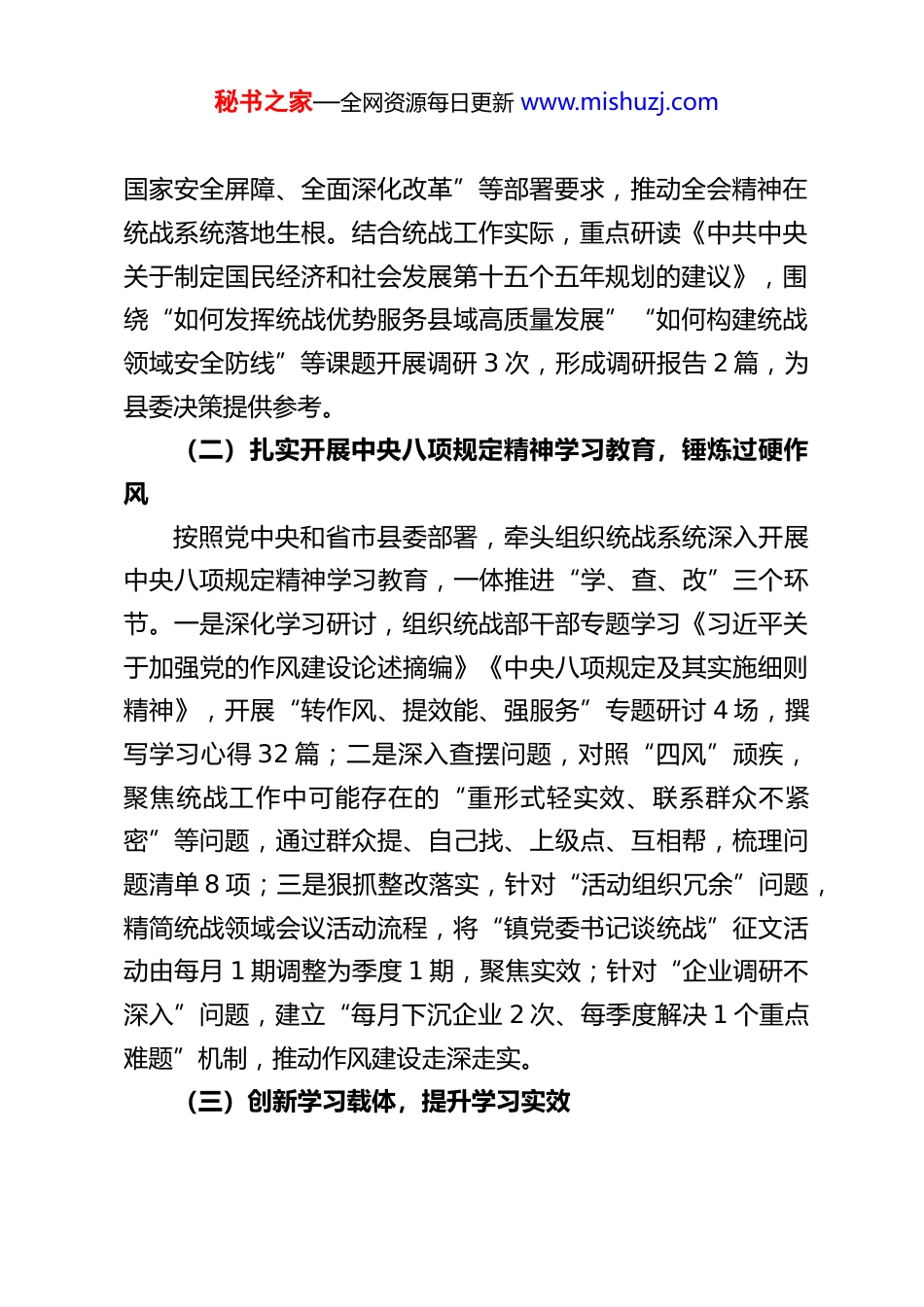 秘书之家—全网资源每日更新 www.mishuzj.comXX 县委统战部部长 2025 年述职述廉述学述法报告2025 年,在县委的坚强领导和市委统战部的有力指导下,我始终坚持以习近平新时代中国特色社会主义思想为指导,深入学习贯彻党的二十大和二十届历次全会精神,特别是党的二十届四中全会精神,扎实开展深入贯彻中央八项规定精神学习教育,紧紧围绕“凝聚共识、服务大局、守牢底线、增进团结”的统战工作主线,认真履行“第一责任人”职责,统筹推进统战领域各项工作落地见效,为全县高质量发展汇聚了统战智慧和力量。现将全年履职情况报告如下:一、强化理论武装,在学思践悟中筑牢政治根基始终把理论学习作为立身之本、履职之基,以“学深、悟透、做实”为目标,持续深化党的创新理论学习,重点把握二十届四中全会精神核心要义,扎实推进中央八项规定精神入脑入心,不断提升政治判断力、政治领悟力、政治执行力。(一)深学细悟党的创新理论,锚定政治方向坚持把学习贯彻党的二十届四中全会精神作为全年首要政治任务,严格落实“第一议题”制度,带头参加县委理论学习中心组集中学习 4 次,专题研讨统战领域贯彻落实四中全会精神的具体路径;组织县委统战部班子成员开展“领学带学”活动 12 场,深入统一战线各界宣讲四中全会关于“高质量发展、秘书之家—全网资源每日更新 www.mishuzj.com国家安全屏障、全面深化改革”等部署要求,推动全会精神在统战系统落地生根。结合统战工作实际,重点研读《中共中央关于制定国民经济和社会发展第十五个五年规划的建议》,围绕“如何发挥统战优势服务县域高质量发展”“如何构建统战领域安全防线”等课题开展调研 3 次,形成调研报告 2 篇,为县委决策提供参考。(二)扎实开展中央八项规定精神学习教育,锤炼过硬作风按照党中央和省市县委部署,牵头组织统战系统深入开展中央八项规定精神学习教育,一体推进“学、查、改”三个环节。一是深化学习研讨,组织统战部干部专题学习《习近平关于加强党的作风建设论述摘编》《中央八项规定及其实施细则精神》,开展“转作风、提效能、强服务”专题研讨 4 场,撰写学习心得 32 篇;二是深入查摆问题,对照“四风”顽疾,聚焦统战工作中可能存在的“重形式轻实效、联系群众不紧密”等问题,通过群众提、自己找、上级点、互相帮,梳理问题清单 8 项;三是狠抓整改落实,针对“活动组织冗余”问题,精简统战领域会议活动流程,将“镇党委书记谈统战”征文活动由每月 1 期调整为季度 1 期,聚焦实效;针对“企业调研不深入”问题,建立“每月下沉企业 2 次、每季度解决 1 个重点难题”机制,推动作风建设走深走实。(三)创新学习载体,提升学习实效秘书之家—全网资源每日更新 www.mishuzj.com结合统战工作特点,打造“分层分类、精准滴灌”的学习体系。针对党外干部,联合县委组织部开展专题培训 2 期,重点解读四中全会关于“人才强国”部署;针对民营企业家,依托“统战大讲堂”举办 8 期讲座,邀请专家解读惠企政策、科技创新趋势;针对新的社会阶层人士,通过“实践创新基地现场教学”“线上学习群每日推送”等形式,推动学习全覆盖。全年在省市县各级媒体刊发统战工作稿件 60 篇,其中专题解读四中全会精神和中央八项规定精神的稿件 15 篇,有效提升了学习的传播力和影响力。二、聚焦中心大局,在履职尽责中服务高质量发展始终围绕县委中心工作,把统战优势转化为发展优势,把统战资源转化为发展资源,推动统战工作与县域发展同频共振。(一)强化政治引领,凝聚思想共识坚持把凝聚政治共识作为首要任务,严格落实县委“七个纳入”“四个带头”工作机制。全年协助县委常委会专题研究统战工作 3 次,推动县委理论学习中心组集中学习统战理论政策 4 次;我本人带头为中青年干部培训班作统战专题辅导 2 场,组织统战部班子成员深入企业、宗教场所、新阶层人士中宣讲党的二十届四中全会精神 16 场,覆盖统战对象 1200 余人次。通过召开各界人士座谈会、民营企业工作座谈会等 11 场,引导统一战线成员深刻领悟“两个确立”的决定性意义,增强“四个意识”...
