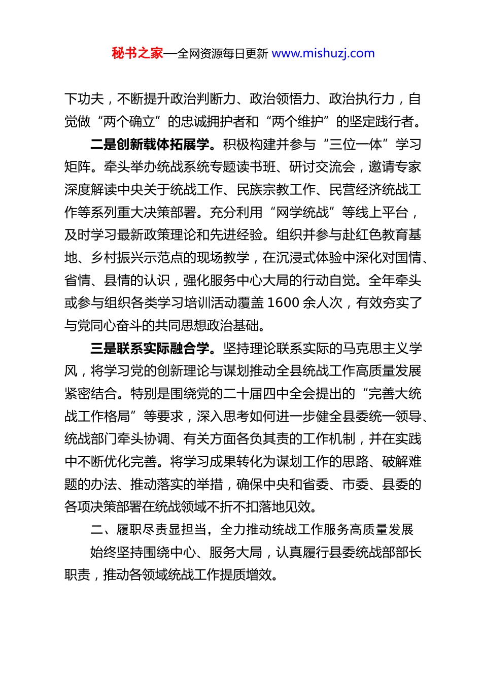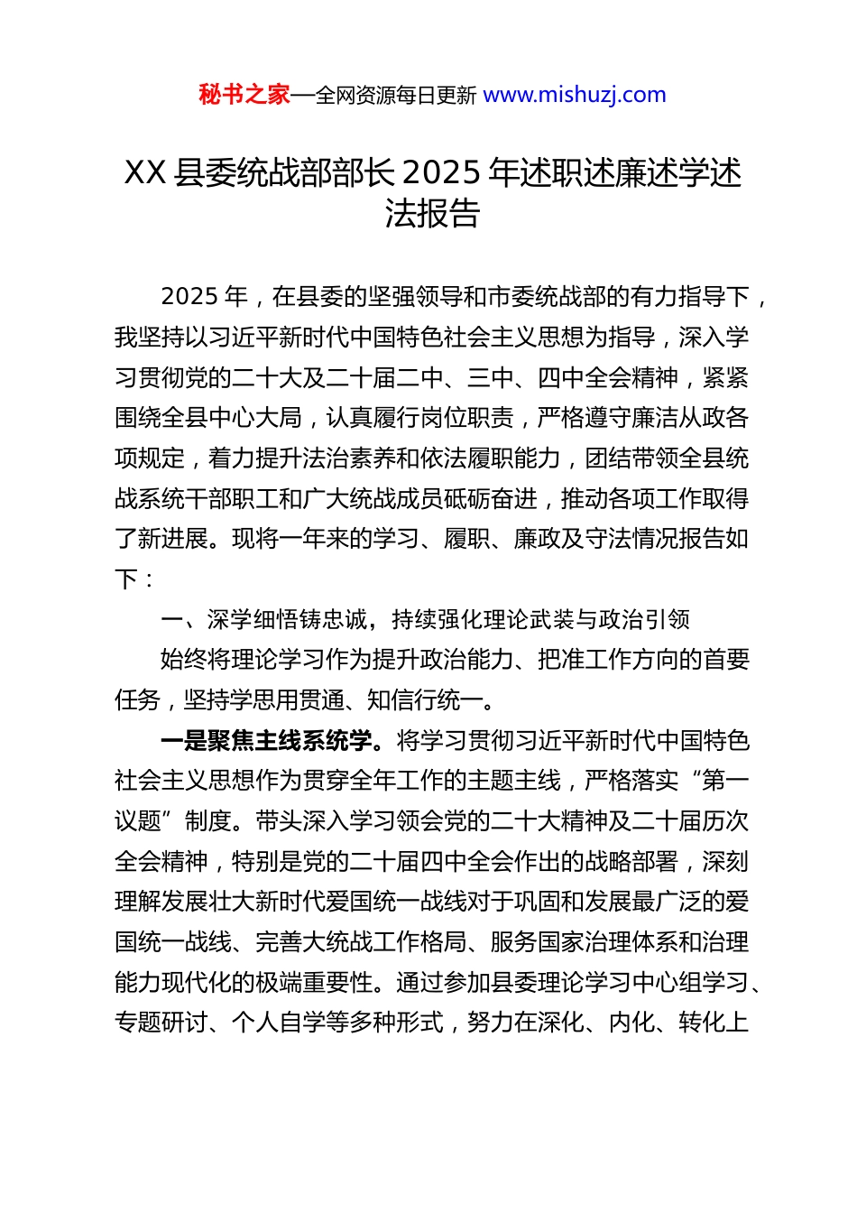 秘书之家—全网资源每日更新 www.mishuzj.comXX 县委统战部部长 2025 年述职述廉述学述法报告2025 年,在县委的坚强领导和市委统战部的有力指导下,我坚持以习近平新时代中国特色社会主义思想为指导,深入学习贯彻党的二十大及二十届二中、三中、四中全会精神,紧紧围绕全县中心大局,认真履行岗位职责,严格遵守廉洁从政各项规定,着力提升法治素养和依法履职能力,团结带领全县统战系统干部职工和广大统战成员砥砺奋进,推动各项工作取得了新进展。现将一年来的学习、履职、廉政及守法情况报告如下:一、深学细悟铸忠诚,持续强化理论武装与政治引领始终将理论学习作为提升政治能力、把准工作方向的首要任务,坚持学思用贯通、知信行统一。一是聚焦主线系统学。将学习贯彻习近平新时代中国特色社会主义思想作为贯穿全年工作的主题主线,严格落实“第一议题”制度。带头深入学习领会党的二十大精神及二十届历次全会精神,特别是党的二十届四中全会作出的战略部署,深刻理解发展壮大新时代爱国统一战线对于巩固和发展最广泛的爱国统一战线、完善大统战工作格局、服务国家治理体系和治理能力现代化的极端重要性。通过参加县委理论学习中心组学习、专题研讨、个人自学等多种形式,努力在深化、内化、转化上秘书之家—全网资源每日更新 www.mishuzj.com下功夫,不断提升政治判断力、政治领悟力、政治执行力,自觉做“两个确立”的忠诚拥护者和“两个维护”的坚定践行者。二是创新载体拓展学。积极构建并参与“三位一体”学习矩阵。牵头举办统战系统专题读书班、研讨交流会,邀请专家深度解读中央关于统战工作、民族宗教工作、民营经济统战工作等系列重大决策部署。充分利用“网学统战”等线上平台,及时学习最新政策理论和先进经验。组织并参与赴红色教育基地、乡村振兴示范点的现场教学,在沉浸式体验中深化对国情、省情、县情的认识,强化服务中心大局的行动自觉。全年牵头或参与组织各类学习培训活动覆盖 1600 余人次,有效夯实了与党同心奋斗的共同思想政治基础。三是联系实际融合学。坚持理论联系实际的马克思主义学风,将学习党的创新理论与谋划推动全县统战工作高质量发展紧密结合。特别是围绕党的二十届四中全会提出的“完善大统战工作格局”等要求,深入思考如何进一步健全县委统一领导、统战部门牵头协调、有关方面各负其责的工作机制,并在实践中不断优化完善。将学习成果转化为谋划工作的思路、破解难题的办法、推动落实的举措,确保中央和省委、市委、县委的各项决策部署在统战领域不折不扣落地见效。二、履职尽责显担当,全力推动统战工作服务高质量发展始终坚持围绕中心、服务大局,认真履行县委统战部部长职责,推动各领域统战工作提质增效。秘书之家—全网资源每日更新 www.mishuzj.com(一)突出政治引领,完善大统战工作格局。积极协助县委履行统战工作主体责任,推动将统战工作纳入全县发展“大盘棋”通盘谋划。全年提请或协助县委主要领导主持召开统战工作专题会议 6 次,研究解决重点难点问题。充分发挥县委统战工作领导小组办公室牵头抓总、协调各方作用,全年牵头或参与组织召开各类协调会、部署会、推进会 40 次,推动“党委统一领导、统战部门牵头协调、有关方面各负其责”的大统战工作格局运转更加顺畅高效,凝聚了齐抓共管的强大合力。(二)聚焦服务大局,彰显统一战线法宝作用。着力促进“两个健康”,服务民营经济发展。持续深化“千企调研纾困”行动,带头并组织领导干部走访企业 80 余家,主持召开政企银企恳谈会 8 场,协调解决融资、用工等难题 50 余个。推动建立“维权服务热线”,优化法治化营商环境。积极拓展对外联系,牵头签订友好商会协议,助力招商引智。引导民营企业履行社会责任,推动“万企兴万村”行动落实帮扶捐赠 94.82 万元。着力发挥制度效能,支持参政议政、民主监督。认真贯彻《中国共产党政治协商工作条例》,规范组织召开党外人士专题协商座谈会,围绕黄河流域生态保护、乡村振兴等县委“3456”发展战略中的重大课题,支持党外人士形成高质量调研报告 5 篇,推动 40 余条意见建议转化运用。顺利完成...