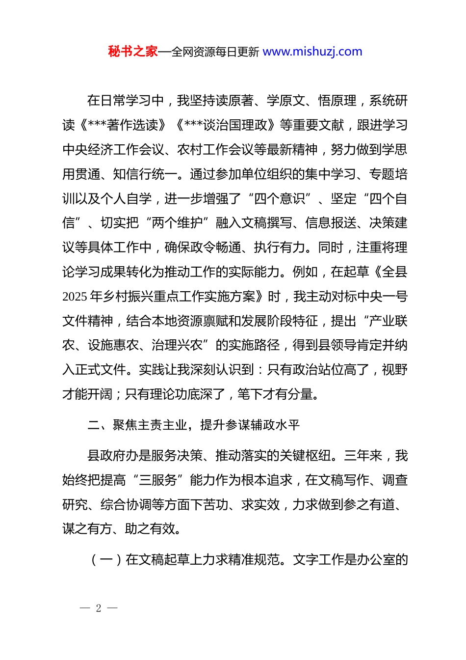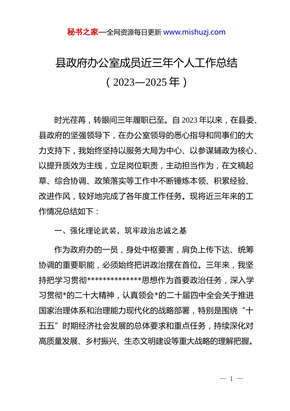 秘书之家—全网资源每日更新 www.mishuzj.com县政府办公室成员近三年个人工作总结(2023—2025 年)时光荏苒,转眼间三年履职已至。自 2023 年以来,在县委、县政府的坚强领导下,在办公室领导的悉心指导和同事们的大力支持下,我始终坚持以服务大局为中心、以参谋辅政为核心、以提升质效为主线,立足岗位职责,主动担当作为,在文稿起草、综合协调、政策落实等工作中不断锤炼本领、积累经验、改进作风,较好地完成了各年度工作任务。现将近三年来的工作情况总结如下:一、强化理论武装,筑牢政治忠诚之基作为政府办的一员,身处中枢要害,肩负上传下达、统筹协调的重要职能,必须始终把讲政治摆在首位。三年来,我坚持把学习贯彻**************思想作为首要政治任务,深入学习贯彻*的二十大精神,认真领会*的二十届四中全会关于推进国家治理体系和治理能力现代化的战略部署,特别是围绕“十五五”时期经济社会发展的总体要求和重点任务,持续深化对高质量发展、乡村振兴、生态文明建设等重大战略的理解把握。— 1 —秘书之家—全网资源每日更新 www.mishuzj.com在日常学习中,我坚持读原著、学原文、悟原理,系统研读《***著作选读》《***谈治国理政》等重要文献,跟进学习中央经济工作会议、农村工作会议等最新精神,努力做到学思用贯通、知信行统一。通过参加单位组织的集中学习、专题培训以及个人自学,进一步增强了“四个意识”、坚定“四个自信”、切实把“两个维护”融入文稿撰写、信息报送、决策建议等具体工作中,确保政令畅通、执行有力。同时,注重将理论学习成果转化为推动工作的实际能力。例如,在起草《全县2025 年乡村振兴重点工作实施方案》时,我主动对标中央一号文件精神,结合本地资源禀赋和发展阶段特征,提出“产业联农、设施惠农、治理兴农”的实施路径,得到县领导肯定并纳入正式文件。实践让我深刻认识到:只有政治站位高了,视野才能开阔;只有理论功底深了,笔下才有分量。二、聚焦主责主业,提升参谋辅政水平县政府办是服务决策、推动落实的关键枢纽。三年来,我始终把提高“三服务”能力作为根本追求,在文稿写作、调查研究、综合协调等方面下苦功、求实效,力求做到参之有道、谋之有方、助之有效。(一)在文稿起草上力求精准规范。文字工作是办公室的— 2 —秘书之家—全网资源每日更新 www.mishuzj.com核心业务之一。三年来,我牵头或参与起草各类综合性材料 68篇,其中主要包括:县政府工作报告 3 篇、全县经济工作会议讲话 5 篇、主要领导在省委巡视整改动员会、市委全会汇报材料等重大场合发言稿 12 篇,以及各类通知、通报、方案等日常公文 200 余件。在写作过程中,始终坚持“吃透上情、摸清下情、掌握实情”的原则,注重把握政策导向、领导风格和现实需要,力求每一篇材料都主题鲜明、逻辑严密、语言精练。特别是在每年年初《政府工作报告》起草期间,我全程参与调研座谈、意见征集、框架拟定、初稿撰写等工作,累计走访部门20 余个、乡镇 15 个,收集意见建议 130 余条,并据此梳理形成“十大民生实事项目清单”建议稿,被采纳 9 项。报告最终以“数据+案例+举措”的方式呈现发展成效,既体现了客观性,又增强了可读性,获得代表委员广泛好评。(二)在调查研究上坚持问题导向。没有调查就没有发言权。三年来,我围绕县域经济社会发展中的难点堵点问题,独立或协同开展专题调研 18 次,形成调研报告 12 篇,其中《关于我县农业产业化龙头企业带动能力的调研与思考》《农村养老服务体系现状及对策建议》《基层减负落地难问题探析》等5 篇报告获县长批示,并转化为具体政策措施。例如,在调研— 3 —秘书之家—全网资源每日更新 www.mishuzj.com村级集体经济薄弱村过程中,我发现部分村庄存在“有资源无运营、有资产无收益”的现象。经过实地走访和数据分析,我在报告中提出“盘活闲置资产、推行跨村联营、建立收益分配机制”三项建议,推动县里出台《扶持壮大村级集体经济三年行动计划》,设立专项扶持资金**万元,2025 年底全县村均集体收入达**万元,较 2023 年增长 58%。(三)在综合协调上注重高...