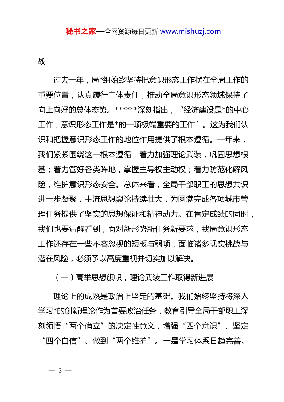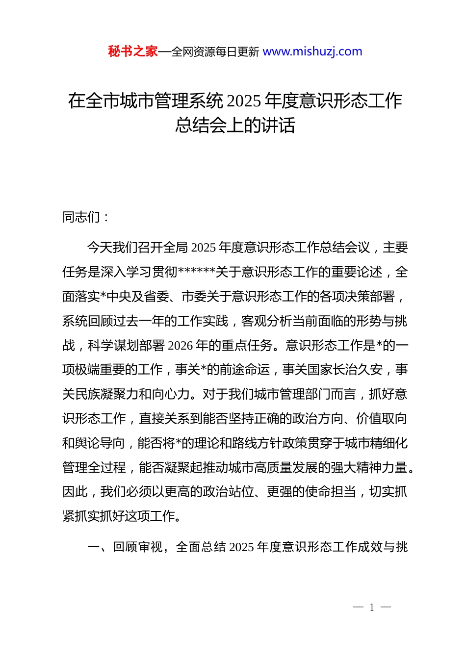 秘书之家—全网资源每日更新 www.mishuzj.com在全市城市管理系统 2025 年度意识形态工作总结会上的讲话 同志们:今天我们召开全局 2025 年度意识形态工作总结会议,主要任务是深入学习贯彻******关于意识形态工作的重要论述,全面落实*中央及省委、市委关于意识形态工作的各项决策部署,系统回顾过去一年的工作实践,客观分析当前面临的形势与挑战,科学谋划部署 2026 年的重点任务。意识形态工作是*的一项极端重要的工作,事关*的前途命运,事关国家长治久安,事关民族凝聚力和向心力。对于我们城市管理部门而言,抓好意识形态工作,直接关系到能否坚持正确的政治方向、价值取向和舆论导向,能否将*的理论和路线方针政策贯穿于城市精细化管理全过程,能否凝聚起推动城市高质量发展的强大精神力量。因此,我们必须以更高的政治站位、更强的使命担当,切实抓紧抓实抓好这项工作。一、回顾审视,全面总结 2025 年度意识形态工作成效与挑— 1 —秘书之家—全网资源每日更新 www.mishuzj.com战过去一年,局*组始终坚持把意识形态工作摆在全局工作的重要位置,认真履行主体责任,推动全局意识形态领域保持了向上向好的总体态势。******深刻指出,“经济建设是*的中心工作,意识形态工作是*的一项极端重要的工作”。这为我们认识和把握意识形态工作的地位作用提供了根本遵循。一年来,我们紧紧围绕这一根本遵循,着力加强理论武装,巩固思想根基;着力管好各类阵地,掌握主导权主动权;着力防范化解风险,维护意识形态安全。总体来看,全局干部职工的思想共识进一步凝聚,主流思想舆论持续壮大,为圆满完成各项城市管理任务提供了坚实的思想保证和精神动力。在肯定成绩的同时,我们也要清醒看到,面对新形势新任务新要求,我局意识形态工作还存在一些不容忽视的短板与弱项,面临诸多现实挑战与潜在风险,必须予以高度重视并切实加以解决。(一)高举思想旗帜,理论武装工作取得新进展理论上的成熟是政治上坚定的基础。我们始终坚持将深入学习*的创新理论作为首要政治任务,教育引导全局干部职工深刻领悟“两个确立”的决定性意义,增强“四个意识”、坚定“四个自信”、做到“两个维护”。一是学习体系日趋完善。— 2 —秘书之家—全网资源每日更新 www.mishuzj.com严格落实“第一议题”制度,全年组织*组理论学习中心组专题学习 15 次,其中围绕意识形态专题开展深入学习研讨 4 次。制定并实施了年度*员干部理论学习计划,将意识形态相关内容作为必修课,确保学习覆盖所有支部、所有*员,并向全体干部职工延伸。运用线上线下相结合的方式,依托学习强国平台、局内部学习专栏等载体,推送学习资料超过 500 篇,组织线上知识测试 8 次,参考率达 98.5%,平均分达到优良水平。二是理解把握持续深化。通过专题读书班、辅导报告、交流研讨等多种形式,引导干部职工特别是领导干部,深刻理解******关于意识形态工作、城市管理工作等重要论述的核心要义、精神实质、丰富内涵和实践要求。重点围绕“人民城市人民建,人民城市为人民”的重要理念,结合市容环境整治、垃圾分类推进、城管执法规范化等具体工作,开展理论联系实际的研讨,推动*的创新理论入脑入心、指导实践。三是转化运用初见成效。坚持学思用贯通、知信行统一,努力将学习成果转化为推动城市管理工作的思路举措和实际成效。在谋划年度重点工作、制定重大政策、推进重大改革时,自觉对标对表*中央精神,确保城市管理工作始终沿着正确政治方向前进。干部职工运用*的立场观点方法分析解决实际问题的能力有所提升,在应对复杂舆情、处理群众关切、破解管理难题时,政治判断力、政治领悟力、— 3 —秘书之家—全网资源每日更新 www.mishuzj.com政治执行力得到进一步锻炼。(二)巩固主流舆论,阵地建设管理展现新作为意识形态阵地我们不去占领,各种错误思想就会去占领。我们深刻认识到,管好用好各类意识形态阵地是掌握工作主导权的关键所在。一是传统阵地巩固加强。局门户网站、内部刊物、宣传栏等平台的管理责任得到进一步压实,内容审核发布流程更加严格规范,确保信息的准确性、权威性和导向的正确性...