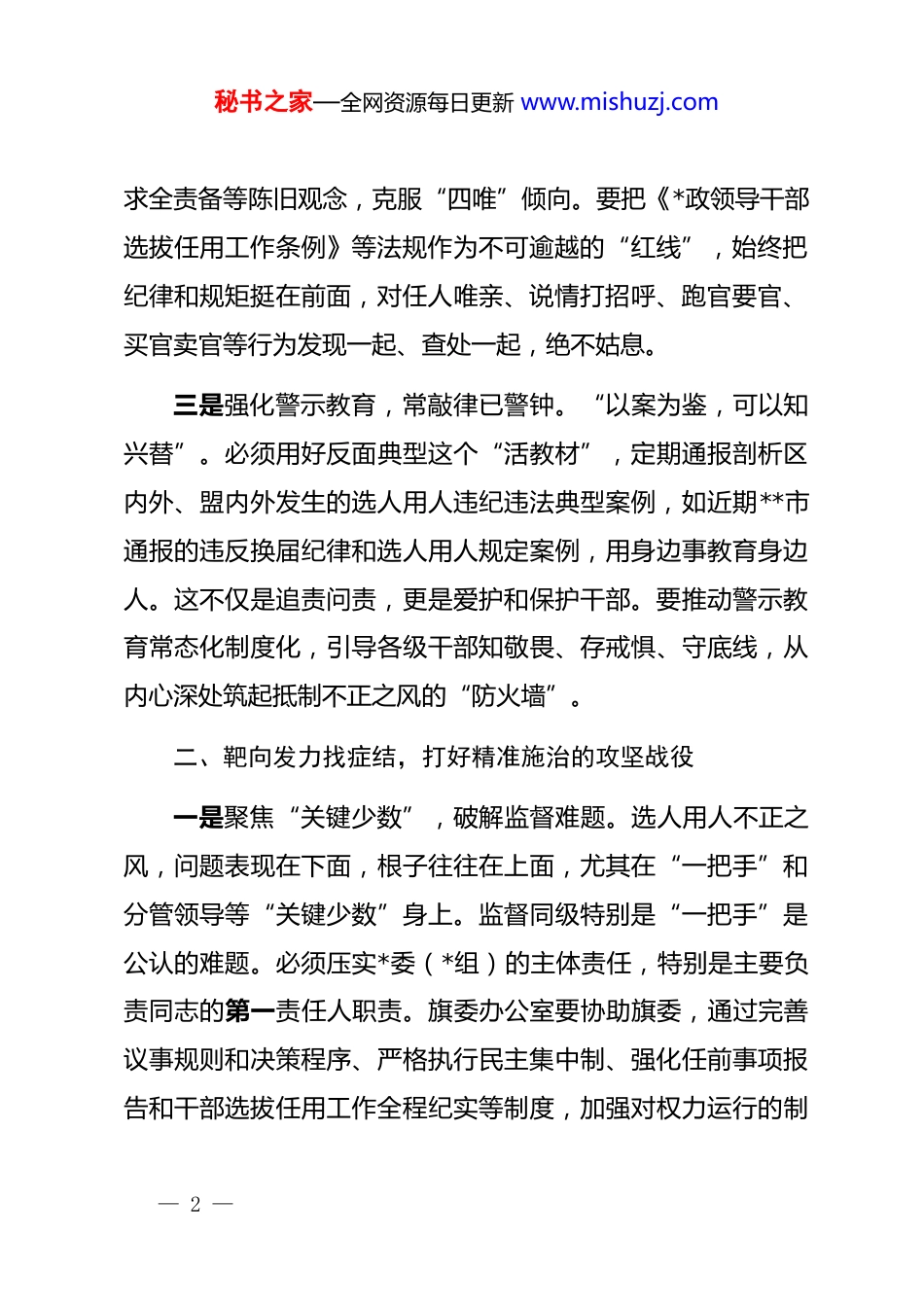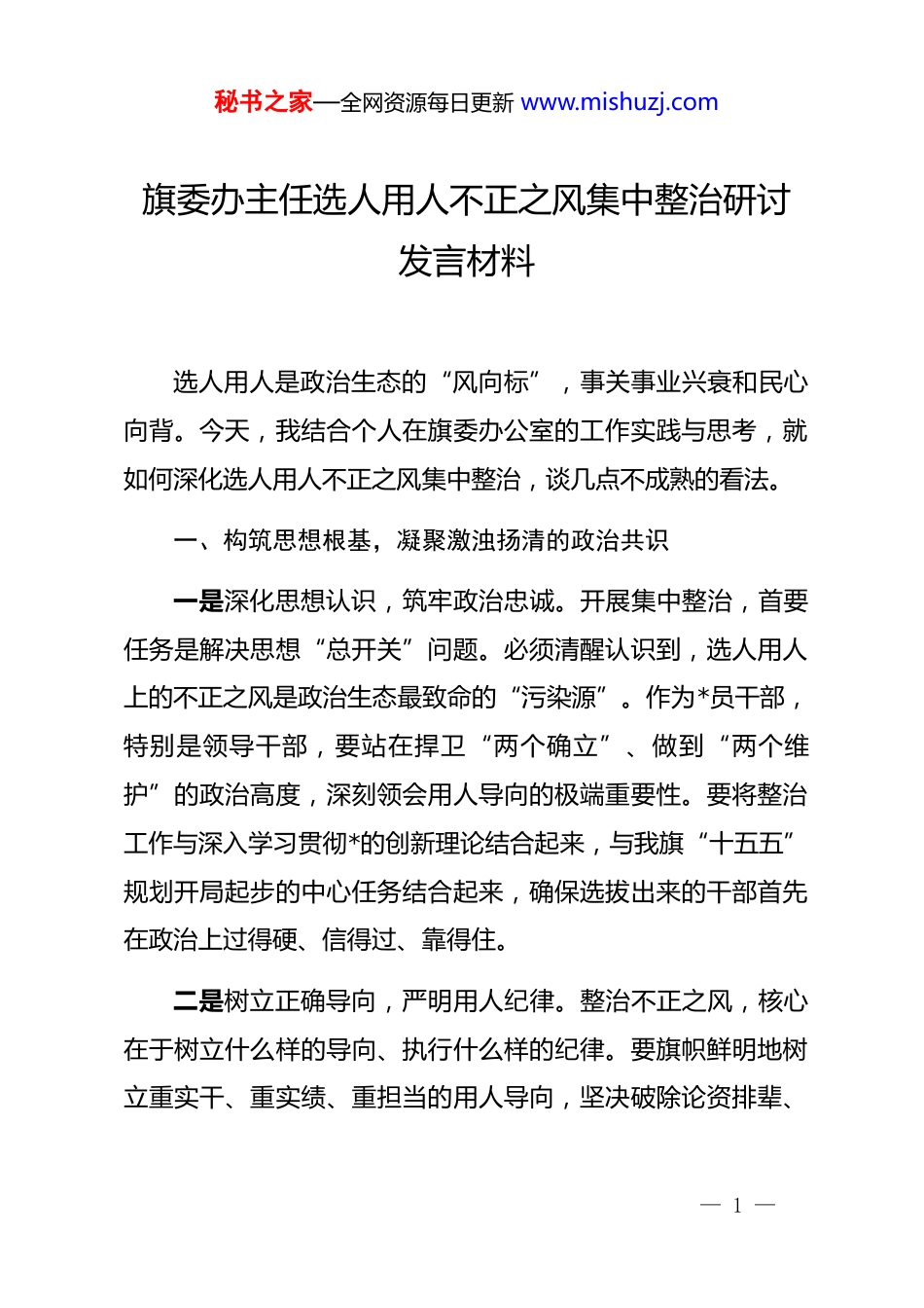 秘书之家—全网资源每日更新 www.mishuzj.com旗委办主任选人用人不正之风集中整治研讨发言材料选人用人是政治生态的“风向标”,事关事业兴衰和民心向背。今天,我结合个人在旗委办公室的工作实践与思考,就如何深化选人用人不正之风集中整治,谈几点不成熟的看法。一、构筑思想根基,凝聚激浊扬清的政治共识一是深化思想认识,筑牢政治忠诚。开展集中整治,首要任务是解决思想“总开关”问题。必须清醒认识到,选人用人上的不正之风是政治生态最致命的“污染源”。作为*员干部,特别是领导干部,要站在捍卫“两个确立”、做到“两个维护”的政治高度,深刻领会用人导向的极端重要性。要将整治工作与深入学习贯彻*的创新理论结合起来,与我旗“十五五”规划开局起步的中心任务结合起来,确保选拔出来的干部首先在政治上过得硬、信得过、靠得住。二是树立正确导向,严明用人纪律。整治不正之风,核心在于树立什么样的导向、执行什么样的纪律。要旗帜鲜明地树立重实干、重实绩、重担当的用人导向,坚决破除论资排辈、— 1 —秘书之家—全网资源每日更新 www.mishuzj.com求全责备等陈旧观念,克服“四唯”倾向。要把《*政领导干部选拔任用工作条例》等法规作为不可逾越的“红线”,始终把纪律和规矩挺在前面,对任人唯亲、说情打招呼、跑官要官、买官卖官等行为发现一起、查处一起,绝不姑息。三是强化警示教育,常敲律已警钟。“以案为鉴,可以知兴替”。必须用好反面典型这个“活教材”,定期通报剖析区内外、盟内外发生的选人用人违纪违法典型案例,如近期**市通报的违反换届纪律和选人用人规定案例,用身边事教育身边人。这不仅是追责问责,更是爱护和保护干部。要推动警示教育常态化制度化,引导各级干部知敬畏、存戒惧、守底线,从内心深处筑起抵制不正之风的“防火墙”。二、靶向发力找症结,打好精准施治的攻坚战役一是聚焦“关键少数”,破解监督难题。选人用人不正之风,问题表现在下面,根子往往在上面,尤其在“一把手”和分管领导等“关键少数”身上。监督同级特别是“一把手”是公认的难题。必须压实*委(*组)的主体责任,特别是主要负责同志的第一责任人职责。旗委办公室要协助旗委,通过完善议事规则和决策程序、严格执行民主集中制、强化任前事项报告和干部选拔任用工作全程纪实等制度,加强对权力运行的制— 2 —秘书之家—全网资源每日更新 www.mishuzj.com约和监督,确保选人用人权在阳光下运行。二是紧盯“关键环节”,堵塞制度漏洞。动议、民主推荐、考察、讨论决定、任职,是干部选拔任用的五个关键环节,也是不正之风易发多发的“风险点”。必须坚持问题导向,对现有制度流程进行全面审视和梳理。比如,在考察环节,如何防止“失真失实”?在讨论决定环节,如何防止个人说了算?要进一步细化和规范操作规程,严格执行任前公示、干部选拔任用工作“一报告两评议”等制度,让程序成为防止不正之风的“铁闸”。三是根除“圈子文化”,净化政治生态。“任人唯亲、排斥异己”等“圈子文化”是选人用人不正之风的突出表现,严重损害*的团结统一。必须下大力气整治搞小山头、小圈子、小团伙的行为,教育引导干部破除“门第”“出身”等封建观念。要坚持五湖四海,拓宽选人视野,不拘一格选人才,注重从基层一线、艰苦岗位和关键时刻考验中发现、培养和使用干部,让投机钻营者无机可乘,让踏实干事者脱颖而出。三、结合工作出务实举措,构建风清气正的长效机制一是强化协同联动,凝聚整治合力。整治选人用人不正之— 3 —秘书之家—全网资源每日更新 www.mishuzj.com风是一项系统工程,单靠任何一个部门都难以完成。作为旗委办公室主任,我的一个重要职责就是发挥好承上启下、协调各方的作用。要积极协助旗委,建立健全由组织部门牵头,纪检监察、政法、审计、信访等部门共同参与的联席会议制度,实现信息互通、资源共享、工作联动。对发现的违规违纪线索,要建立快速移送、优先办理、限期反馈的协同查处机制,形成“组合拳”效应二是坚持公道正派,优化选任流程。作为服务旗委决策的中枢机构,旗委办公室在干部选任的某些环节中也扮演着重要角色。我将始...