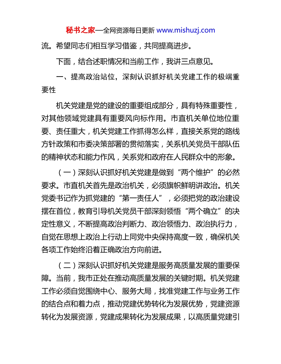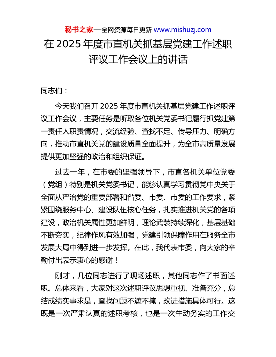 秘书之家—全网资源每日更新 www.mishuzj.com在 2025 年度市直机关抓基层党建工作述职评议工作会议上的讲话同志们:今天我们召开 2025 年度市直机关抓基层党建工作述职评议工作会议,主要任务是听取各位机关党委书记履行抓党建第一责任人职责情况,交流经验、查找不足、传导压力、明确方向,推动市直机关党的建设质量全面提升,为全市高质量发展提供更加坚强的政治和组织保证。过去一年,在市委的坚强领导下,市直各机关单位党委(党组)特别是机关党委书记,能够认真学习贯彻党中央关于全面从严治党的重要部署和省委、市委、市委的工作要求,紧紧围绕服务中心、建设队伍核心任务,扎实推进机关党的各项建设,政治机关属性更加鲜明,理论武装持续深化,基层基础不断夯实,纪律作风有效加强,党建引领保障作用在服务全市发展大局中得到进一步发挥。在此,我代表市委,向大家的辛勤付出表示衷心的感谢!刚才,几位同志进行了现场述职,其他同志作了书面述职。总体来看,大家对这次述职评议思想重视、准备充分,总结成绩实事求是,查找问题不遮不掩,改进措施具体可行。这既是一次严肃认真的述职考核,也是一次生动务实的工作交秘书之家—全网资源每日更新 www.mishuzj.com流。希望同志们相互学习借鉴,共同提高进步。下面,结合述职情况和当前工作,我讲三点意见。一、提高政治站位,深刻认识抓好机关党建工作的极端重要性机关党建是党的建设的重要组成部分,具有特殊重要性,对其他领域党建具有重要风向标作用。市直机关单位地位重要、责任重大,机关党建工作抓得怎么样,直接关系党的路线方针政策和市委决策部署的贯彻落实,关系机关党员干部队伍的精神状态和能力作风,关系党和政府在人民群众中的形象。(一)深刻认识抓好机关党建是做到“两个维护”的必然要求。市直机关首先是政治机关,必须旗帜鲜明讲政治。机关党委书记作为抓党建的“第一责任人”,必须把党的政治建设摆在首位,教育引导机关党员干部深刻领悟“两个确立”的决定性意义,不断提高政治判断力、政治领悟力、政治执行力,自觉在思想上政治上行动上同党中央保持高度一致,确保机关各项工作始终沿着正确政治方向前进。(二)深刻认识抓好机关党建是服务高质量发展的重要保障。当前,我市正处在推动高质量发展的关键时期。机关党建工作必须自觉围绕中心、服务大局,找准党建工作与业务工作的结合点和着力点,推动党建优势转化为发展优势,党建资源转化为发展资源,党建成果转化为发展成果,以高质量党建引秘书之家—全网资源每日更新 www.mishuzj.com领保障高质量发展。(三)深刻认识抓好机关党建是锻造过硬队伍的现实需要。机关党员干部是推动各项事业发展的中坚力量。抓好机关党建,就是要坚持严管和厚爱结合、激励和约束并重,着力建设一支政治强、业务精、作风硬的机关党员干部队伍,激发干事创业的内生动力,为完成各项艰巨繁重任务提供坚强的组织保证和人才支撑。二、坚持问题导向,准确把握机关党建工作面临的新情况新挑战在肯定成绩的同时,我们也要清醒地看到,对照新时代党的建设总要求,对照市委的期望和基层群众的期待,我市机关党建工作还存在一些不容忽视的短板和弱项。比如:有的单位党建工作与业务工作“两张皮”现象依然存在,融合不够紧密;有的基层党组织政治功能和组织功能发挥还不够充分,战斗堡垒作用有待加强;有的党员教育管理方式方法较为单一,针对性、实效性有待提升;有的单位全面从严治党压力传导存在层层递减现象,“四风”问题尤其是形式主义、官僚主义仍有表现;机关党建品牌创建和典型培育力度还需加大,等等。这些问题,既有共性的,也有个性的,都需要我们在今后的工作中高度重视,采取有力措施切实加以解决。这次述职评议考核,既是对过去一年工作的盘点检视,更是对存在问题的秘书之家—全网资源每日更新 www.mishuzj.com一次集中把脉。希望大家以此次会议为契机,主动对号入座,深刻反思剖析,列出问题清单、责任清单、整改清单,以钉钉子精神抓好整改落实。三、聚焦重点任务,奋力推动 2025 年机关党建工作再上新台阶2026 年是实施“十五五”规划的开局之年,做...