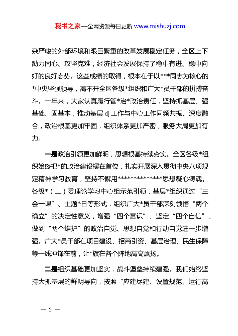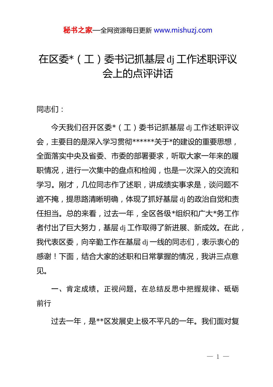 秘书之家—全网资源每日更新 www.mishuzj.com在区委*(工)委书记抓基层 dj 工作述职评议会上的点评讲话同志们:今天我们召开区委*(工)委书记抓基层 dj 工作述职评议会,主要目的是深入学习贯彻******关于*的建设的重要思想,全面落实中央及省委、市委的部署要求,听取大家一年来的履职情况,进行一次集中的盘点和检阅,也是一次深入的交流和学习。刚才,几位同志作了述职,讲成绩实事求是,谈问题不遮不掩,提思路清晰明确,体现了抓好基层 dj 的政治自觉和责任担当。总的来看,过去一年,全区各级*组织和广大*务工作者付出了巨大努力,基层 dj 工作取得了新进展、新成效。在此,我代表区委,向辛勤工作在基层 dj 一线的同志们,表示衷心的感谢!下面,结合大家的述职和日常掌握的情况,我讲三点意见。一、肯定成绩,正视问题,在总结反思中把握规律、砥砺前行过去一年,是**区发展史上极不平凡的一年。我们面对复— 1 —秘书之家—全网资源每日更新 www.mishuzj.com杂严峻的外部环境和艰巨繁重的改革发展稳定任务,全区上下勠力同心、攻坚克难,经济社会发展保持了稳中有进、稳中向好的良好态势。这些成绩的取得,根本在于以***同志为核心的*中央坚强领导,离不开全区各级*组织和广大*员干部的拼搏奋斗。一年来,大家认真履行管*治*政治责任,坚持抓基层、强基础、固基本,推动基层 dj 工作与中心工作同频共振、深度融合,政治根基更加牢固,组织体系更加严密,服务大局更加有力。一是政治引领更加鲜明,思想根基持续夯实。全区各级*组织始终把*的政治建设摆在首位,扎实开展深入贯彻中央八项规定精神学习教育,坚持不懈用**************思想凝心铸魂。各级*(工)委理论学习中心组示范引领,基层*组织通过“三会一课”、主题*日等形式,组织广大*员干部深刻领悟“两个确立”的决定性意义,增强“四个意识”、坚定“四个自信”、做到“两个维护”的政治自觉、思想自觉和行动自觉进一步增强。广大*员干部在项目建设、招商引资、基层治理、民生保障等一线冲锋在前,让*旗在各个阵地高高飘扬。二是组织基础更加坚实,战斗堡垒持续建强。我们始终坚持大抓基层的鲜明导向,按照“应建尽建、设置规范、运行高— 2 —秘书之家—全网资源每日更新 www.mishuzj.com效”的原则,不断优化组织设置。特别是在“两企三新”等新兴领域,我们积极探索*组织覆盖的有效路径,新建非公企业和社会组织*组织超过 30 个,*的组织和工作覆盖面不断扩大。我们持续深化基层管理体制改革,落实镇(街道)履职事项清单,推动资源、服务、管理向基层倾斜。去年,区级财政投入基层dj 工作经费达到 1.35 亿元,通过新建、改扩建、升级改造等方式,高标准建成 52 个*群服务中心,基层*组织有钱办事、有人管事、有场所议事的保障水平显著提升。三是服务大局更加有力,dj 效能持续彰显。大家自觉把基层 dj 工作放到全区发展大局中去谋划、去推进,找准了 dj 引领发展的切入点和着力点。在推动产业转型方面,我们探索产业链 dj 联盟,把*组织建在项目上、建在产业链上,有效破解了一批企业发展的瓶颈难题。在深化基层治理方面,我们坚持和发展新时代“枫桥经验”,优化网格化管理服务体系,深化“街道吹哨、部门报到”机制,去年全区通过网格化体系化解矛盾纠纷 3000 余起,解决群众急难愁盼问题 5000 余个,基层治理的精细化、高效化水平明显提升。在乡村振兴方面,我们大力实施“头雁”工程,选优配强村*组织书记,发展壮大村级集体经济,去年全区村级集体经济总收入突破了 2 亿元大关,— 3 —秘书之家—全网资源每日更新 www.mishuzj.com涌现出一批先进典型。成绩固然可喜,但问题不容忽视。从刚才大家的述职和我们日常督查调研掌握的情况看,全区基层 dj 工作还存在一些短板和不足,必须引起我们的高度重视。主要表现在以下几个方面:第一,政治功能发挥还不够充分。有的基层*组织政治引领作用发挥不明显,学习贯彻上级决策部署满足于“传达了、学习了”,与本地区本单位实际结合不紧密,存在“上热中温下冷”的现象。有的*组织书记对如何把*的政治优势、组织...