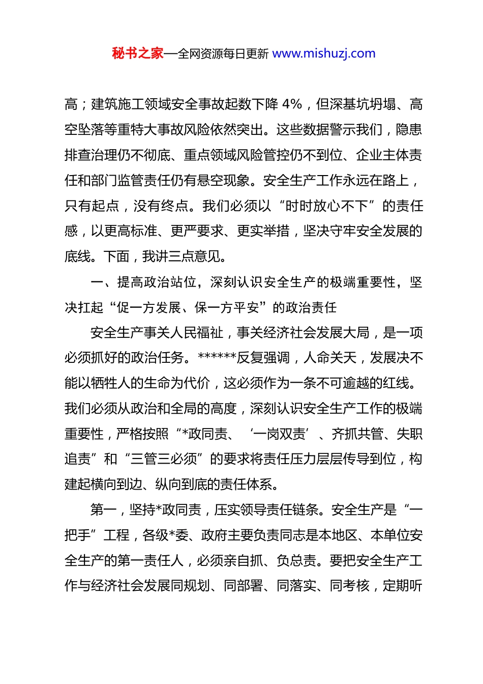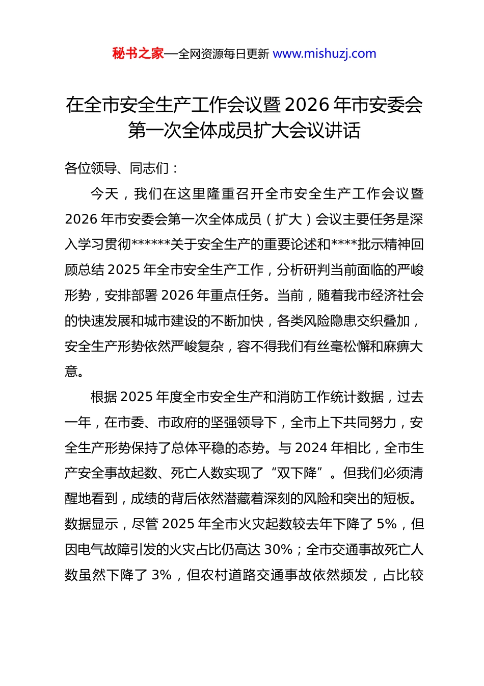 秘书之家—全网资源每日更新 www.mishuzj.com在全市安全生产工作会议暨 2026 年市安委会第一次全体成员扩大会议讲话各位领导、同志们:今天,我们在这里隆重召开全市安全生产工作会议暨2026 年市安委会第一次全体成员(扩大)会议主要任务是深入学习贯彻******关于安全生产的重要论述和****批示精神回顾总结 2025 年全市安全生产工作,分析研判当前面临的严峻形势,安排部署 2026 年重点任务。当前,随着我市经济社会的快速发展和城市建设的不断加快,各类风险隐患交织叠加,安全生产形势依然严峻复杂,容不得我们有丝毫松懈和麻痹大意。根据 2025 年度全市安全生产和消防工作统计数据,过去一年,在市委、市政府的坚强领导下,全市上下共同努力,安全生产形势保持了总体平稳的态势。与 2024 年相比,全市生产安全事故起数、死亡人数实现了“双下降”。但我们必须清醒地看到,成绩的背后依然潜藏着深刻的风险和突出的短板。数据显示,尽管 2025 年全市火灾起数较去年下降了 5%,但因电气故障引发的火灾占比仍高达 30%;全市交通事故死亡人数虽然下降了 3%,但农村道路交通事故依然频发,占比较秘书之家—全网资源每日更新 www.mishuzj.com高;建筑施工领域安全事故起数下降 4%,但深基坑坍塌、高空坠落等重特大事故风险依然突出。这些数据警示我们,隐患排查治理仍不彻底、重点领域风险管控仍不到位、企业主体责任和部门监管责任仍有悬空现象。安全生产工作永远在路上,只有起点,没有终点。我们必须以“时时放心不下”的责任感,以更高标准、更严要求、更实举措,坚决守牢安全发展的底线。下面,我讲三点意见。一、提高政治站位,深刻认识安全生产的极端重要性,坚决扛起“促一方发展、保一方平安”的政治责任安全生产事关人民福祉,事关经济社会发展大局,是一项必须抓好的政治任务。******反复强调,人命关天,发展决不能以牺牲人的生命为代价,这必须作为一条不可逾越的红线。我们必须从政治和全局的高度,深刻认识安全生产工作的极端重要性,严格按照“*政同责、‘一岗双责’、齐抓共管、失职追责”和“三管三必须”的要求将责任压力层层传导到位,构建起横向到边、纵向到底的责任体系。第一,坚持*政同责,压实领导责任链条。安全生产是“一把手”工程,各级*委、政府主要负责同志是本地区、本单位安全生产的第一责任人,必须亲自抓、负总责。要把安全生产工作与经济社会发展同规划、同部署、同落实、同考核,定期听秘书之家—全网资源每日更新 www.mishuzj.com取安全生产工作汇报,分析研判形势,研究解决重大问题。要将安全生产工作成效作为衡量领导班子和领导干部政绩的重要标准,纳入年度考核、绩效考核、干部选拔任用全过程,对安全生产工作重视不够、措施不力、成效不彰的,要进行严肃的约谈和问责,树立起“抓安全就是抓发展,抓不好安全就是失职”的鲜明导向。第二,坚持“一岗双责”,压实部门监管责任。安全生产不是应急管理部门一家的事,而是所有行业主管部门的共同责任。各级领导干部必须牢固树立“管行业必须管安全、管业务必须管安全、管生产经营必须管安全”的理念切实履行好分管领域内的安全生产职责。要坚决破除“安全生产是技术活”“安全生产是下属部门的事”等错误观念,将安全监管融入行业规划、产业政策、法规标准、行政许可等各项工作之中,做到业务工作与安全工作同研究、同部署。要厘清各部门安全监管职责边界,特别是对新兴行业、交叉领域,要按照“谁主管、谁负责”“谁审批、谁负责”的原则,及时明确监管责任主体,消除监管盲区和真空地带。第三,坚持齐抓共管,压实企业主体责任。企业是安全生产的责任主体,是各项安全规章制度的最终落脚点。我们必须督促企业把安全生产主体责任真正扛在肩上、落在实处。要加秘书之家—全网资源每日更新 www.mishuzj.com强部门间的协作联动,打破信息壁垒,建立健全信息共享、联合执法、案件移送等工作机制,形成齐抓共管的强大合力。要推动企业建立健全全员安全生产责任制,从法定代表人、实际控制人到一线班组长和普通员工,逐级明确并落实安全责任。要加大对企业安全生产投入的监管...