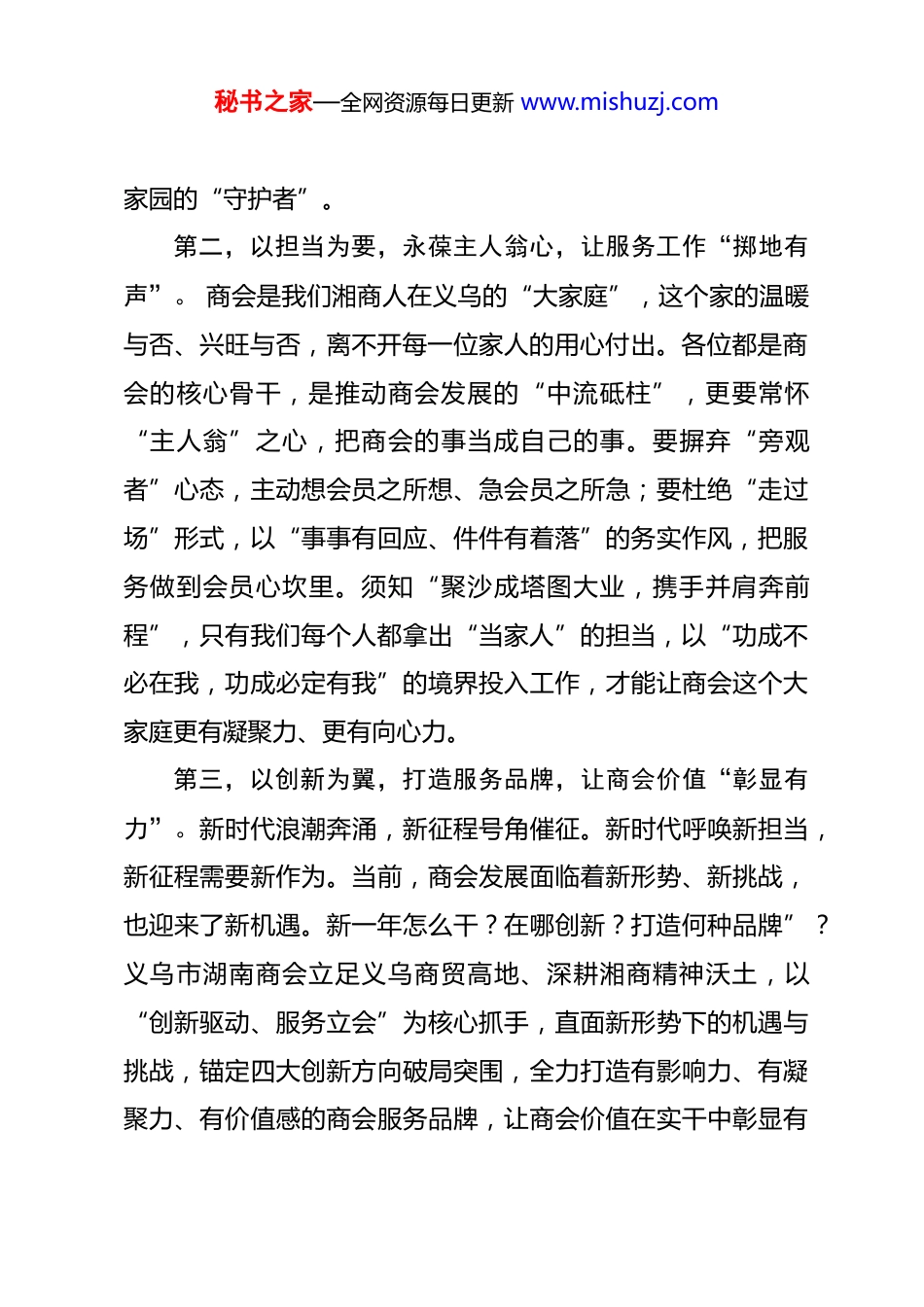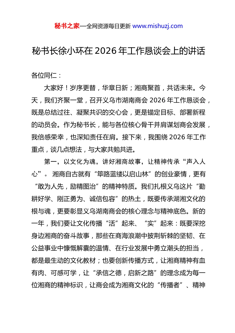 秘书之家—全网资源每日更新 www.mishuzj.com秘书长徐小环在 2026 年工作恳谈会上的讲话各位同仁:大家好!岁序更替,华章日新;湘商聚首,共话未来。今天,我们齐聚一堂,召开义乌市湖南商会 2026 年工作恳谈会,既是总结过往、凝聚共识的交心会,更是锚定目标、部署新程的动员会。作为秘书长,能与各位核心骨干并肩谋划商会发展,我倍感荣幸,也深知责任在肩。接下来,我围绕 2026 年工作重点,谈几点想法,与大家共勉共进。第一,以文化为魂,讲好湘商故事,让精神传承“声入人心”。 湘商自古就有“筚路蓝缕以启山林”的创业豪情,更有“敢为人先,励精图治”的精神特质。我们扎根义乌这片“勤耕好学、刚正勇为、诚信包容”的热土,既要传承湖湘文化的根与魂,更要彰显义乌湖南商会的核心理念与精神底色。新的一年,我们要让文化传播“活”起来、“实”起来:既要深挖身边湘商的奋斗故事,那些在商海浪潮中披荆斩棘的坚韧、在公益事业中慷慨解囊的温情、在行业发展中勇立潮头的担当,都是最生动的文化教材;也要创新传播方式,让湘商精神有血有肉、可感可学,让“承信之德,启新之路”的理念成为每一位湘商的精神标识,让商会成为湘商文化的“传播者”、精神秘书之家—全网资源每日更新 www.mishuzj.com家园的“守护者”。第二,以担当为要,永葆主人翁心,让服务工作“掷地有声”。 商会是我们湘商人在义乌的“大家庭”,这个家的温暖与否、兴旺与否,离不开每一位家人的用心付出。各位都是商会的核心骨干,是推动商会发展的“中流砥柱”,更要常怀“主人翁”之心,把商会的事当成自己的事。要摒弃“旁观者”心态,主动想会员之所想、急会员之所急;要杜绝“走过场”形式,以“事事有回应、件件有着落”的务实作风,把服务做到会员心坎里。须知“聚沙成塔图大业,携手并肩奔前程”,只有我们每个人都拿出“当家人”的担当,以“功成不必在我,功成必定有我”的境界投入工作,才能让商会这个大家庭更有凝聚力、更有向心力。第三,以创新为翼,打造服务品牌,让商会价值“彰显有力”。新时代浪潮奔涌,新征程号角催征。新时代呼唤新担当,新征程需要新作为。当前,商会发展面临着新形势、新挑战,也迎来了新机遇。新一年怎么干?在哪创新?打造何种品牌”?义乌市湖南商会立足义乌商贸高地、深耕湘商精神沃土,以“创新驱动、服务立会”为核心抓手,直面新形势下的机遇与挑战,锚定四大创新方向破局突围,全力打造有影响力、有凝聚力、有价值感的商会服务品牌,让商会价值在实干中彰显有秘书之家—全网资源每日更新 www.mishuzj.com力。1、创新产业链协同模式,以“强强联合、抱团出海”拓展发展新空间 依托商会饰品产业链完整的核心优势,结合在非洲、东南亚、南亚等地区沉淀的成熟运营团队,构建“产业集群+海外支点”的出海新格局。摒弃单打独斗的传统模式,整合会员企业在设计、生产、供应链、渠道等环节的资源禀赋,组建湘商出海联合舰队:此举不仅能推动义乌饰品产业迈向全球价值链中高端,更能以产业协同之力,打响“义乌湘商”的海外品牌,实现“以商促商、互利共赢”的良性循环。 2、创新政企联动路径,以“扎根异地、反哺家乡”厚植发展新根基秉持“情系桑梓、共谋发展”的理念,构建“异地联络+家乡对接”的双向联动机制。一方面,精准选择人口密集、产业互补性强的地区,主动与当地政府部门座谈交流,建立常态化沟通渠道,为会员企业争取政策支持、市场资源和发展机遇,搭建异地湘商融入当地发展的“桥头堡”;另一方面,密切对接湖南家乡各级政府,及时传递义乌商贸前沿信息与商会发展成果,积极牵线搭桥,推动两地产业对接、项目落地、人才交流。当会员企业面临家乡发展相关的难事、急事时,商会主动秘书之家—全网资源每日更新 www.mishuzj.com发挥桥梁纽带作用,协调家乡领导关心帮扶,解决会员后顾之忧。在条件成熟时,牵头组织会员企业返乡投资兴业,参与家乡基础设施建设、特色产业培育,以实际行动反哺桑梓,实现“异地发展有平台、家乡建设有作为”的双向奔赴。 3、创新会员服务机制,以“问计会员、聚力解难”激活发展新动能坚守“服务会...