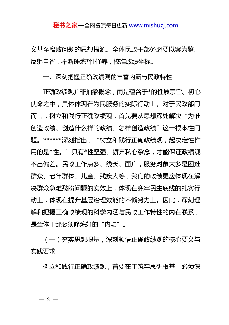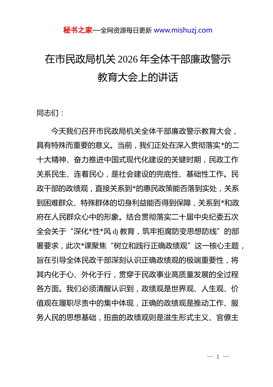 秘书之家—全网资源每日更新 www.mishuzj.com在市民政局机关 2026 年全体干部廉政警示教育大会上的讲话同志们:今天我们召开市民政局机关全体干部廉政警示教育大会,具有特殊而重要的意义。当前,我们正处在深入贯彻落实*的二十大精神、奋力推进中国式现代化建设的关键时期,民政工作关系民生、连着民心,是社会建设的兜底性、基础性工作。民政干部的政绩观,直接关系到*的惠民政策能否落到实处,关系到困难群众、特殊群体的切身利益能否得到保障,关系到*和政府在人民群众心中的形象。结合贯彻落实二十届中央纪委五次全会关于“深化*性*风 dj 教育,筑牢拒腐防变思想防线”的部署要求,此次*课聚焦“树立和践行正确政绩观”这一核心主题,旨在引导全体民政干部深刻认识正确政绩观的极端重要性,将其内化于心、外化于行,贯穿于民政事业高质量发展的全过程各方面。我们必须清醒认识到,政绩观是世界观、人生观、价值观在履职尽责中的集中体现,正确的政绩观是推动工作、服务人民的思想基础,扭曲的政绩观则是滋生形式主义、官僚主— 1 —秘书之家—全网资源每日更新 www.mishuzj.com义甚至腐败问题的思想根源。全体民政干部务必要以案为鉴、反躬自省,不断锤炼*性修养,校准政绩坐标。一、深刻把握正确政绩观的丰富内涵与民政特性正确政绩观并非抽象概念,而是蕴含于*的性质宗旨、初心使命之中,具体体现在为民服务的实际行动上。对于民政部门而言,树立和践行正确政绩观,首先要从思想深处解决“为谁创造政绩、创造什么样的政绩、怎样创造政绩”这一根本性问题。******深刻指出,“树立和践行正确政绩观,起决定性作用的是*性。”只有*性坚强、摒弃私心杂念,才能保证政绩观不出偏差。民政工作点多、线长、面广,服务对象大多是困难群众、老年群体、儿童、残疾人等,我们的政绩更应体现在解决群众急难愁盼问题的实效上,体现在兜牢民生底线的扎实行动上,体现在提升基层治理效能的不懈努力上。因此,深刻理解和把握正确政绩观的科学内涵与民政工作特性的内在联系,是全体干部必须修炼好的“内功”。(一)夯实思想根基,深刻领悟正确政绩观的核心要义与实践要求树立和践行正确政绩观,首要在于筑牢思想根基。必须深— 2 —秘书之家—全网资源每日更新 www.mishuzj.com入学习领会**************思想中关于政绩观的重要论述,掌握其精神实质。要深刻认识到,为民造福是最大政绩。******强调,“共产*人必须牢记,为民造福是最大政绩。”这要求我们始终把人民放在心中最高位置,把实现好、维护好、发展好最广大人民根本利益作为一切工作的出发点和落脚点。对于民政工作而言,这意味着我们的政策制定、项目实施、服务供给,都必须以群众需求为导向,以群众满意为标准。要准确理解高质量发展与正确政绩观的关系。推动民政事业高质量发展,本身就需要科学的政绩观来引领。不能简单以建了多少项目、投入了多少资金作为衡量标准,而要更加注重发展的质量和效益,注重政策措施的可持续性、制度建设的系统性、服务供给的精准性。例如,在养老服务领域,不仅要看新增床位数,更要看服务质量、看老年人及其家庭的获得感。要把握显绩与潜绩的辩证统一。民政工作很多是打基础、利长远的工作,如基层政权建设、社区治理、地名文化建设等,短期内可能不易见到显著成效,但却是国家治理体系和治理能力现代化的重要基石。我们必须有“功成不必在我、功成必定有我”的境界和担当,甘于做铺垫性的工作,甘于抓未成之事。要坚决反对和纠治错误政绩观。形式主义、官僚主义是错误政绩观的典型表现。在民政领域,要警惕数据造假、形象工程、痕迹管理过度等问题,— 3 —秘书之家—全网资源每日更新 www.mishuzj.com坚决防止因追求表面政绩而加重基层负担、损害群众利益。通过持续不断的思想淬炼,使正确政绩观真正融入血脉、植入灵魂。(二)站稳人民立场,始终坚守民政工作为民爱民的核心价值取向民政部门是人民政府联系服务群众的重要桥梁纽带,人民立场是我们必须坚守的根本政治立场。正确的政绩观,源于深厚的人民情怀。必须时刻牢记“民政为民、民政爱民”的工作理念,将其作为检验一切...