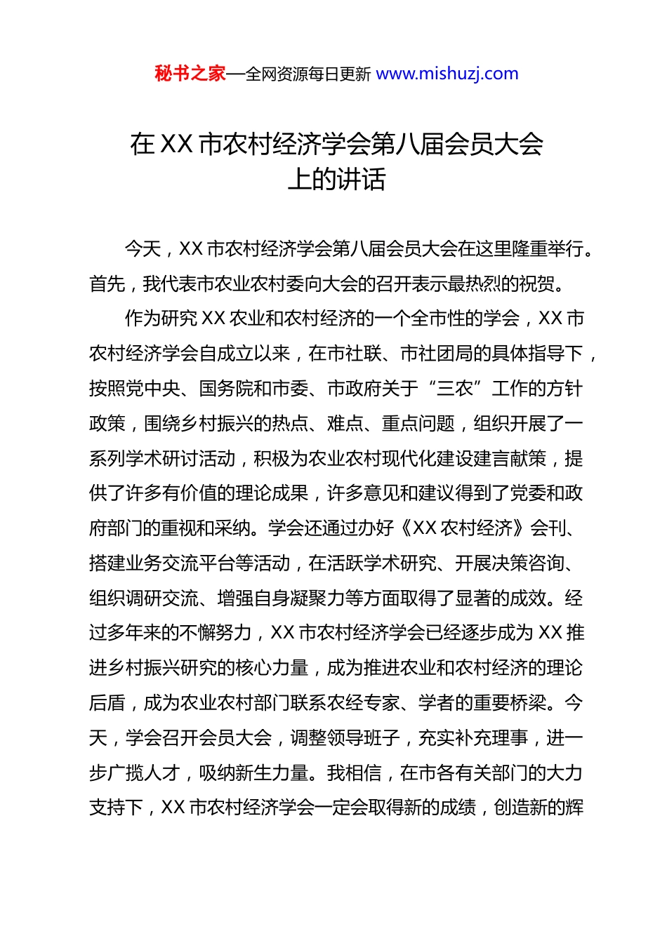 秘书之家—全网资源每日更新 www.mishuzj.com在 XX 市农村经济学会第八届会员大会上的讲话今天,XX 市农村经济学会第八届会员大会在这里隆重举行。首先,我代表市农业农村委向大会的召开表示最热烈的祝贺。作为研究 XX 农业和农村经济的一个全市性的学会,XX 市农村经济学会自成立以来,在市社联、市社团局的具体指导下,按照党中央、国务院和市委、市政府关于“三农”工作的方针政策,围绕乡村振兴的热点、难点、重点问题,组织开展了一系列学术研讨活动,积极为农业农村现代化建设建言献策,提供了许多有价值的理论成果,许多意见和建议得到了党委和政府部门的重视和采纳。学会还通过办好《XX 农村经济》会刊、搭建业务交流平台等活动,在活跃学术研究、开展决策咨询、组织调研交流、增强自身凝聚力等方面取得了显著的成效。经过多年来的不懈努力,XX 市农村经济学会已经逐步成为 XX 推进乡村振兴研究的核心力量,成为推进农业和农村经济的理论后盾,成为农业农村部门联系农经专家、学者的重要桥梁。今天,学会召开会员大会,调整领导班子,充实补充理事,进一步广揽人才,吸纳新生力量。我相信,在市各有关部门的大力支持下,XX 市农村经济学会一定会取得新的成绩,创造新的辉秘书之家—全网资源每日更新 www.mishuzj.com煌。近年来,按照中央农办、农业农村部的总体部署,在市委市政府的正确领导下,XX 认真贯彻落实中央一号文件精神,学习运用“千万工程”经验,持续彰显都市乡村价值,不断提升农民群众的幸福感和满意度,取得了不少成绩和亮点。一是加快发展农业新质生产力。积极推动农业科技创新。聚焦特色种源、农业生物制造、设施农业等新赛道,深化农业科技体制机制改革,推动科技创新和产业创新深度融合。大力发展现代设施农业。推进 12 个现代设施农业片区建设,着力推动一批装备先进、智能调控、高质高效、具有自主可控核心技术的现代设施农业项目落地。吸引社会资源振兴乡村产业。围绕营造“三农”领域一流营商环境,开展各类投资促进活动,推动要素向重点项目、重点片区聚焦,着力引入农业头部企业的总部、研发中心以及产业链链主企业。二是建设宜居宜业和美乡村。迭代升级乡村建设模式。“十四五”期间持续推进乡村振兴示范村和美丽乡村示范村建设,分批推进部、市级“五好两宜”和美乡村建设,探索公共服务设施和场所综合利用模式,积极构建乡村社区生活圈。优化提升农村人居环境。将美丽庭院(小三园)建设纳入市委民心工程和市政府为民办实事项目,“十四五”期间建成乡村美秘书之家—全网资源每日更新 www.mishuzj.com丽庭院 52 万户,健全完善农村人居环境长效管护机制,探索建立农村综合服务新模式。三是多措并举促进农民持续增收。发展新型农村集体经济扎实推进“闲置集体资产动态清零、确权登记颁证、闲置农房盘活、综合服务功能整合、集体经济组织项目承接、税务规范”等 6 个行动计划,聚力发展“服务经济”“合作经济”。持续推动农村产权流转公开交易,不断健全农村集体资产价值发现机制,截至 2025 年 10 月底,通过农交所公开交易实现金额 199.64 亿元,同比增长 125.6%。形成乡村社会治理合力。在全市 91 个街镇乡 1185 个村开展乡村治理“积分制”实践,确保在村庄形态完整,有条件的镇村实现全覆盖。总体上看,通过努力,XX 乡村振兴取得了一系列阶段性成果,农村环境面貌得到了新提升,农业提质增效取得了新突破,农民长效增收实现了新提高。XX 乡村全面振兴发展指数连续三年保持全国第一,都市现代农业在全国 36 个大中城市测评中连续三次排名第一。这些成绩的取得,也是与各位会员的努力分不开的。在看到这些成绩的同时,我们也深刻感受到,XX 乡村振兴工作与中央的要求,与农民群众期盼相比还存在差距,如农业科技创新的“核爆点”还较少,涉农高科技企业的市场竞争力秘书之家—全网资源每日更新 www.mishuzj.com还不强;农村集体资产的经营能级还不高,收益分配机制还有待完善,农民持续增收的机制有待健全;厚植乡村文化肌理的成效还不够明显;沪郊村庄布局仍需优化,乡村从点上建设到面上拓展的成...