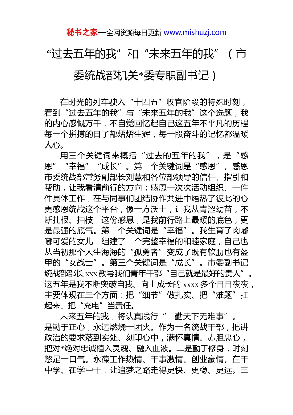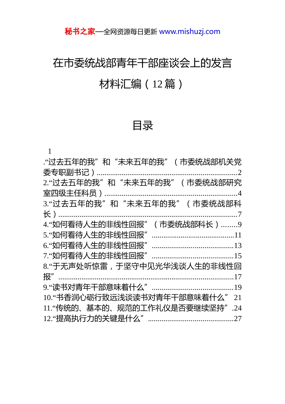 秘书之家—全网资源每日更新 www.mishuzj.com在市委统战部青年干部座谈会上的发言材料汇编(12 篇)目录1.“过去五年的我”和“未来五年的我”(市委统战部机关党委专职副书记).........................................................................22.“过去五年的我”和“未来五年的我”(市委统战部研究室四级主任科员).....................................................................43.“过去五年的我”和“未来五年的我”(市委统战部科长).............................................................................................74.“如何看待人生的非线性回报”(市委统战部科长)........95.“如何看待人生的非线性回报”...........................................116.“如何看待人生的非线性回报”..........................................137.“如何看待人生的非线性回报”..........................................158.“于无声处听惊雷,于坚守中见光华浅谈人生的非线性回报”...........................................................................................179.“读书对青年干部意味着什么”..........................................1910.“书香润心砺行致远浅谈读书对青年干部意味着什么” 2111.“传统的、基本的、规范的工作礼仪是否要继续坚持”.2412.“提高执行力的关键是什么”............................................27秘书之家—全网资源每日更新 www.mishuzj.com“过去五年的我”和“未来五年的我”(市委统战部机关*委专职副书记)在时光的列车驶入“十四五”收官阶段的特殊时刻,看到“过去五年的我”与“未来五年的我”这个选题,我的内心感慨万千,不自觉回忆起自己这五年不平凡的历程每一个拼搏的日子都熠熠生辉,每一段奋斗的记忆都温暖人心。用三个关键词来概括“过去的五年的我”,是“感恩”“幸福”“成长”。第一个关键词是“感恩”。感恩市委统战部常务副部长刘慧和各位部领导的信任、指引和帮助,让我看清前行的方向;感恩一次次活动组织、一件件具体工作,在与同事们团结协作共进中焐热了彼此的心更感恩统战这个平台,像一方沃土,让我从青涩幼苗,不断扎根、抽枝,这份感恩,是我前行路上最暖的底色,更是最强的底气。第二个关键词是“幸福”。我生育了肉嘟嘟可爱的女儿,组建了一个完整幸福的和睦家庭,自己也从当初那个人生海海的“孤勇者”变成了既有软肋也有盔甲的“女战士”。第三个关键词是“成长”。市委副书记统战部部长 xxx 教导我们青年干部“自己就是最好的贵人”。这五年是我不断突破自我、向上成长的 xxxx 多个日日夜夜,主要体现在三个方面:把“细节”做扎实、把“难题”扛起来、把“充电”当责任。未来五年的我,将认真践行“一勤天下无难事”。一是勤于正心,永远燃烧一团火。作为一名统战干部,把讲政治的要求落到实处、刻印心中,满怀真情、赤胆忠心,把对*绝对忠诚植入灵魂、融入血液。二是勤于修身,时刻憋足一口气。永葆工作热情、干事激情、创业豪情。在干中学、在学中干,让追梦之路走得更快、更稳、更远。三秘书之家—全网资源每日更新 www.mishuzj.com是勤于奋斗,始终保持一股劲。要有干劲,拿出高效率、快节奏、扎实干、有作为的精神状态,发扬钉钉子精神,在每一项工作中倾己所有、力求最优。行之苟有恒,久久自芬芳。未来五年的我将继续为 xx统战事业贡献自己的一份光和热。“过去五年的我”和“未来五年的我”(市委统战部研究室四级主任科员)回望来时路,从初入职场的迷茫到逐渐明确方向,其间既有摸索中的曲折,也有成长中的喜悦。对比五年来的变化,我实现了从“被动适应”到“主动求索”的转变。我想用三句话来概括过去五年的历程。第一句话,安逸是成长最大的陷阱,主动求索才能实现价值突破。初到乡镇时,我对工作的理解停留在被动执行层面。尽管很快适应了岗位要求并能较好完成任务,但我意识到这种按部就班的工作模式正让我陷入舒适区。当我开始反问“工作的深层价值何在”时,决心从“被动接受”转向“主动求索”。这一转变...