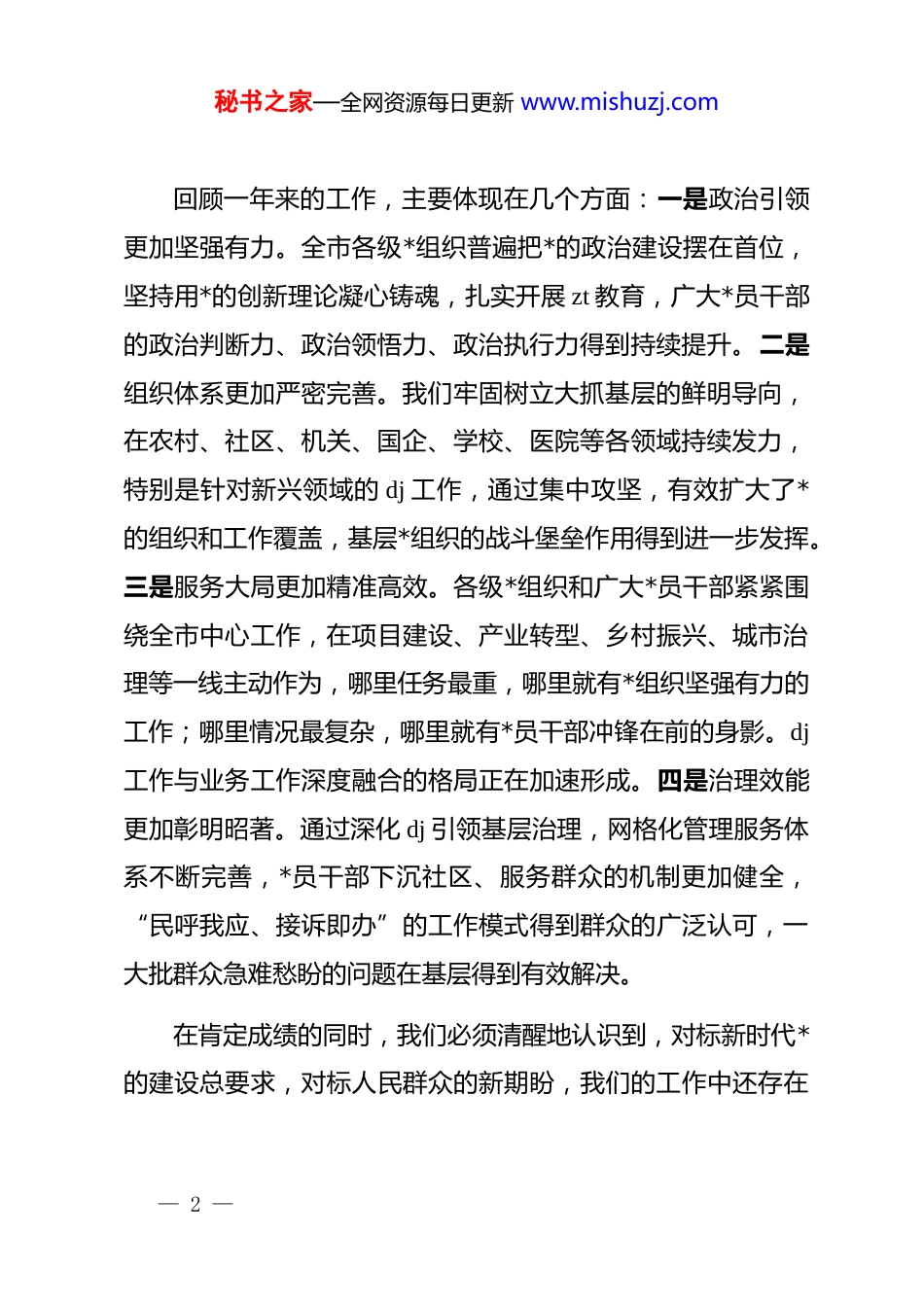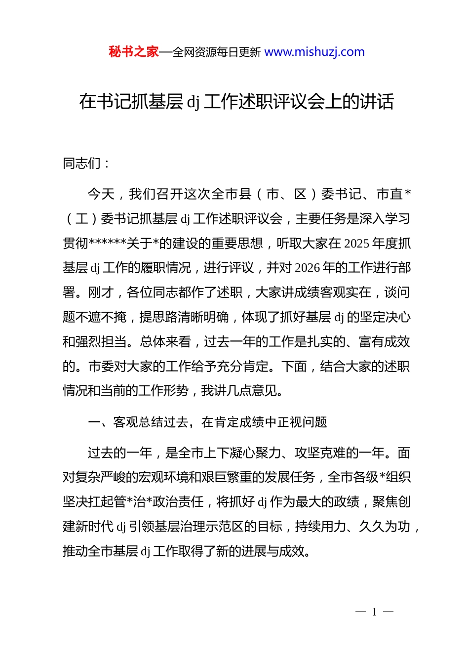 秘书之家—全网资源每日更新 www.mishuzj.com在书记抓基层 dj 工作述职评议会上的讲话同志们:今天,我们召开这次全市县(市、区)委书记、市直 *(工)委书记抓基层 dj 工作述职评议会,主要任务是深入学习贯彻******关于*的建设的重要思想,听取大家在 2025 年度抓基层 dj 工作的履职情况,进行评议,并对 2026 年的工作进行部署。刚才,各位同志都作了述职,大家讲成绩客观实在,谈问题不遮不掩,提思路清晰明确,体现了抓好基层 dj 的坚定决心和强烈担当。总体来看,过去一年的工作是扎实的、富有成效的。市委对大家的工作给予充分肯定。下面,结合大家的述职情况和当前的工作形势,我讲几点意见。一、客观总结过去,在肯定成绩中正视问题过去的一年,是全市上下凝心聚力、攻坚克难的一年。面对复杂严峻的宏观环境和艰巨繁重的发展任务,全市各级*组织坚决扛起管*治*政治责任,将抓好 dj 作为最大的政绩,聚焦创建新时代 dj 引领基层治理示范区的目标,持续用力、久久为功,推动全市基层 dj 工作取得了新的进展与成效。— 1 —秘书之家—全网资源每日更新 www.mishuzj.com回顾一年来的工作,主要体现在几个方面:一是政治引领更加坚强有力。全市各级*组织普遍把*的政治建设摆在首位,坚持用*的创新理论凝心铸魂,扎实开展 zt 教育,广大*员干部的政治判断力、政治领悟力、政治执行力得到持续提升。二是组织体系更加严密完善。我们牢固树立大抓基层的鲜明导向,在农村、社区、机关、国企、学校、医院等各领域持续发力,特别是针对新兴领域的 dj 工作,通过集中攻坚,有效扩大了*的组织和工作覆盖,基层*组织的战斗堡垒作用得到进一步发挥。三是服务大局更加精准高效。各级*组织和广大*员干部紧紧围绕全市中心工作,在项目建设、产业转型、乡村振兴、城市治理等一线主动作为,哪里任务最重,哪里就有*组织坚强有力的工作;哪里情况最复杂,哪里就有*员干部冲锋在前的身影。dj工作与业务工作深度融合的格局正在加速形成。四是治理效能更加彰明昭著。通过深化 dj 引领基层治理,网格化管理服务体系不断完善,*员干部下沉社区、服务群众的机制更加健全,“民呼我应、接诉即办”的工作模式得到群众的广泛认可,一大批群众急难愁盼的问题在基层得到有效解决。在肯定成绩的同时,我们必须清醒地认识到,对标新时代*的建设总要求,对标人民群众的新期盼,我们的工作中还存在— 2 —秘书之家—全网资源每日更新 www.mishuzj.com一些不容忽视的差距和短板。比如,一些基层*组织政治功能发挥还不够充分,理论学习存在形式化、表面化的问题;部分领域 dj 工作的基础还不够牢固,软弱涣散*组织的整顿成果需要持续巩固;dj 与中心工作“两张皮”的现象在个别单位依然存在,dj 引领发展的实际效果有待提升;少数*员干部先锋模范作用发挥不明显,服务群众的能力和意识还有待加强;全面从严治*压力传导存在层层递减的现象,对*员的日常教育管理监督还不够严格。对于这些问题,我们必须高度重视,以刀刃向内的勇气,采取有力有效的措施,在后续工作中切实加以改进和提升。二、深刻把握当前,在时代变局中明确方向2026 年,是实施“十五五”规划的开局之年,也是我市全面推进“**发展战略”的关键之年。做好今年的基层 dj 工作,责任比以往更重,要求比以往更高。我们必须胸怀“国之大者”,心系“市之大计”,深刻认识到抓好基层 dj 的极端重要性。基层*组织是*的肌体的“神经末梢”,是贯彻落实*中央决策部署的“最后一公里”。只有基础牢固,地动山摇才能岿然不动。当前,我们正处在转型发展的关键时期,各种风险挑战— 3 —秘书之家—全网资源每日更新 www.mishuzj.com交织叠加,改革发展稳定的任务异常繁重。越是如此,越要发挥好基层*组织的战斗堡垒作用和*员的先锋模范作用。必须清醒地看到,任何一项重大战略的实施,任何一个重大项目的落地,任何一项民生实事的办理,最终都要依靠千千万万个基层*组织去组织、去动员、去落实。基层 dj 抓实了,就是生产力;抓强了,就是竞争力;抓细了,就是凝聚力。我们必须深刻领会,抓基层 dj 是实现...
