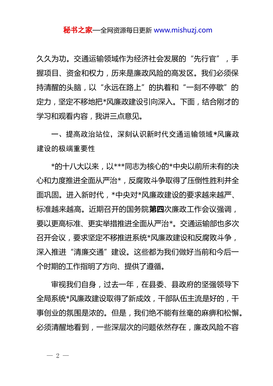 秘书之家—全网资源每日更新 www.mishuzj.com在县交通运输局 2026 年*风廉政教育开年第一课上的讲话同志们:大家好!新年伊始,万象更新。今天,我们在这里召开2026 年*风廉政教育开年第一课,主要任务是深入学习贯彻中央、省、市、县纪委全会精神,认真落实全国交通运输工作会议关于全面从严治*的最新部署通过观看警示教育专题片,以案为鉴、以案明纪,为全年*风廉政建设和反腐败工作定基调、明方向、鼓干劲。刚才,我们传达学习了上级有关会议精神,并集中观看了警示教育片《一步不停歇半步不退让》。片中人、片中事,教训惨痛、发人深省,为我们全体干部职工敲响了新年的第一声警钟。2026 年是“十五五”规划开局起步的关键之年,也是我县交通运输事业迈向高质量发展新征程的重要一年。开局关乎全局,起步决定后势。在这样的关键节点,把*风廉政教育作为“开年第一课”,就是要向全局上下释放一个强烈信号:全面从严治*永远在路上,*风廉政建设和反腐败斗争必须常抓不懈、— 1 —秘书之家—全网资源每日更新 www.mishuzj.com久久为功。交通运输领域作为经济社会发展的“先行官”,手握项目、资金和权力,历来是廉政风险的高发区。我们必须保持清醒的头脑,以“永远在路上”的执着和“一刻不停歇”的定力,坚定不移地把*风廉政建设引向深入。下面,结合刚才的学习和观看内容,我讲三点意见。一、提高政治站位,深刻认识新时代交通运输领域*风廉政建设的极端重要性*的十八大以来,以***同志为核心的*中央以前所未有的决心和力度推进全面从严治*,反腐败斗争取得了压倒性胜利并全面巩固。进入新时代,*中央对*风廉政建设的要求越来越严、标准越来越高。近期召开的国务院第四次廉政工作会议强调,要以更高标准、更实举措推进全面从严治*。交通运输部也多次召开会议,要求坚定不移推进系统*风廉政建设和反腐败斗争,深入推进“清廉交通”建设。这些都为我们做好当前和今后一个时期的工作指明了方向、提供了遵循。审视我们自身,过去一年,在县委、县政府的坚强领导下全局系统*风廉政建设取得了新成效,干部队伍主流是好的,干事创业的氛围是浓的。但是,我们绝不能有丝毫的麻痹和松懈。必须清醒地看到,一些深层次的问题依然存在,廉政风险不容— 2 —秘书之家—全网资源每日更新 www.mishuzj.com忽视。刚才的警示教育片中,那些曾经的“身边人”沦为“片中人”,究其根源,无不是始于思想上的松懈、纪律上的松绑、行为上的失范。对照反思,我们系统中是否存在类似的问题?比如,在工程建设领域,是否存在规避招标、违规变更、虚报冒领、吃拿卡要的现象?在行政执法过程中,是否存在标准不一、滥用裁量权、以罚代管、人情执法的行为?在资金管理和使用上,是否存在程序不严、监管不力、挤占挪用的风险?这些问题,哪怕只是苗头性、倾向性的,都必须引起我们的高度警惕。权力是*和人民赋予的,只能用来为人民谋利益。交通运输工作点多、线长、面广,直接服务于经济发展和民生改善,我们手中的每一分权力、审批的每一个项目、拨付的每一笔资金,都关系到发展大局和群众切身利益。因此,全局每一位*员干部都必须站在讲政治、顾大局的高度,深刻认识到*风廉政建设不是“软指标”,而是必须扛起的“硬责任”;廉洁自律不是“个人小事”,而是必须恪守的“政治大德”。要时刻绷紧廉洁自律这根弦,常怀敬畏之心、常思贪欲之害、常修为政之德,真正做到心有所畏、言有所戒、行有所止。二、聚焦关键环节,以钉钉子精神筑牢交通运输领域拒腐— 3 —秘书之家—全网资源每日更新 www.mishuzj.com防变的坚固防线*风廉政建设必须落到实处,不能空喊口号。要坚持问题导向,紧盯交通运输领域的重点部位和关键环节,下大力气排查风险、堵塞漏洞、健全机制,一体推进不敢腐、不能腐、不想腐的体制机制建设。第一,必须在工程建设领域织密“防护网”,打造阳光工程、廉洁工程。交通工程建设领域资金密集、环节繁多,是腐败问题易发多发的重灾区。近年来,全国交通系统查处的案件中,80%以上与工程建设有关。我们必须以此为戒,拿出刮骨疗毒的勇气,对工程建设领域实施全过程、全链条的严格...