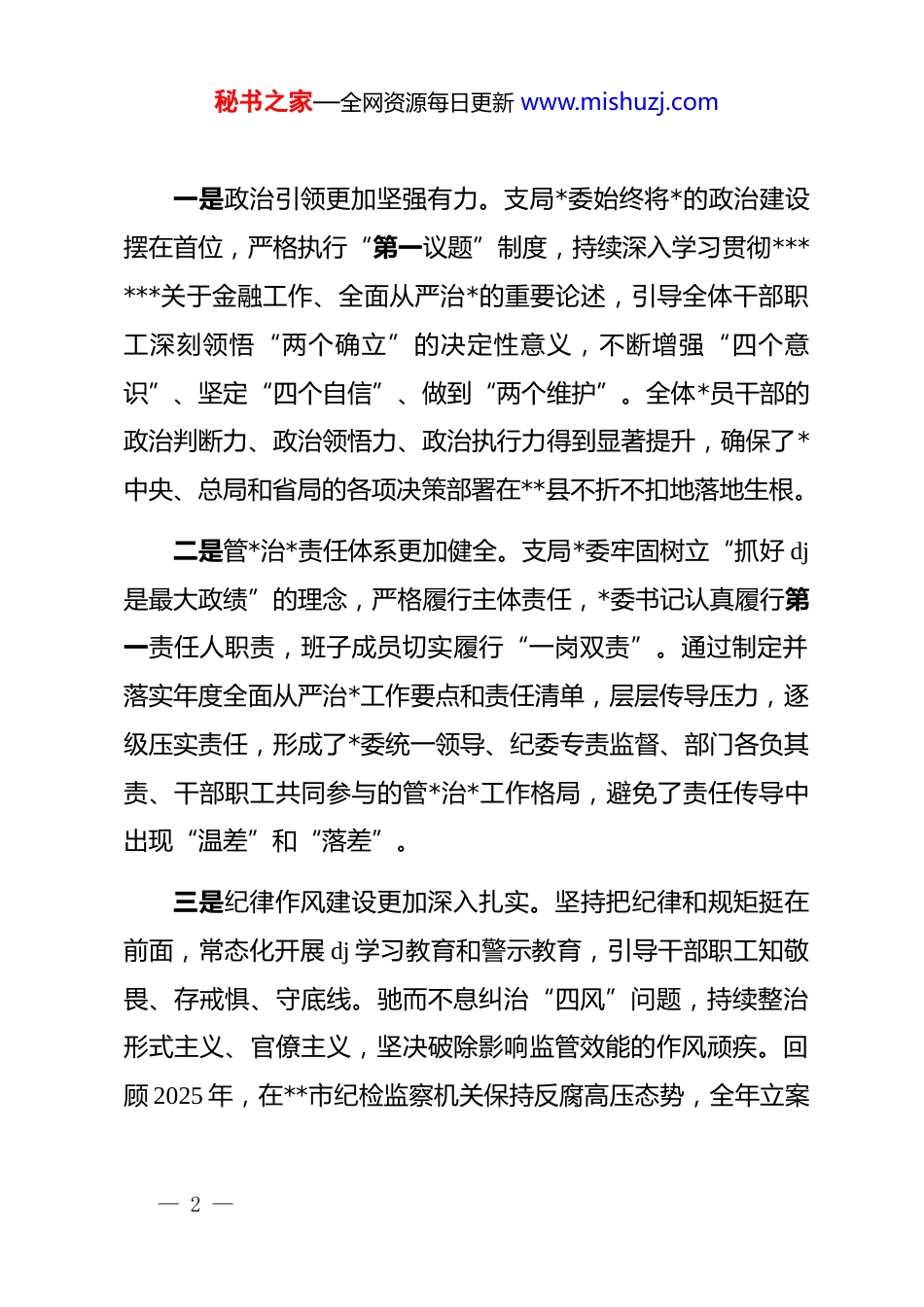 秘书之家—全网资源每日更新 www.mishuzj.com在县金融监管支局 2026 年全面从严治*工作会议上的讲话同志们:今天,我们召开支局 2026 年全面从严治*工作会议。这次会议的主要任务是,深入学习贯彻*的二十届四中全会和二十届中央纪委五次全会精神,严格落实金融监管总局机关*委和省局*委 2026 年全面从严治*工作会议的部署要求系统总结回顾支局2025 年的工作,深刻分析当前*风廉政建设和反腐败斗争面临的新形势新挑战,并对 2026 年的重点工作进行全面部署。下面,我讲几点意见。一、回顾过去,在淬炼锻造中坚定前行2025 年是全面贯彻落实*的二十大精神的关键之年,也是金融监管体制改革后,支局全面履行新职责、展现新作为的起步之年。一年来,面对复杂严峻的外部环境和艰巨繁重的监管任务,支局*委坚持以**************思想为指导,坚决扛起管*治*主体责任,将*的领导贯穿于金融监管工作的全过程、各方面,推动全面从严治*取得了新的阶段性成效。— 1 —秘书之家—全网资源每日更新 www.mishuzj.com一是政治引领更加坚强有力。支局*委始终将*的政治建设摆在首位,严格执行“第一议题”制度,持续深入学习贯彻******关于金融工作、全面从严治*的重要论述,引导全体干部职工深刻领悟“两个确立”的决定性意义,不断增强“四个意识”、坚定“四个自信”、做到“两个维护”。全体*员干部的政治判断力、政治领悟力、政治执行力得到显著提升,确保了*中央、总局和省局的各项决策部署在**县不折不扣地落地生根。二是管*治*责任体系更加健全。支局*委牢固树立“抓好 dj是最大政绩”的理念,严格履行主体责任,*委书记认真履行第一责任人职责,班子成员切实履行“一岗双责”。通过制定并落实年度全面从严治*工作要点和责任清单,层层传导压力,逐级压实责任,形成了*委统一领导、纪委专责监督、部门各负其责、干部职工共同参与的管*治*工作格局,避免了责任传导中出现“温差”和“落差”。三是纪律作风建设更加深入扎实。坚持把纪律和规矩挺在前面,常态化开展 dj 学习教育和警示教育,引导干部职工知敬畏、存戒惧、守底线。驰而不息纠治“四风”问题,持续整治形式主义、官僚主义,坚决破除影响监管效能的作风顽疾。回顾 2025 年,在**市纪检监察机关保持反腐高压态势,全年立案— 2 —秘书之家—全网资源每日更新 www.mishuzj.com审查调查数千件的背景下,支局内部始终保持了风清气正的良好氛围,未发生重大违纪违法案件。四是 dj 与业务融合发展更加紧密。坚持围绕中心、服务大局,将 dj 工作与防范化解金融风险、服务实体经济、深化金融改革等中心任务同谋划、同部署、同考核。通过设立*员先锋岗、组建攻坚突击队等方式,充分发挥基层*组织的战斗堡垒作用和*员的先锋模范作用,有效破解了监管工作中的一系列难点、堵点问题,为守住不发生区域性、系统性金融风险的底线提供了坚强组织保证。在肯定成绩的同时,也必须清醒地认识到,对照*中央的高标准严要求,对照新时代金融监管工作的职责使命,我们的工作还存在一些差距和不足。例如,个别干部的政治理论学习不够深入系统,运用*的创新理论指导实践、推动工作的能力仍有待提升;少数部门在履行“一岗双责”方面还存在上紧下松的现象,压力传导未能完全触达“神经末梢”;面对金融创新带来的新型风险和隐蔽性腐败,监管队伍的专业能力和斗争本领还需要进一步增强。对于这些问题,必须高度重视,并在今后的工作中采取有力措施,切实加以解决。二、正视当前,在风险挑战中保持清醒— 3 —秘书之家—全网资源每日更新 www.mishuzj.com2026 年,是建*105 周年,也是我国“十五五”规划的开局之年。做好今年的全面从严治*工作,意义特殊,责任重大。当前,*风廉政建设和反腐败斗争的形势依然严峻复杂,特别是在金融领域,风险与腐败问题相互交织、共生并存的特征愈发凸显。必须深刻认识我们所面临的特殊挑战。从宏观形势看,*中央纵深推进全面从严治*的决心坚如磐石。*的二十大以来,******反复强调,反腐败斗争是一场输不起也决不能输的重大政治斗争。金融领域作为权力集中、资金密集、资源富集的行业,历来...